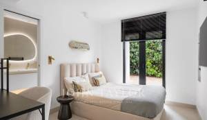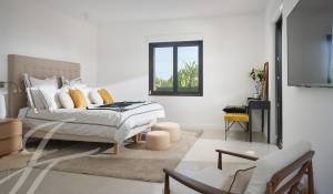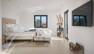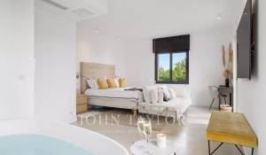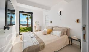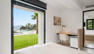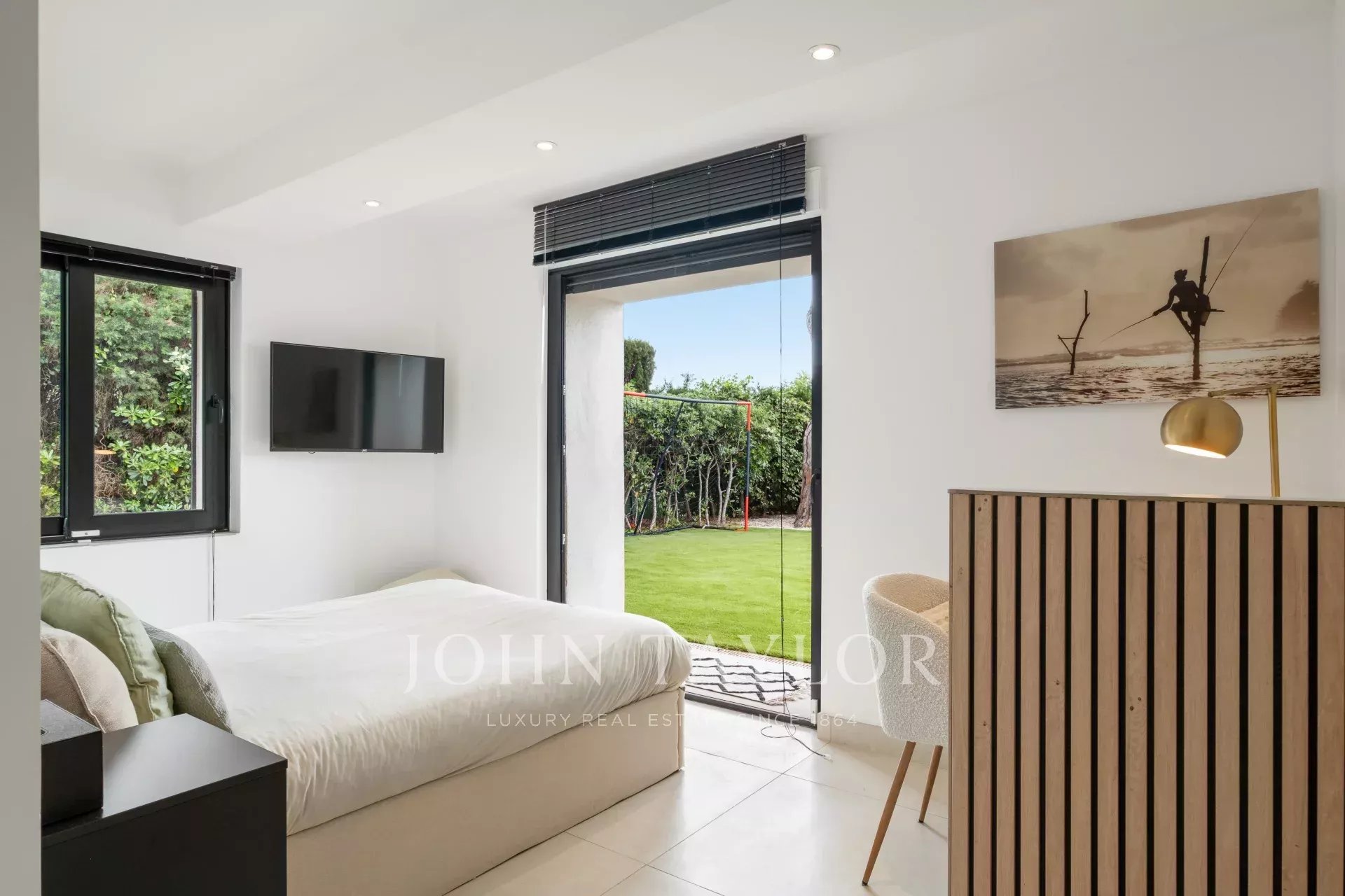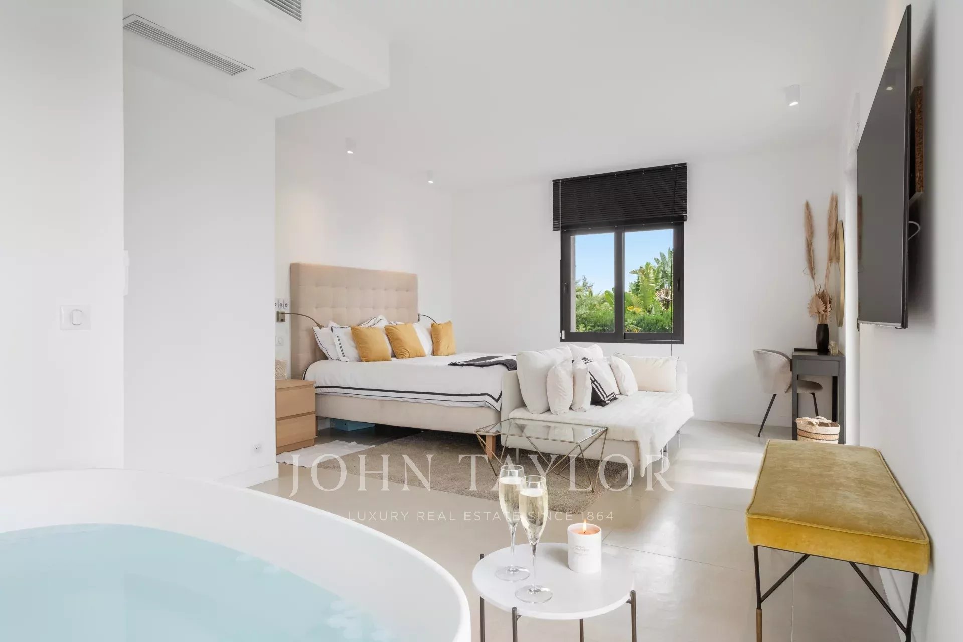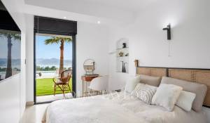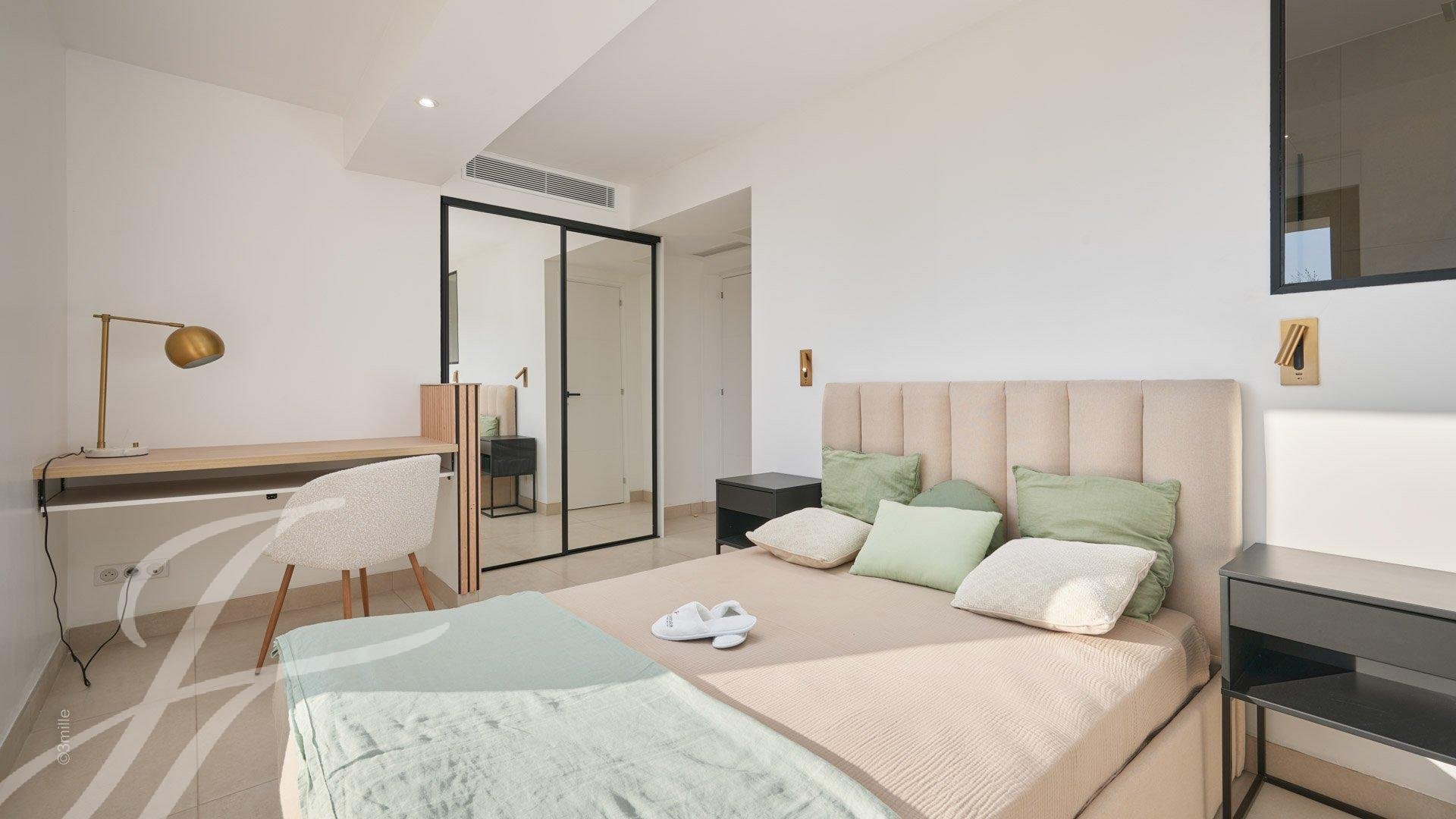 Schlafzimmer (Doppelbett) TV öffnet sich auf den Garten und den Pool mit Meerblick.