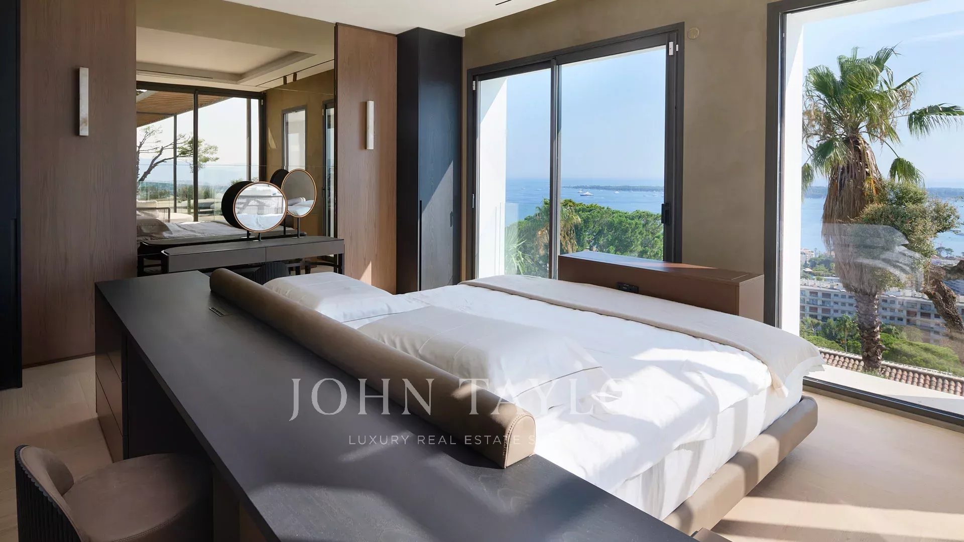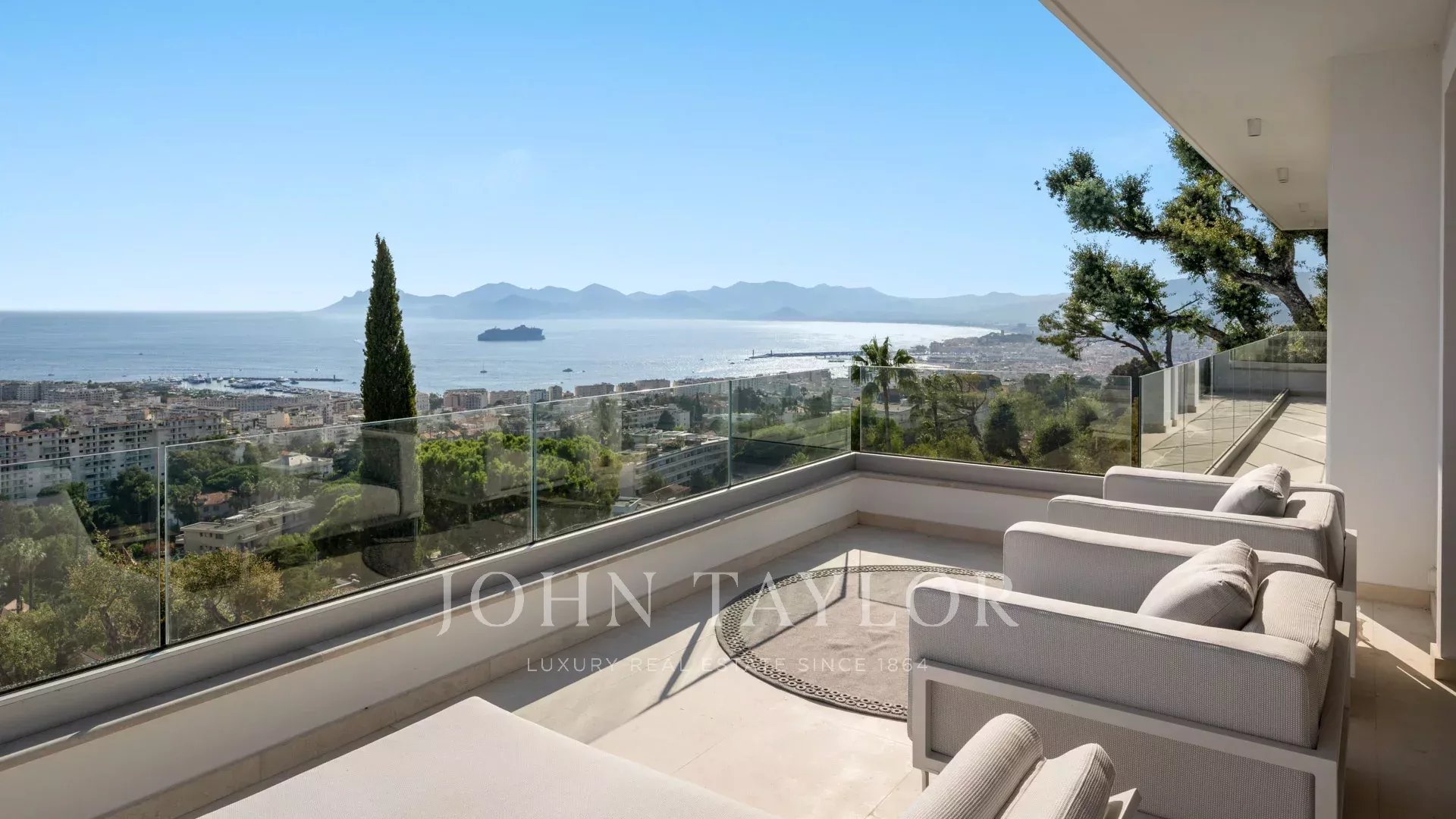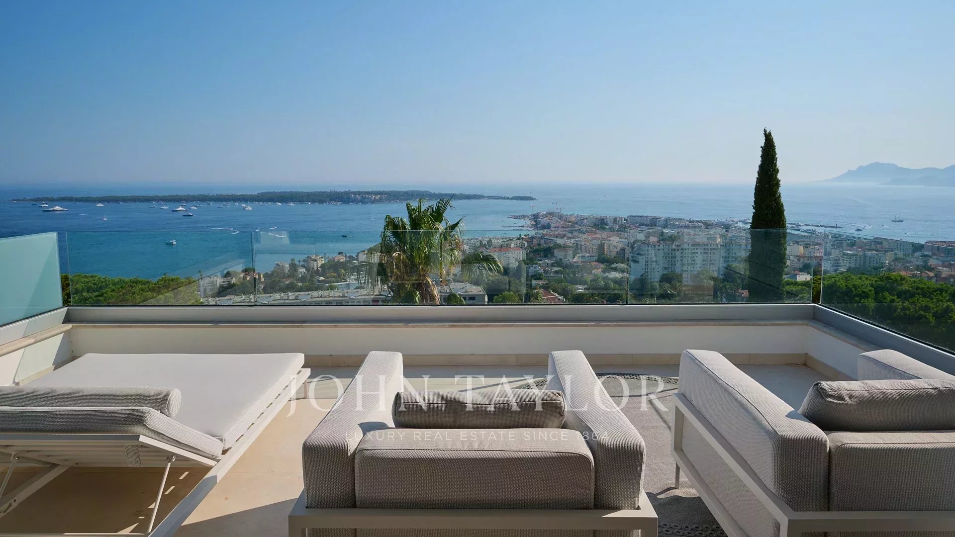 Mit ihren 550 m² Wohnfläche enthüllt die Villa eine anspruchsvolle Dekoration und bietet einen atemberaubenden Blick auf die Bucht von Cannes und die Îles de Lérins, wodurch atemberaubende Panoramen garantiert werden.