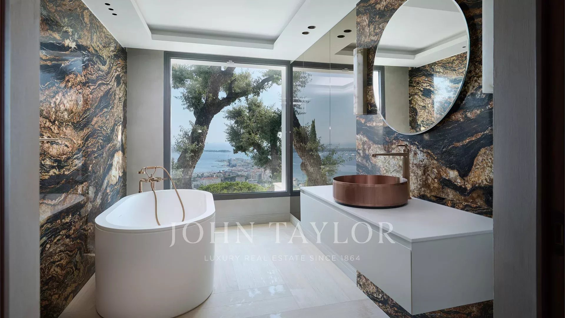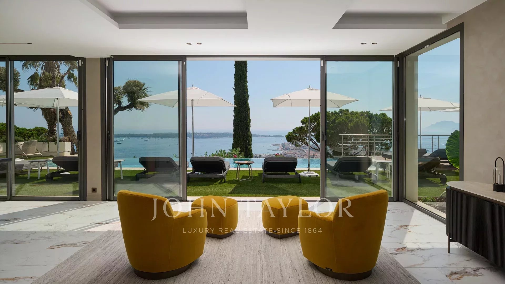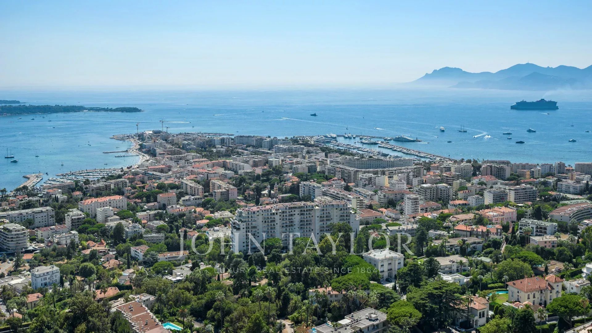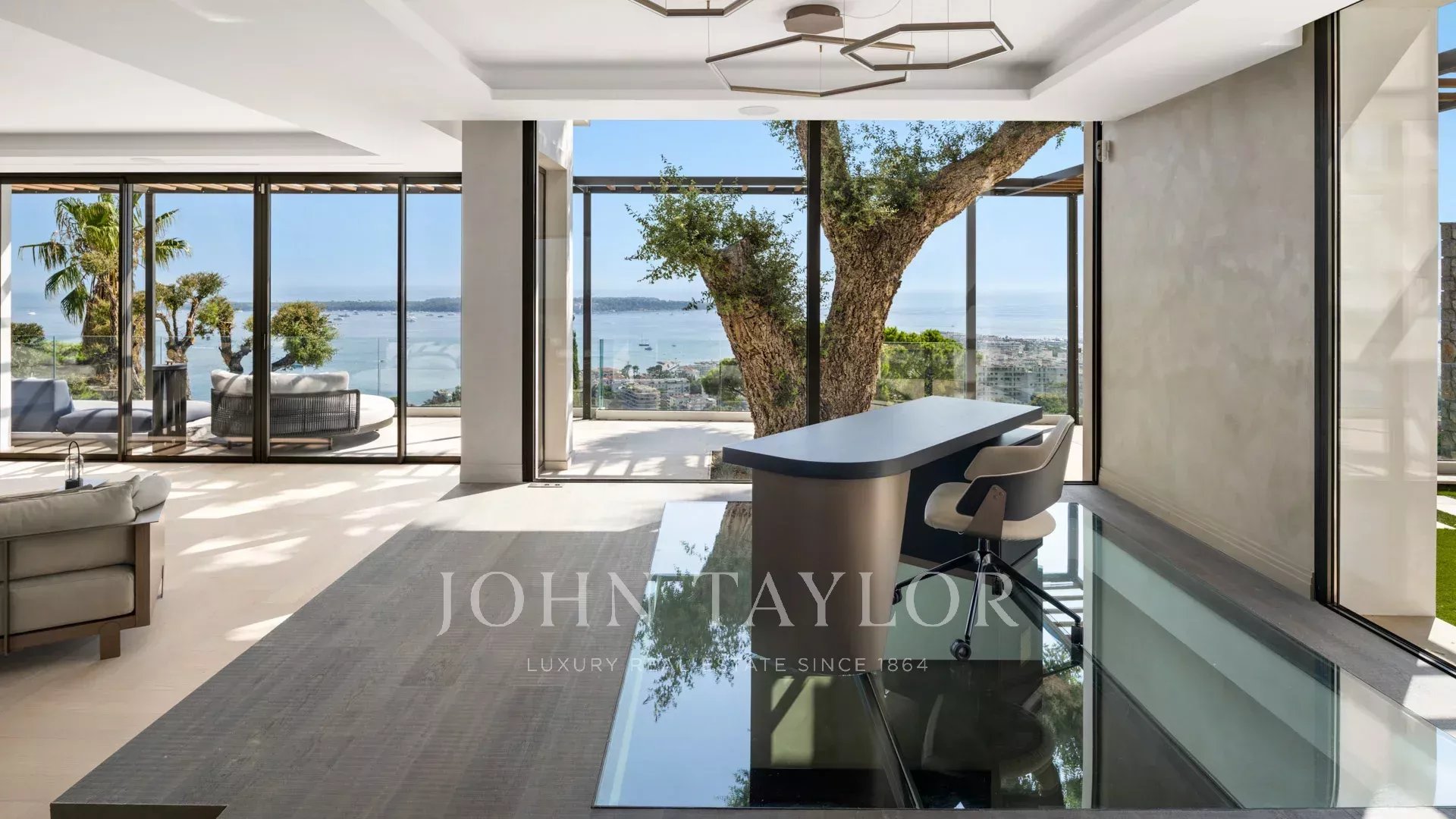 Mit ihren 550 m² Wohnfläche enthüllt die Villa eine anspruchsvolle Dekoration und bietet einen atemberaubenden Blick auf die Bucht von Cannes und die Îles de Lérins, wodurch atemberaubende Panoramen garantiert werden.