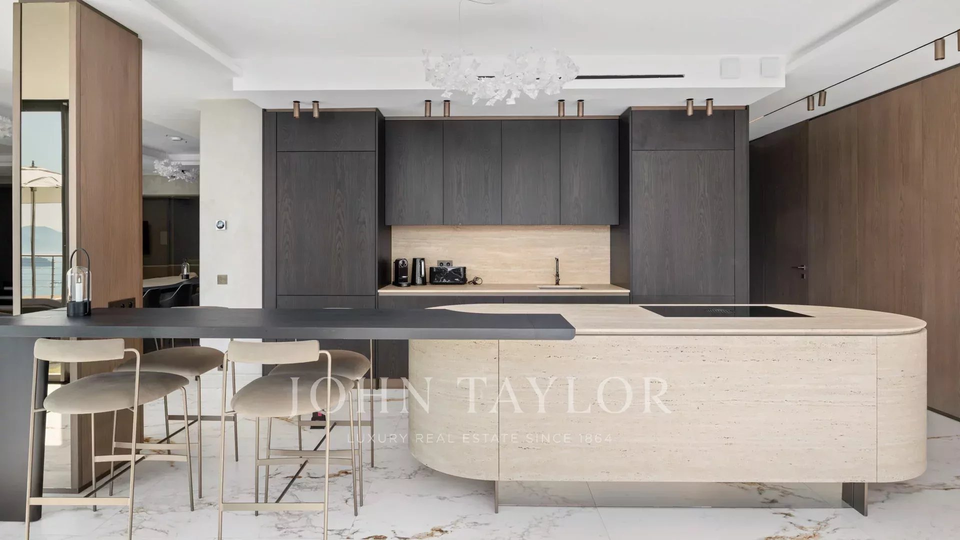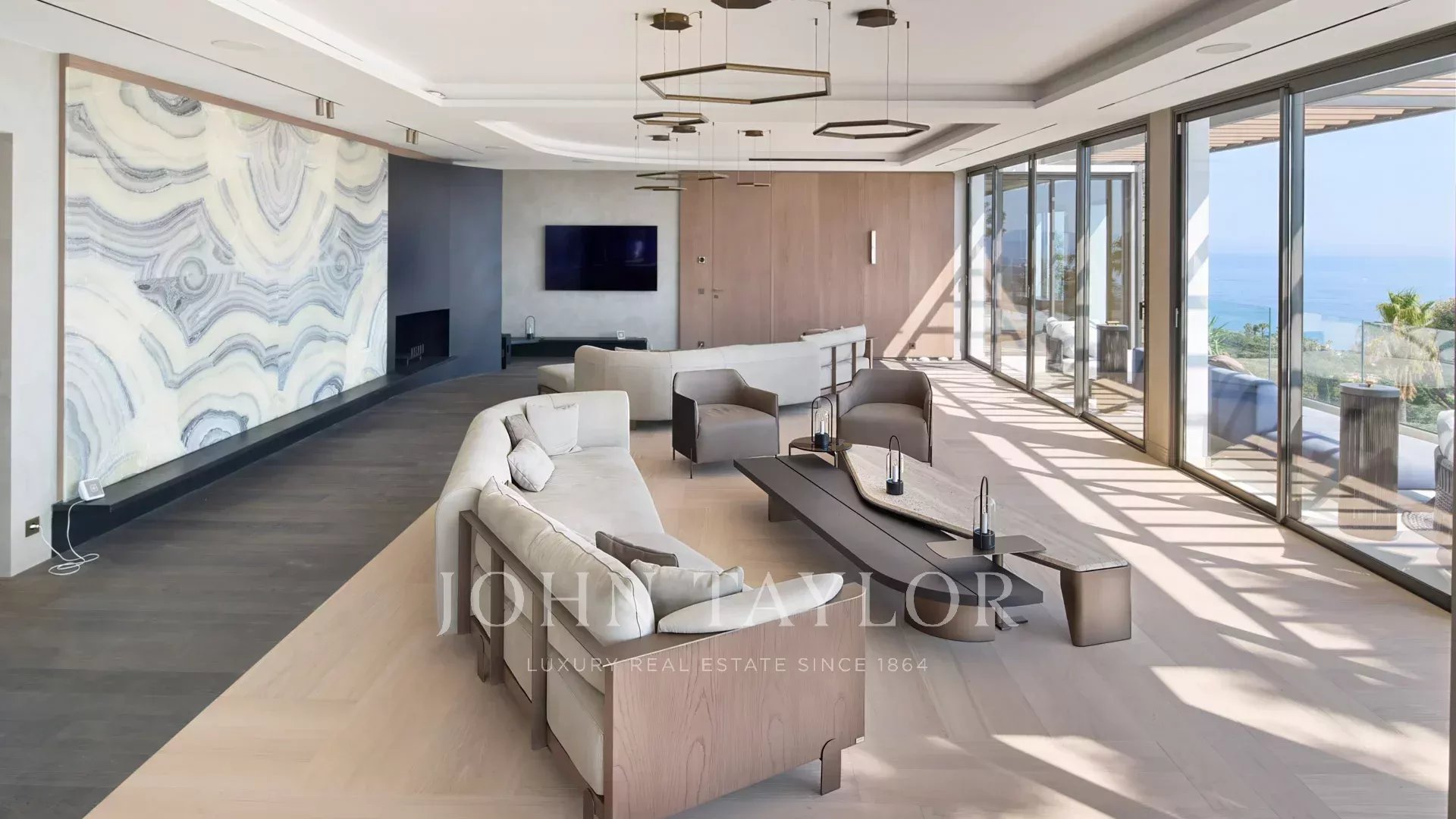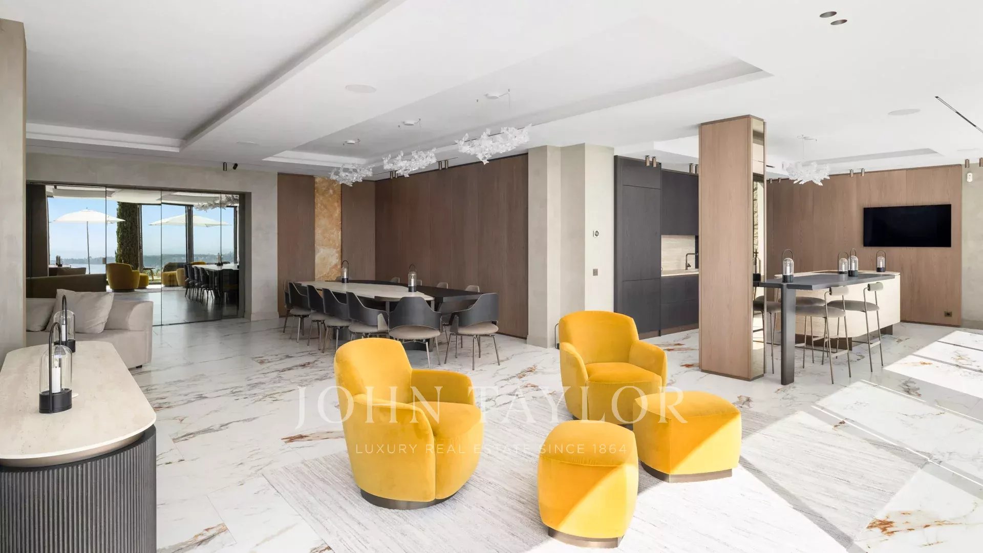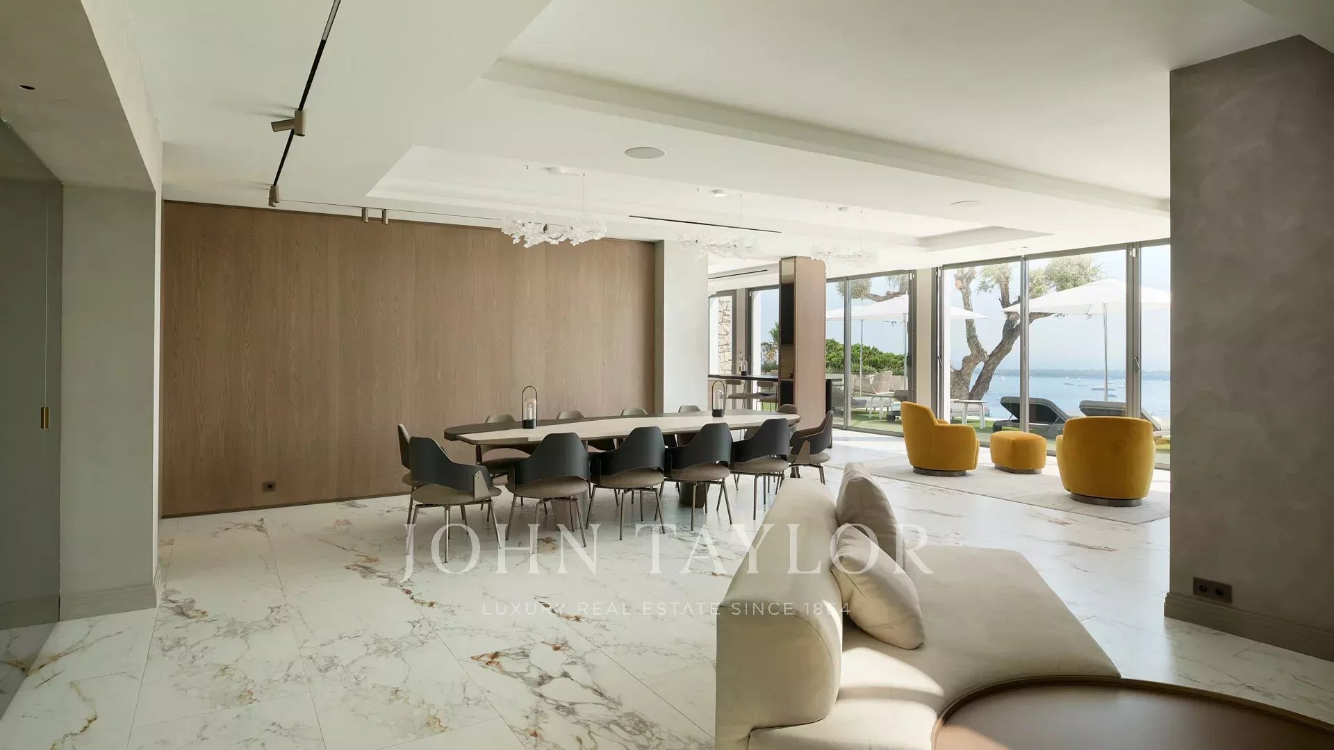 Eine Eingangshalle, die sich zu einem großen Wohn- und Esszimmer öffnet, ein Büro mit Terrasse, die einen Blick auf das Meer bietet.