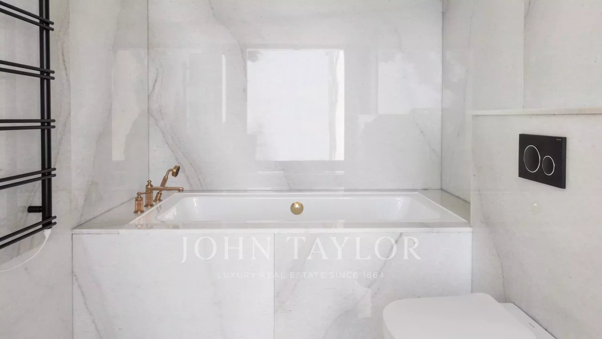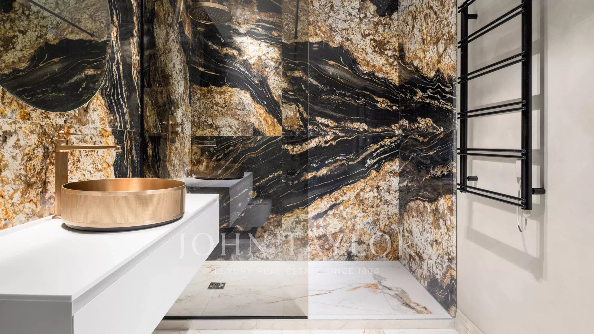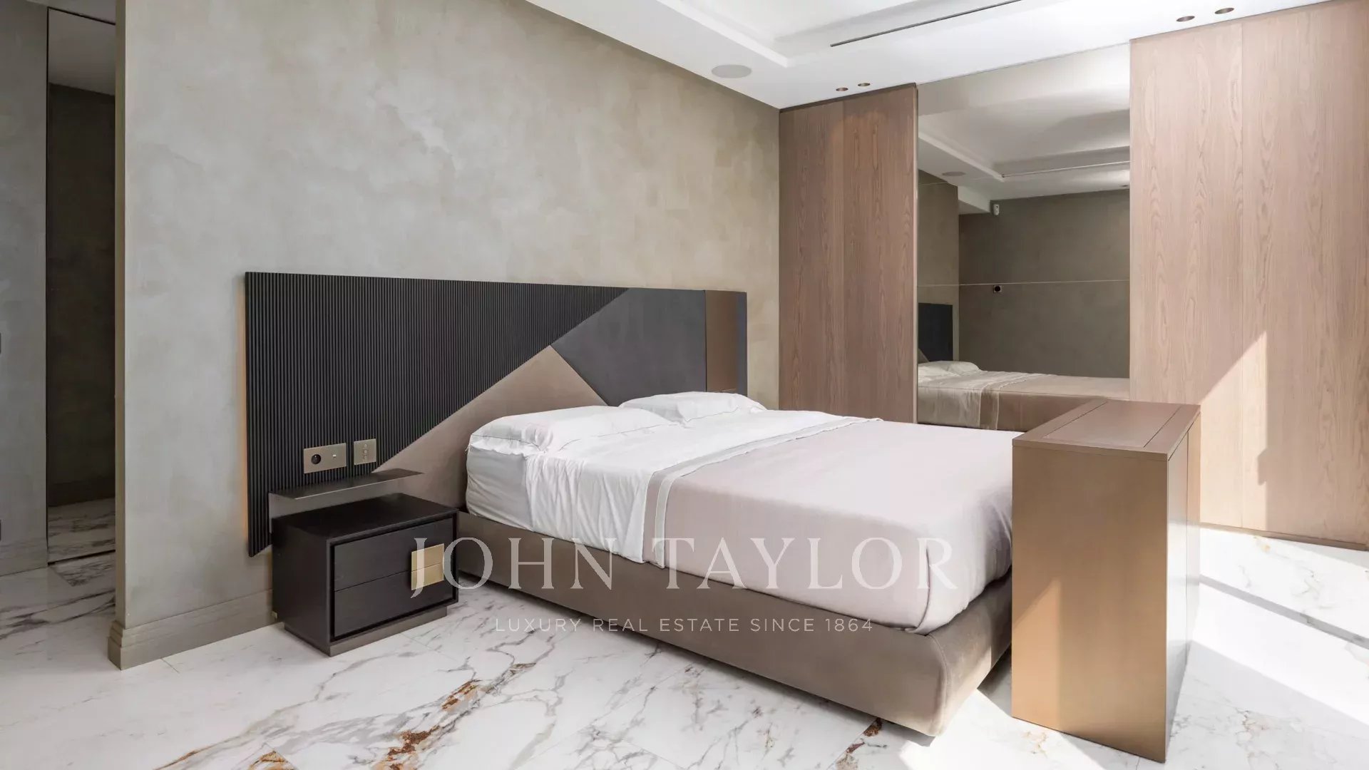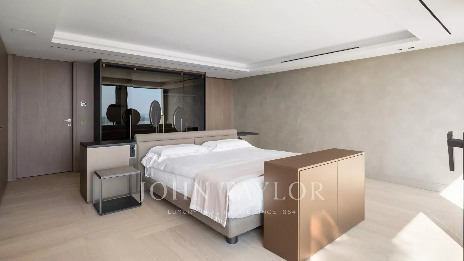 Eine ca. 85m² große Mastersuite (Doppelbett 200cm) mit einem Wohnzimmer, einer Bar, die sich zu einer Terrasse hin öffnet, Ankleidezimmer und Duschbad.