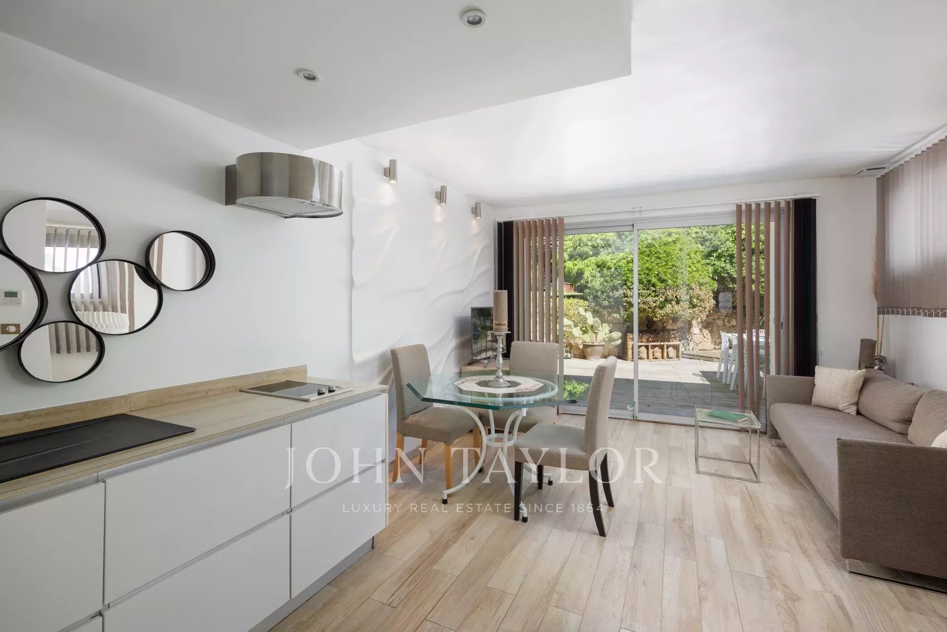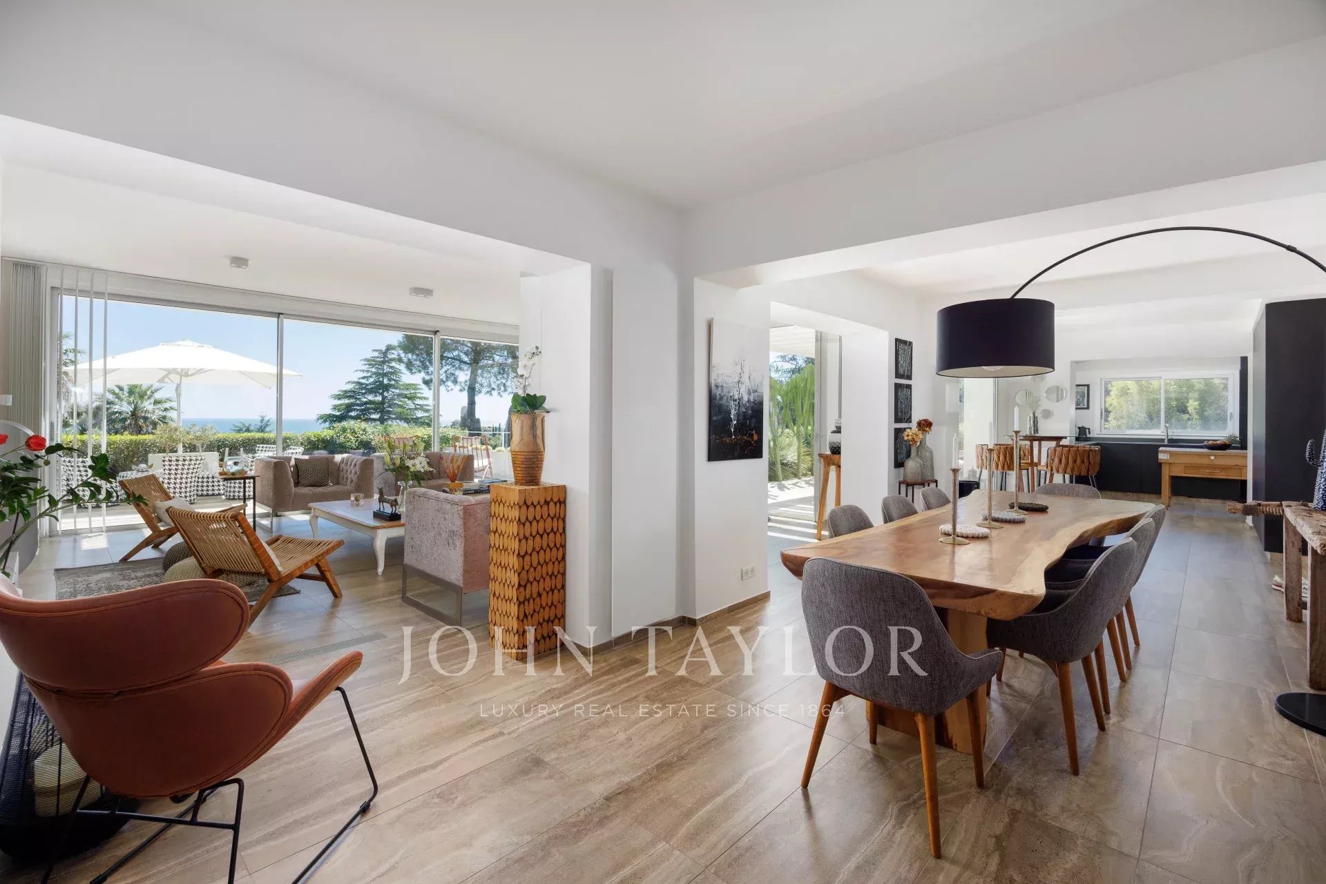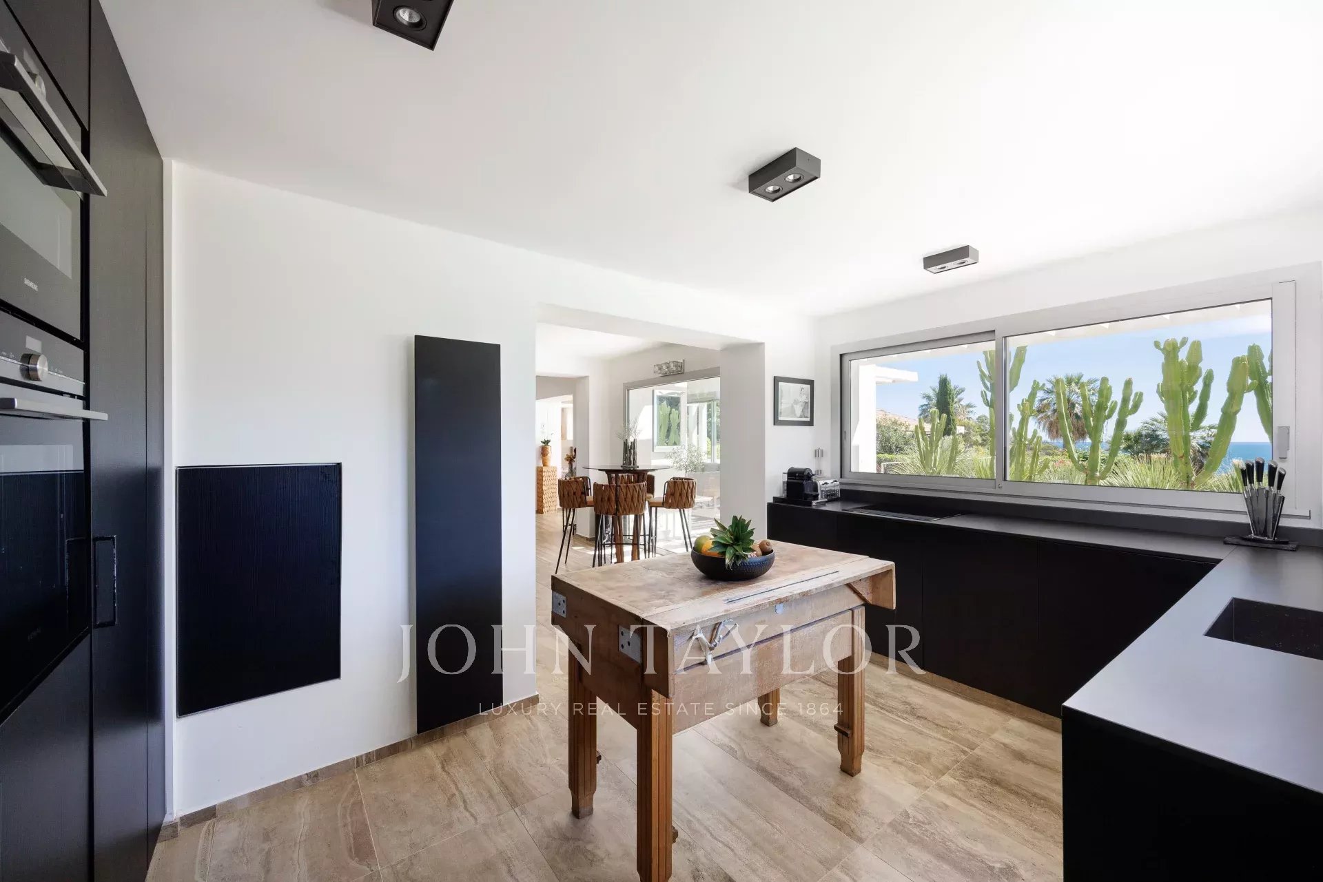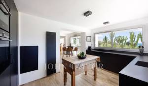 Perfekt ausgestattete Küche, die sich zum Esszimmer hin öffnet und einen Blick auf den Garten, das Sommeresszimmer und den Pool bietet.