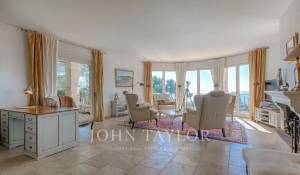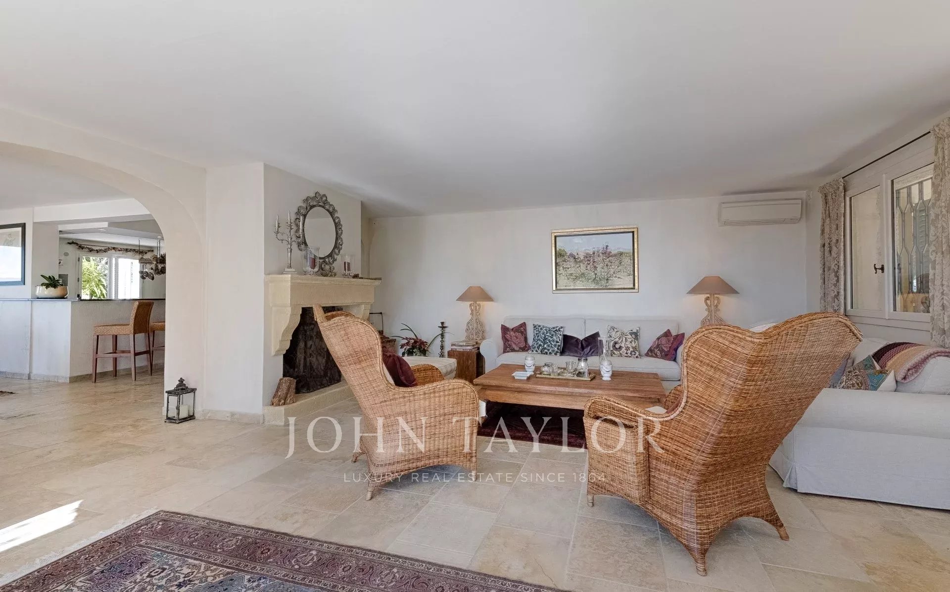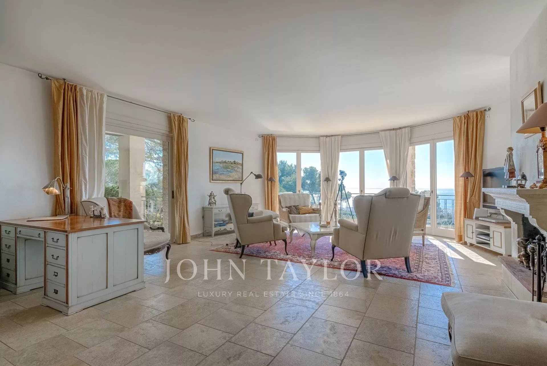 Großes Wohnzimmer mit Kamin, TV, Büro, das sich auf zwei Terrassen öffnet, Meerblick.