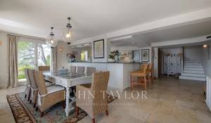 Schöner Empfang mit Wohnzimmer mit Kamin, Esszimmer und perfekt ausgestatteter amerikanischer Küche, die sich zur Terrasse hin öffnet. Esszimmer für den Sommer.