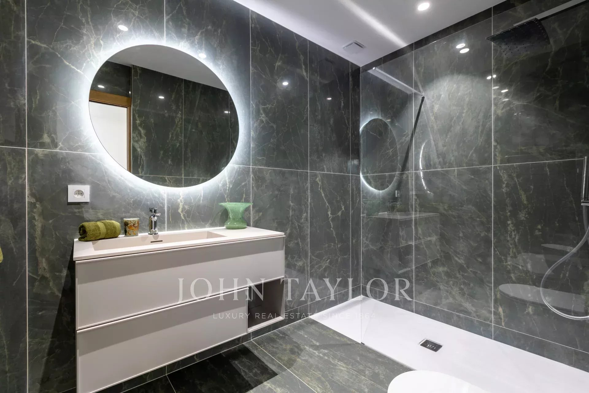 Das Erdgeschoss besteht aus einem dreifachen Empfangsbereich von ca. 120 m² mit offener Küche, 4 Suiten mit Duschbädern.