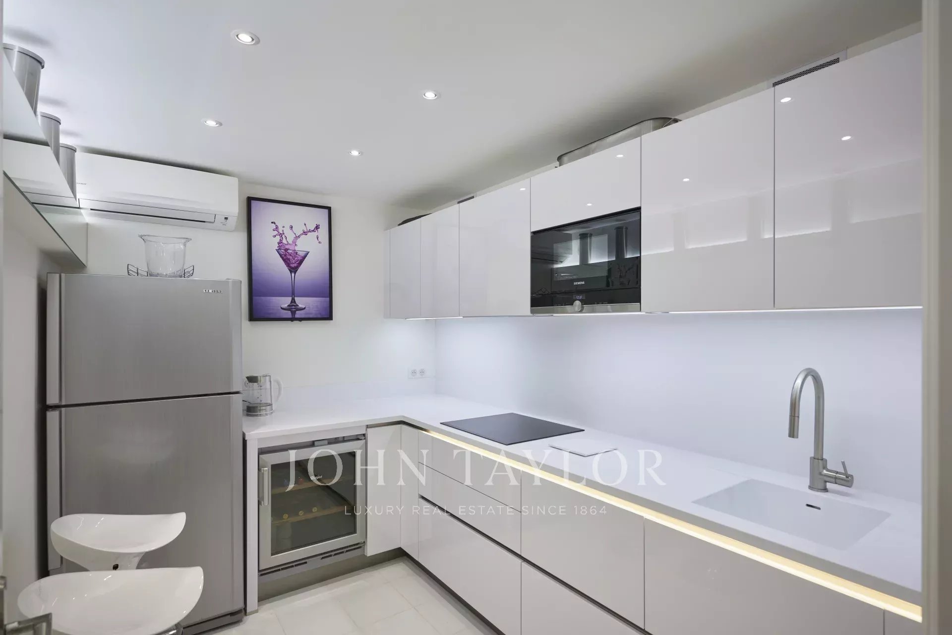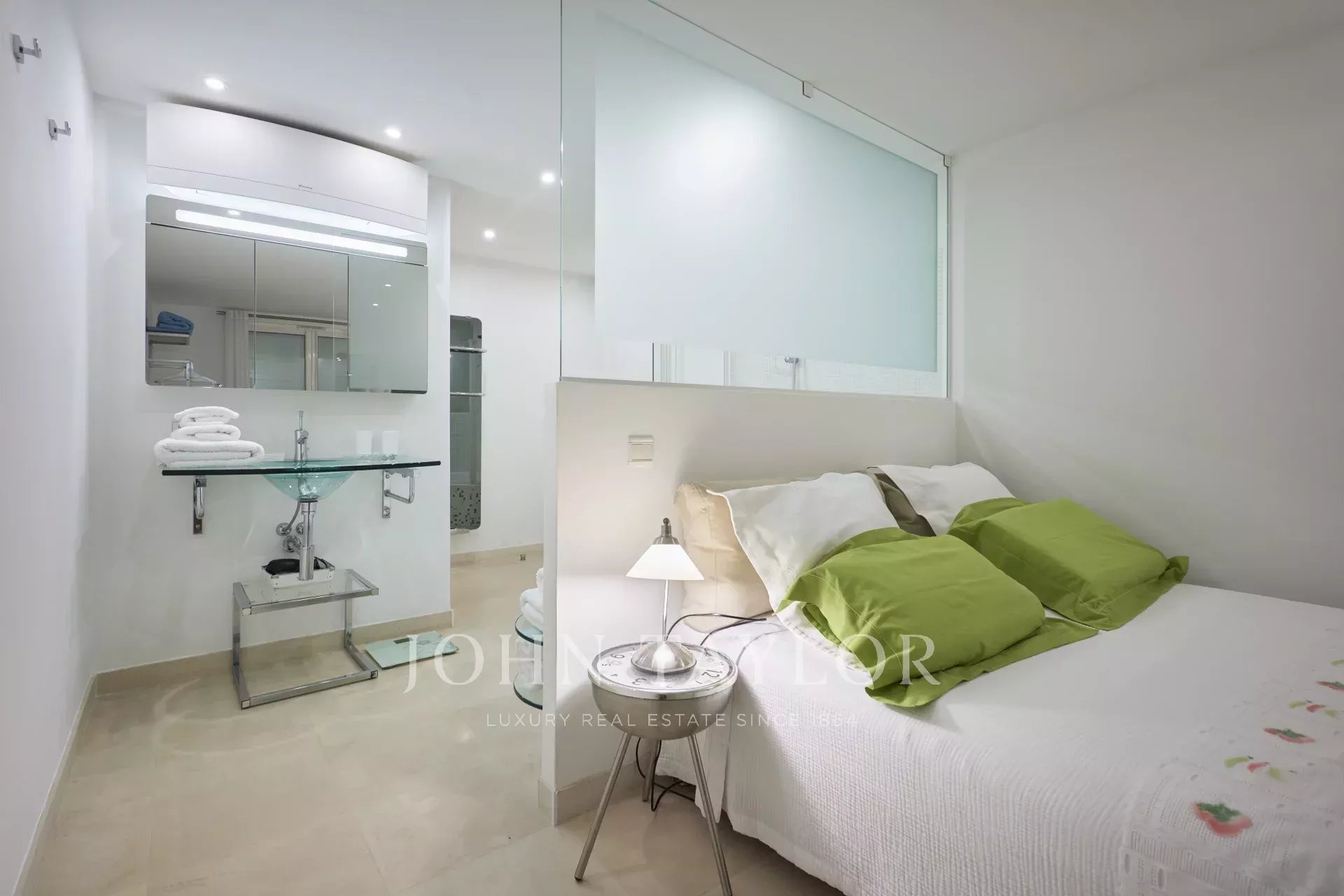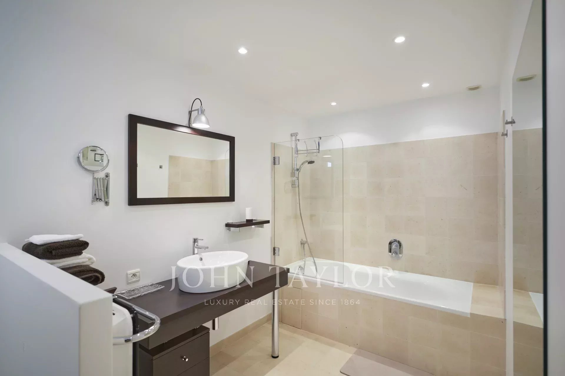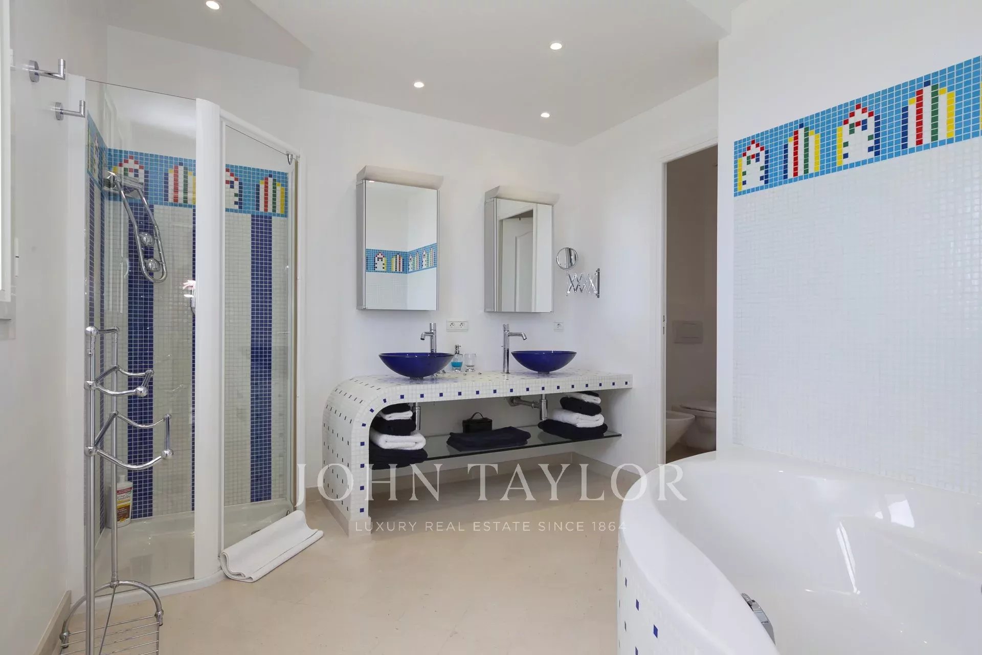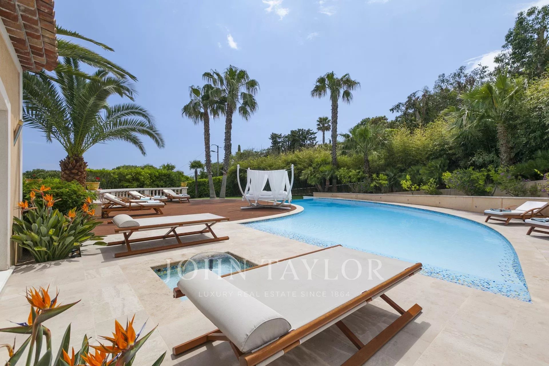 Neu gebaute Villa im neo-provenzalischen Stil mit einer ausgesprochen zeitgenössischen Dekoration. Diese 400 m2 große, voll klimatisierte Villa befindet sich im Viertel "Super Cannes" und genießt einen herrlichen Meerblick von der Spitze des Cap d'Antibes bis nach Cannes und den Lérins-Inseln.