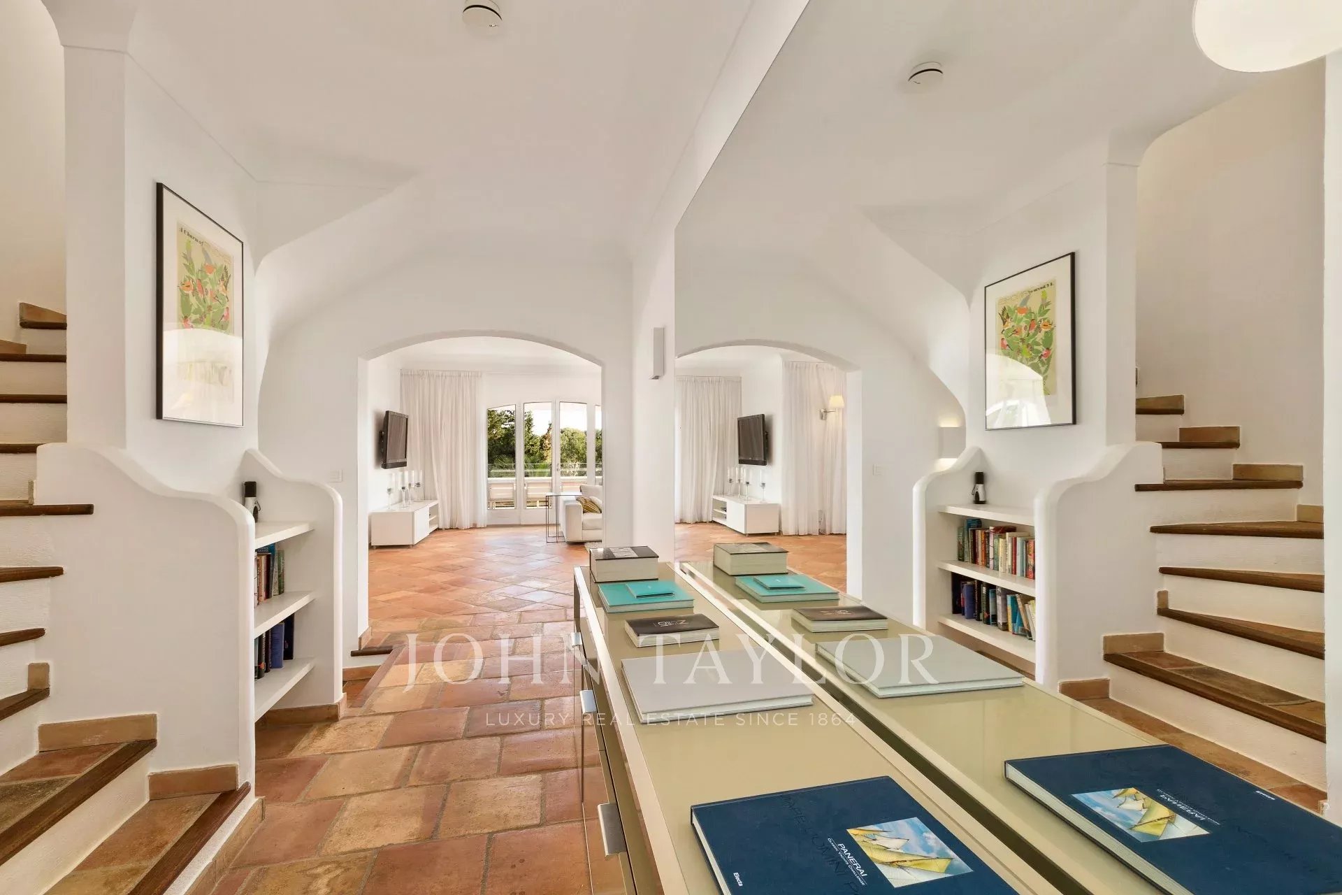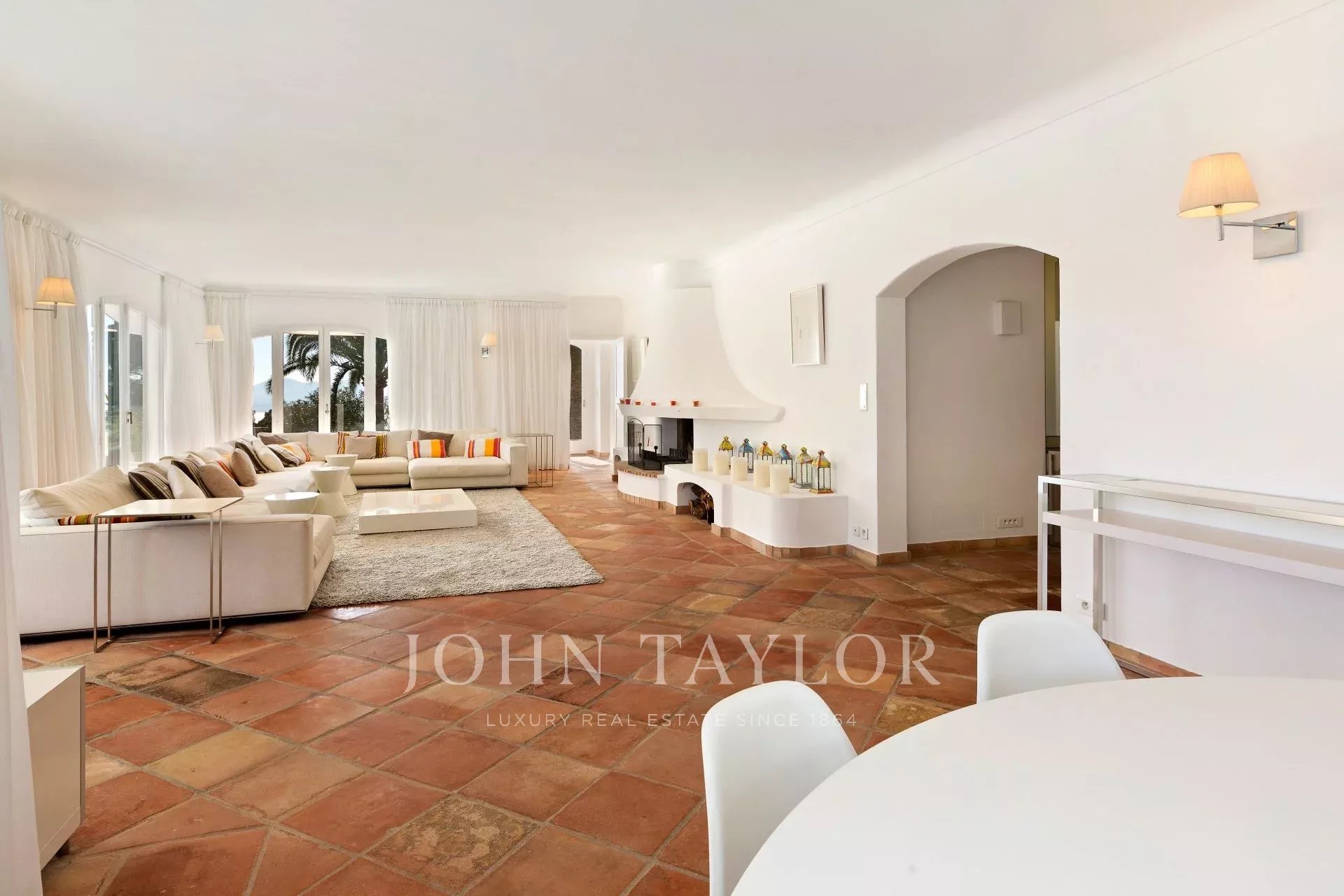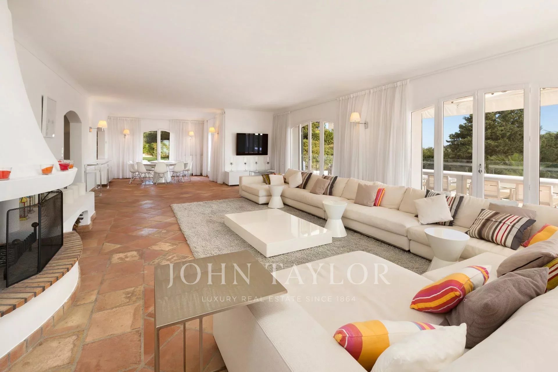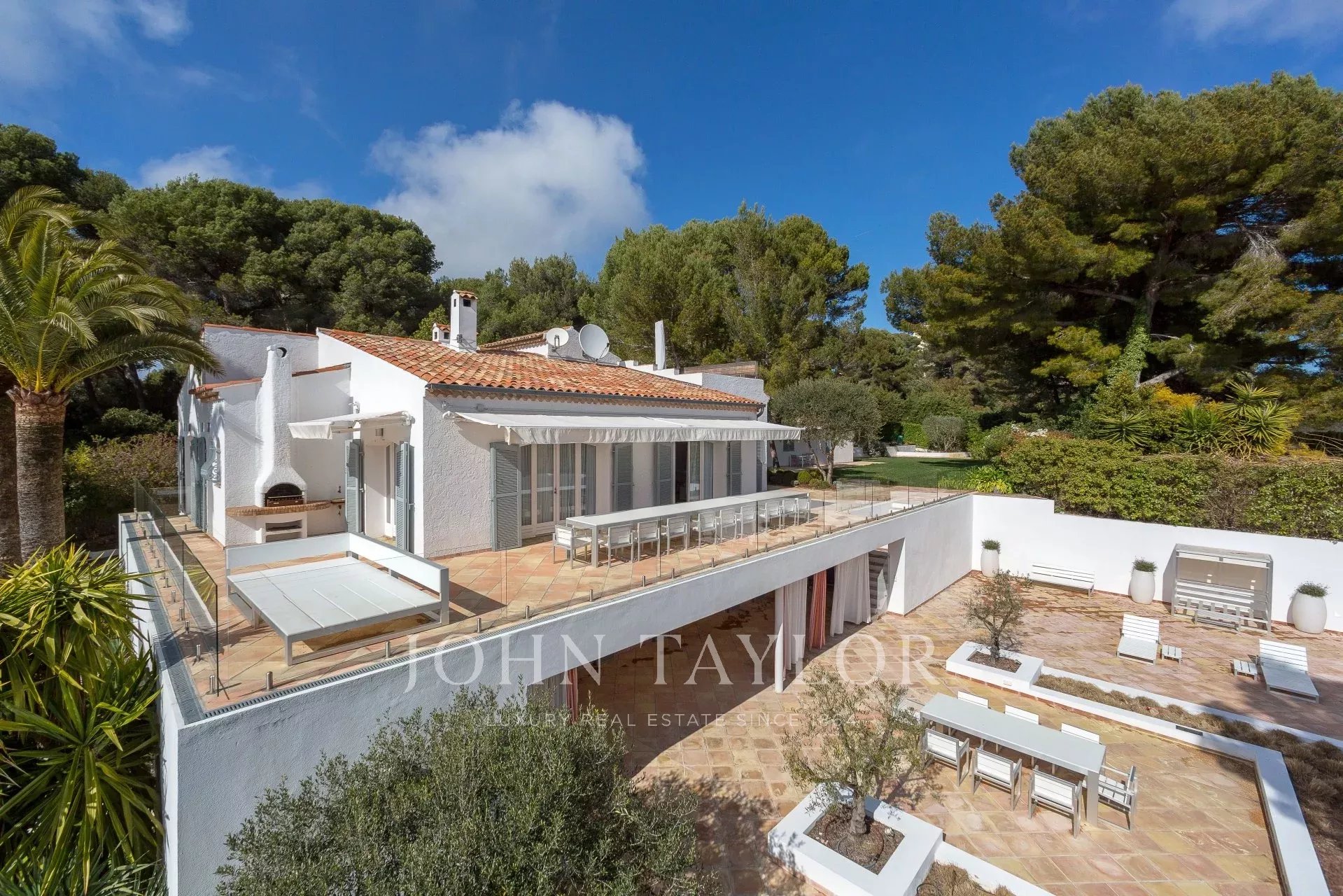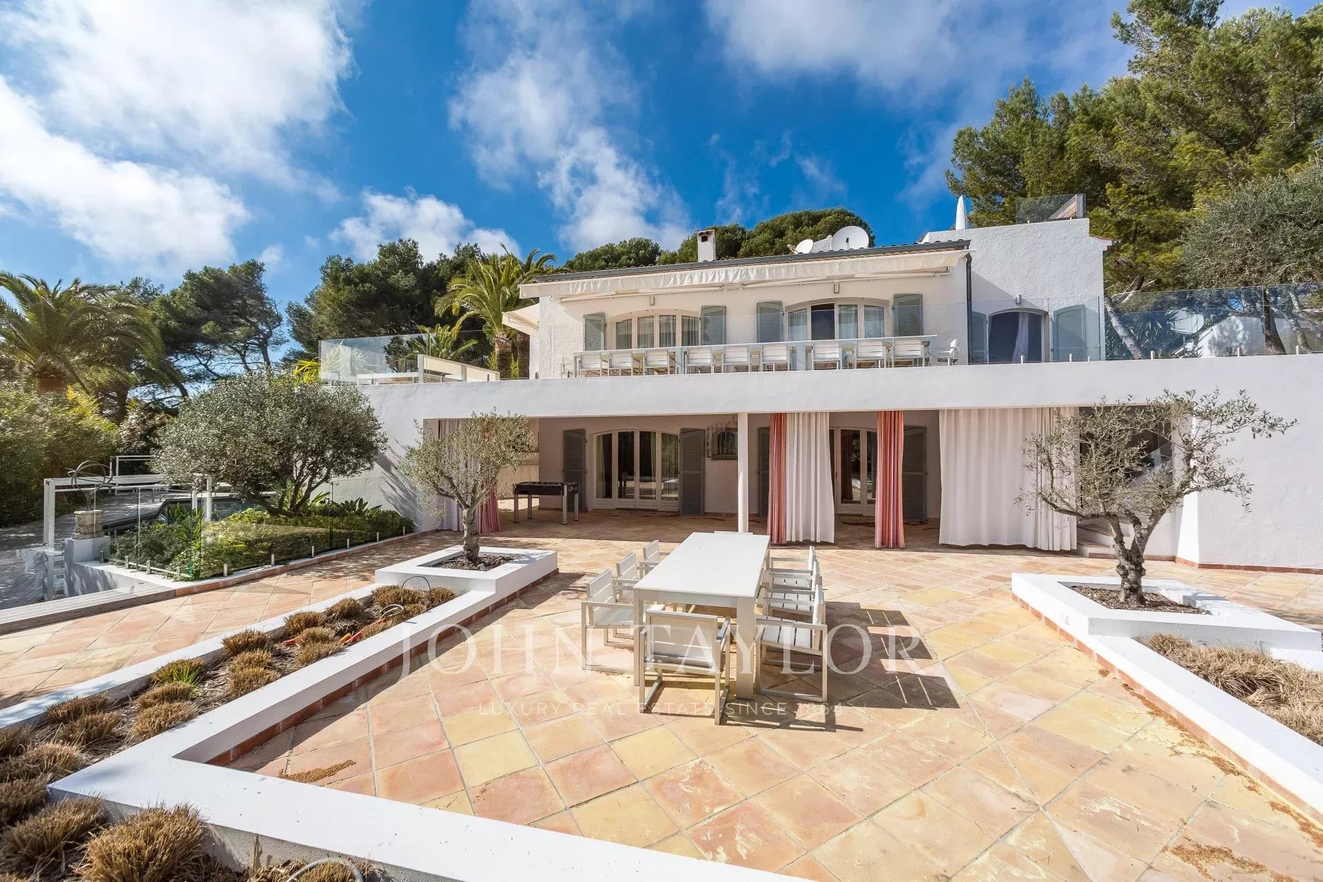 Großer Empfang mit Wohn- und Esszimmer, das sich zu einer großen, ausgestatteten Terrasse mit einem Sommer-Esszimmer für 20 Personen öffnet, Meerblick.