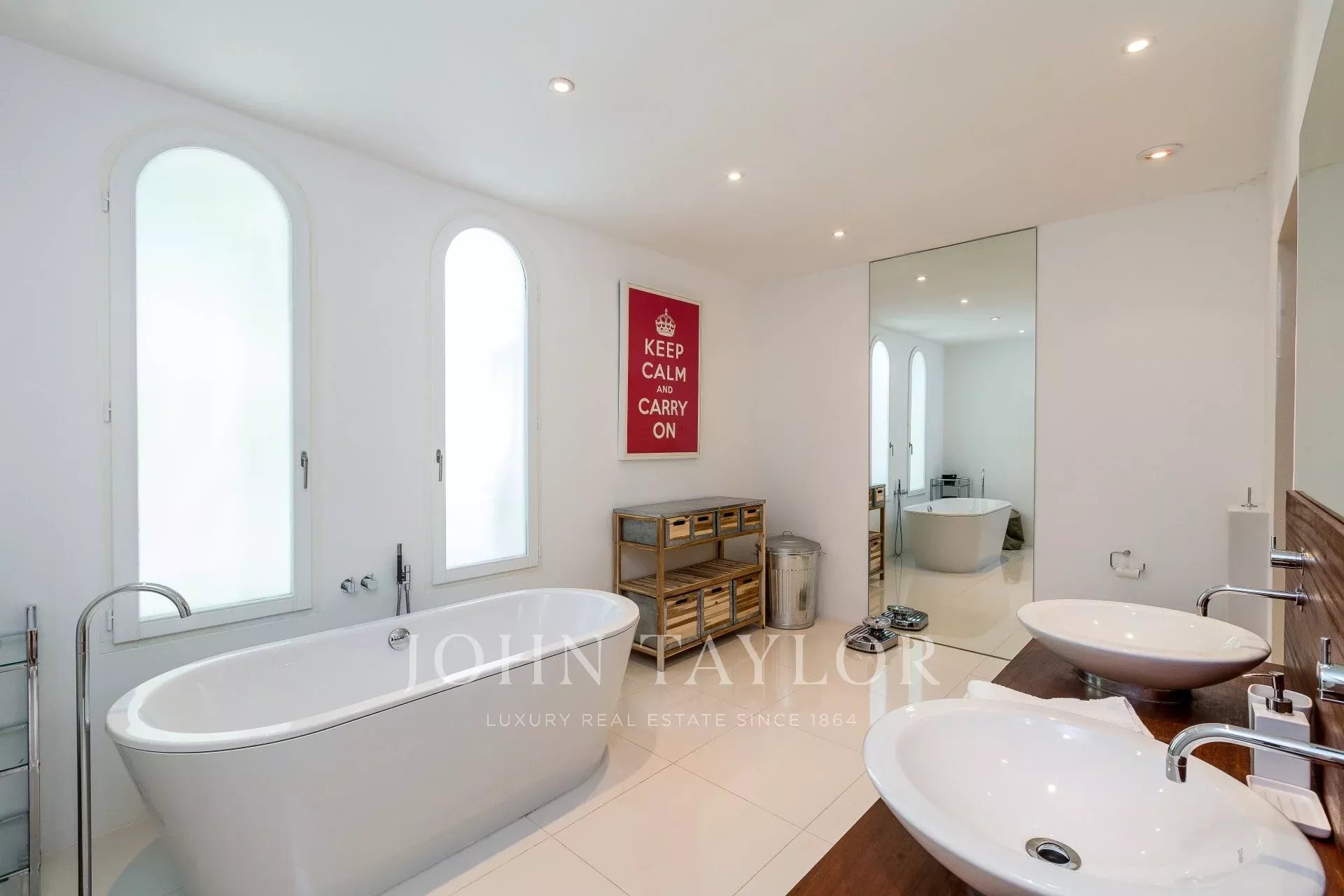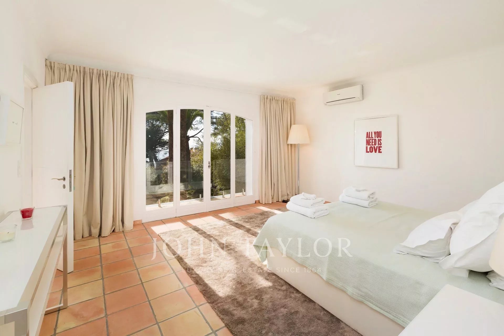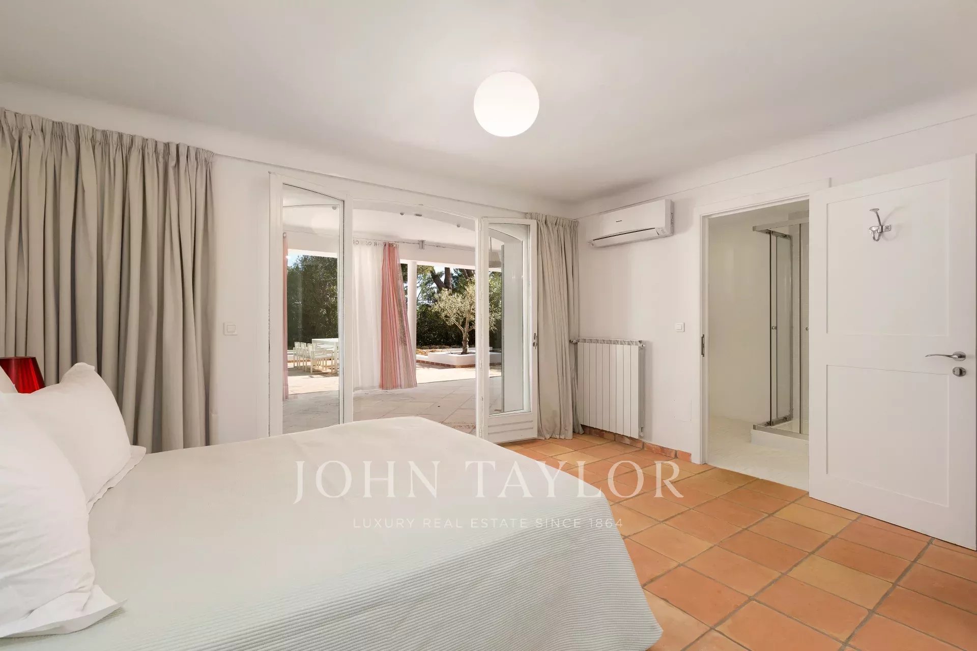 Hauptschlafzimmer (Bett 180 cm), das sich auf eine Terrasse öffnet, Zugang zum Pool - Ankleidezimmer - Badezimmer / Doppeldusche / WC.