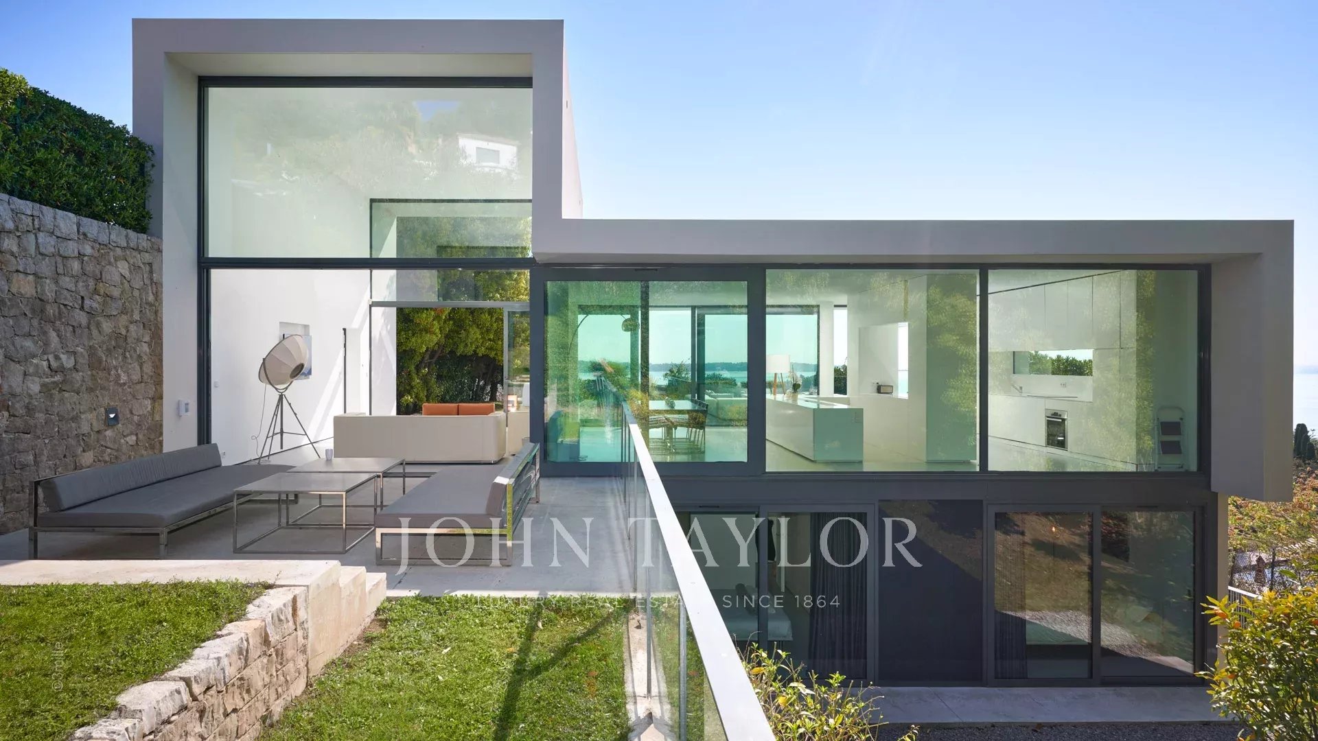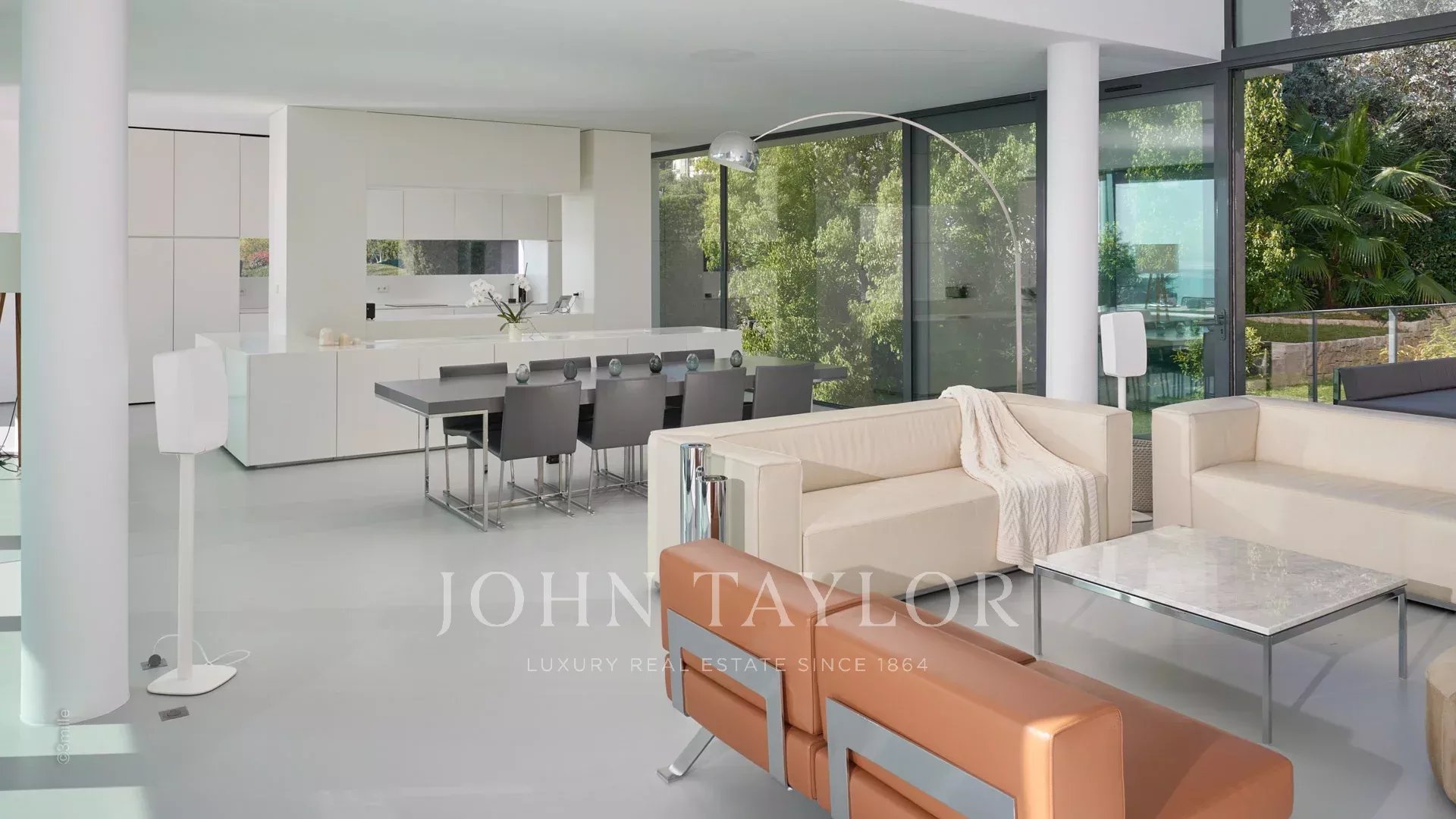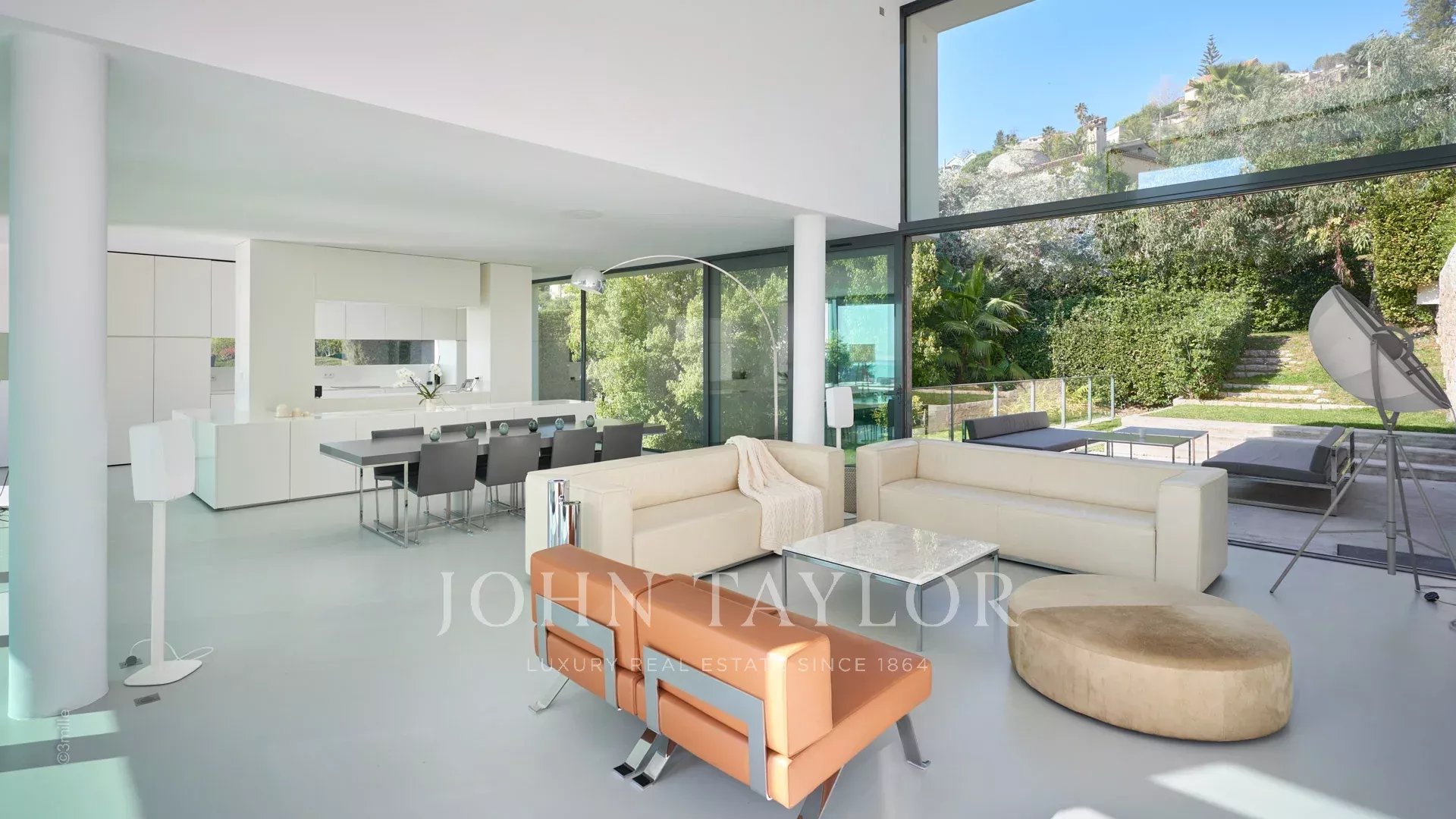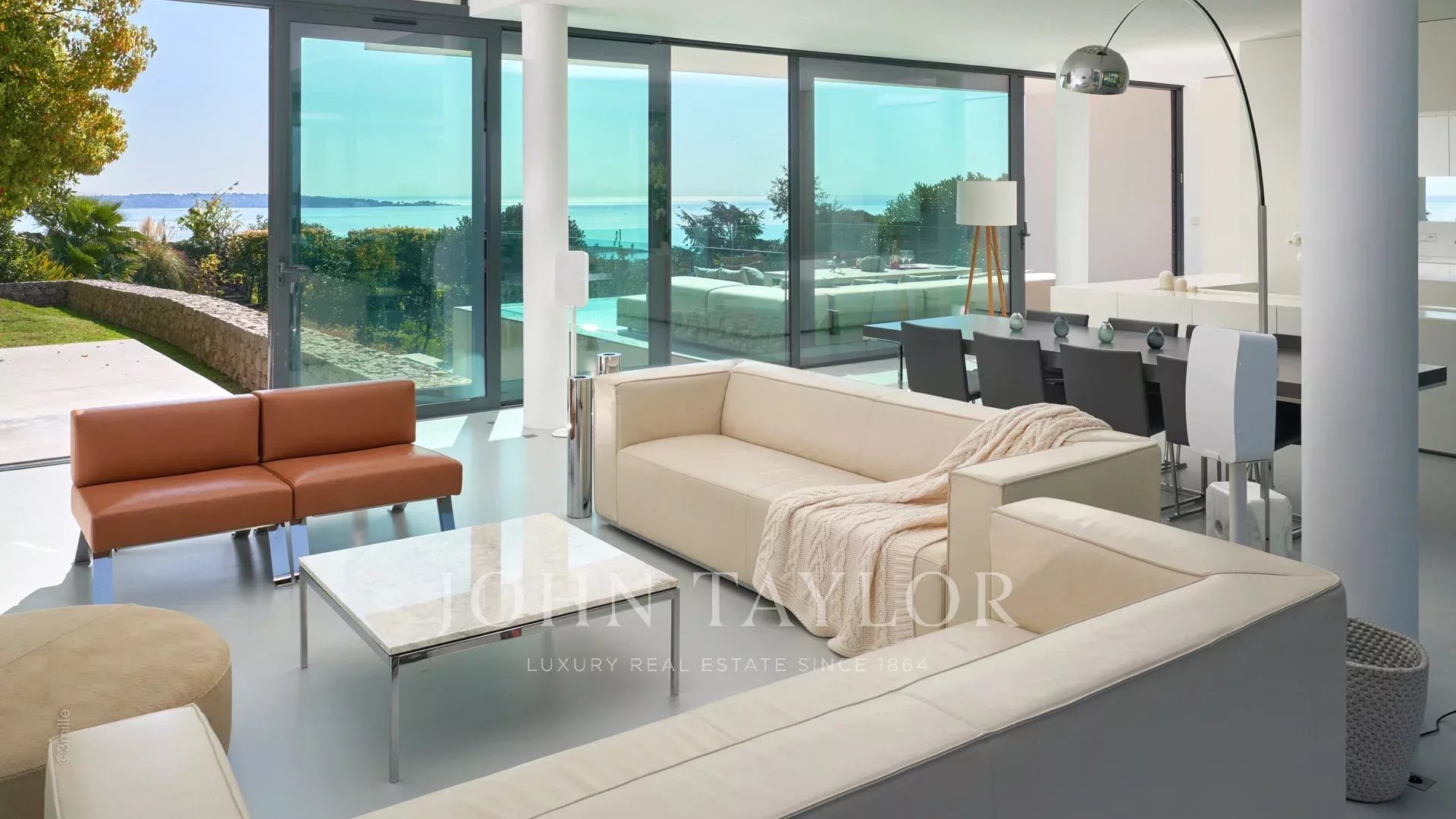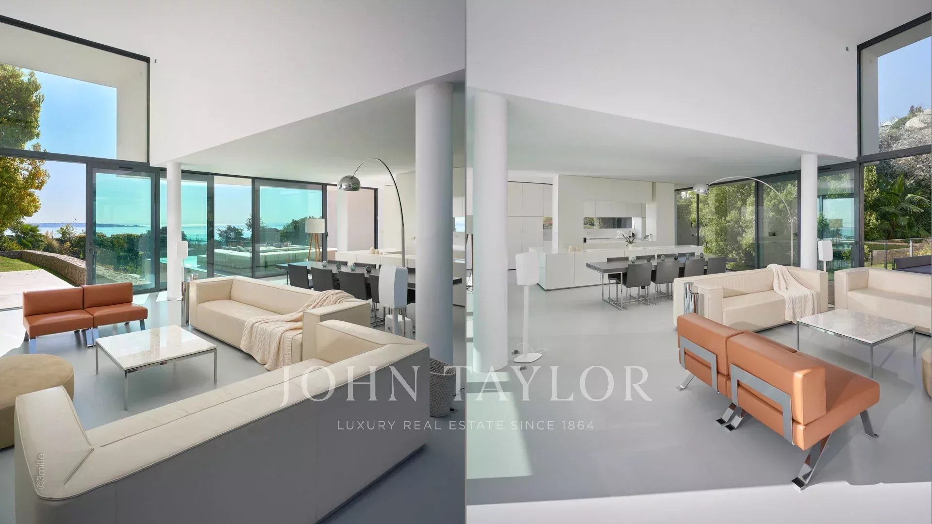 Großer Empfangsbereich mit Wohnzimmer, Esszimmer und offener Küche. Alles öffnet sich zur Terrasse, die von einem Blick auf das Meer, den Pool und den Garten profitiert.