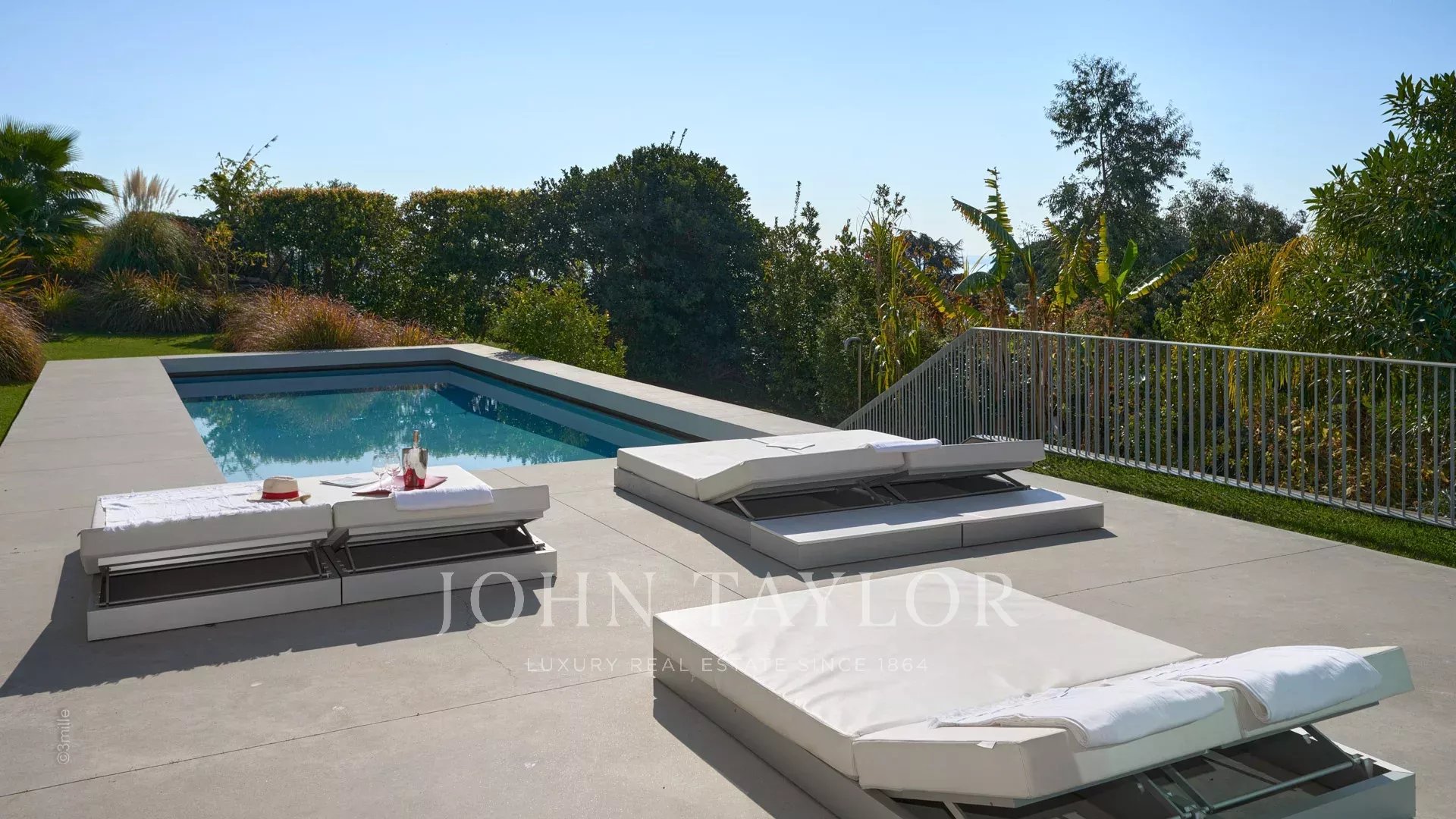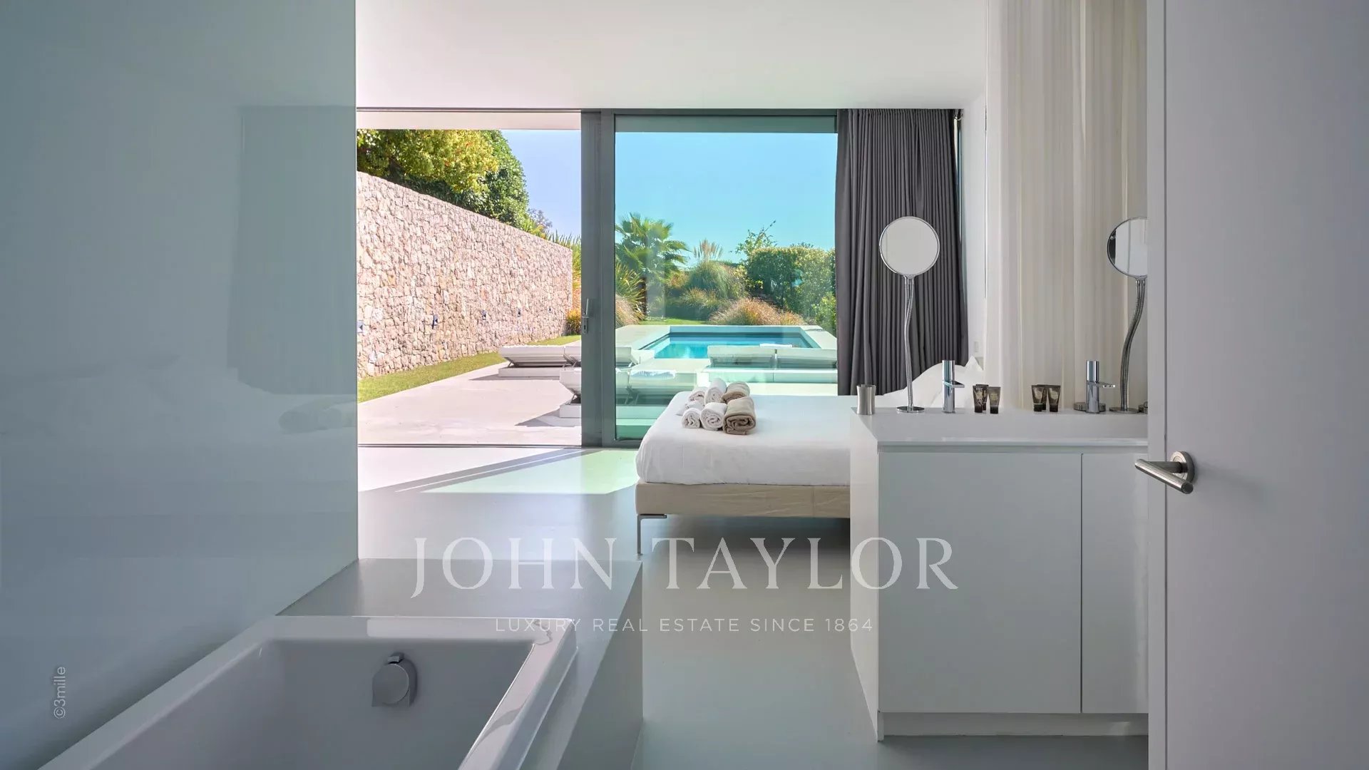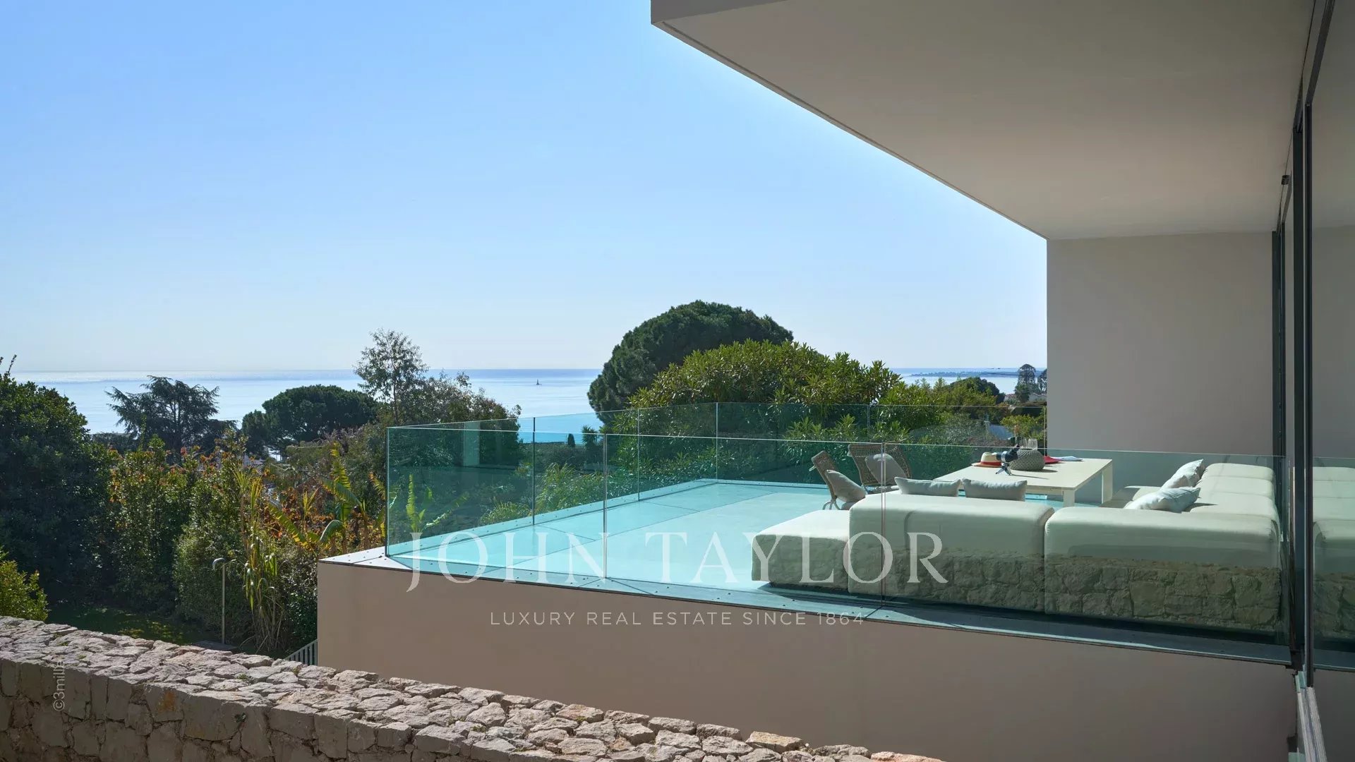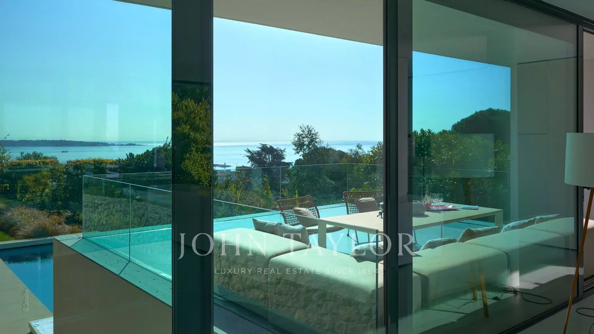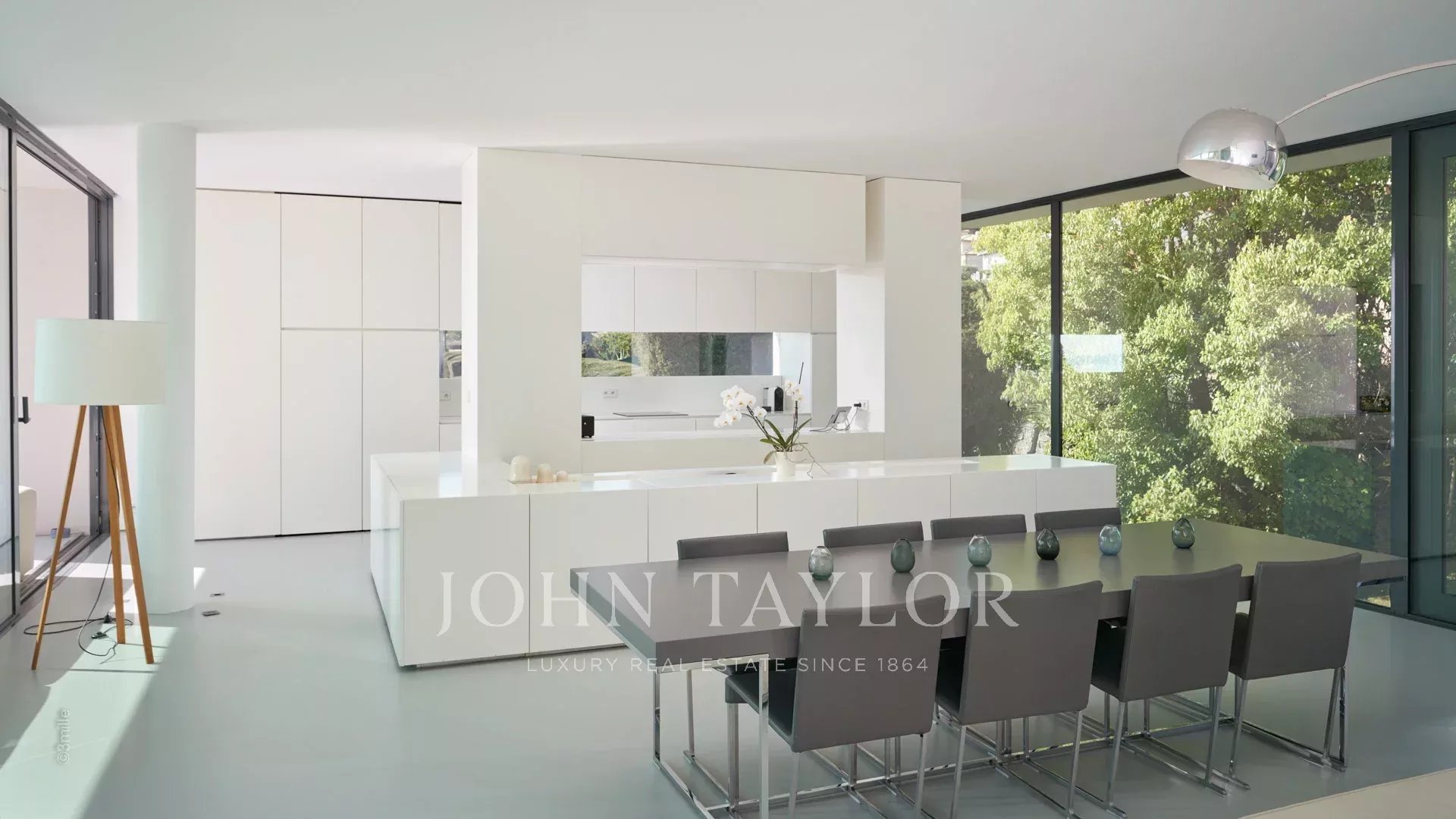 Großer Empfangsbereich mit Wohnzimmer, Esszimmer und offener Küche. Alles öffnet sich zur Terrasse, die von einem Blick auf das Meer, den Pool und den Garten profitiert.