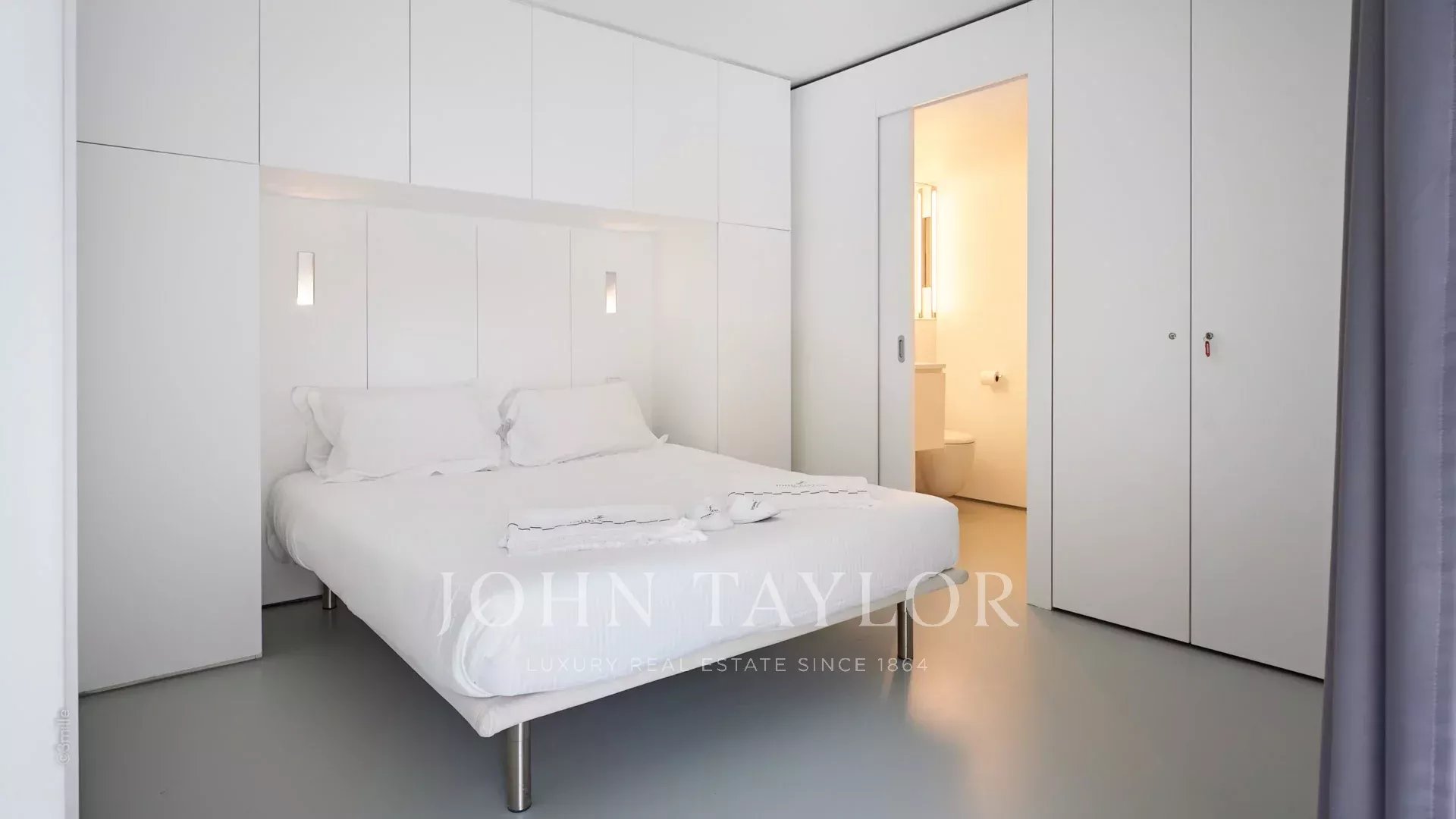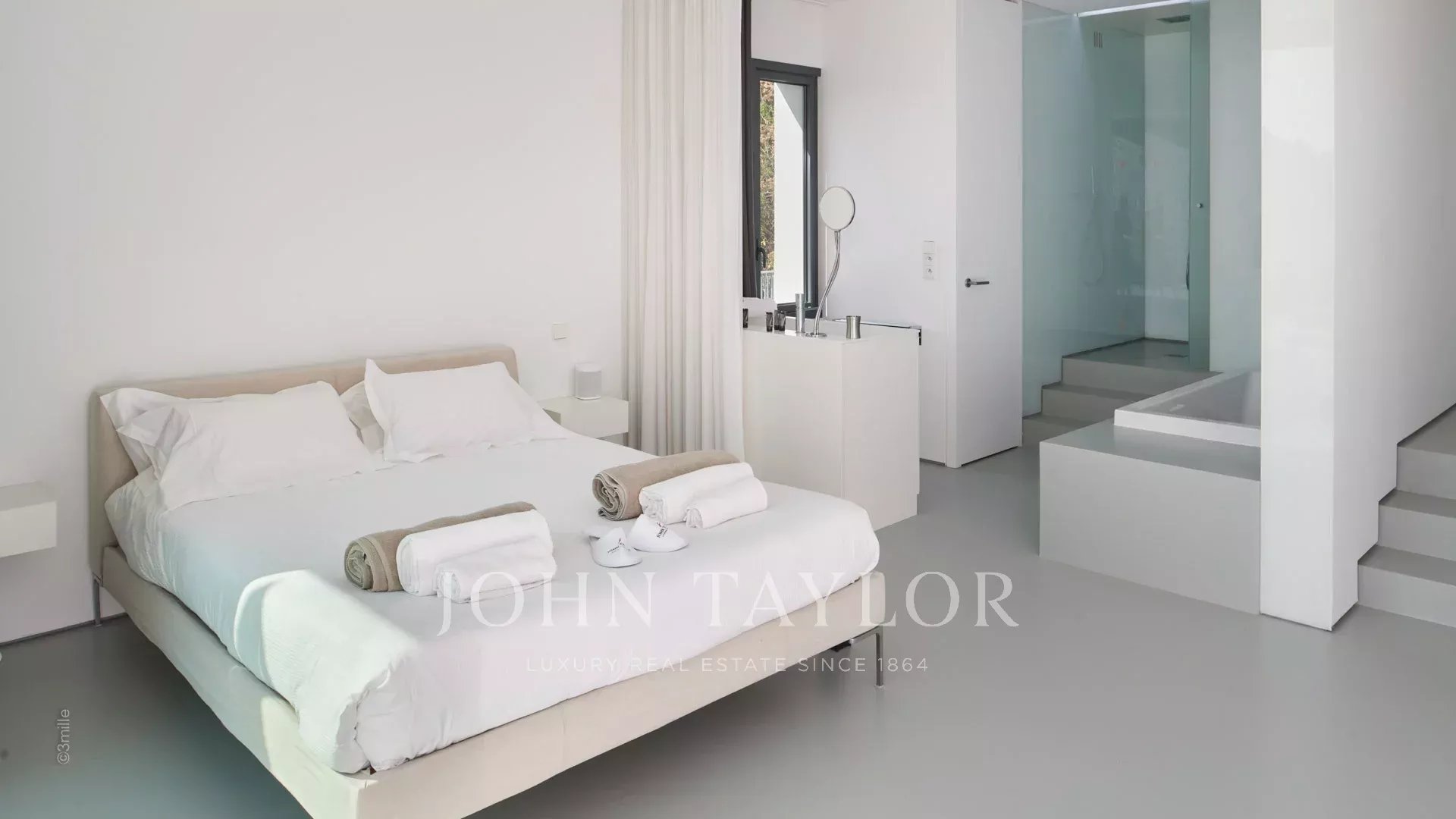 Hauptschlafzimmer (Doppelbett), das sich auf die Terrasse mit Meerblick öffnet - komplettes offenes Badezimmer/ WC.