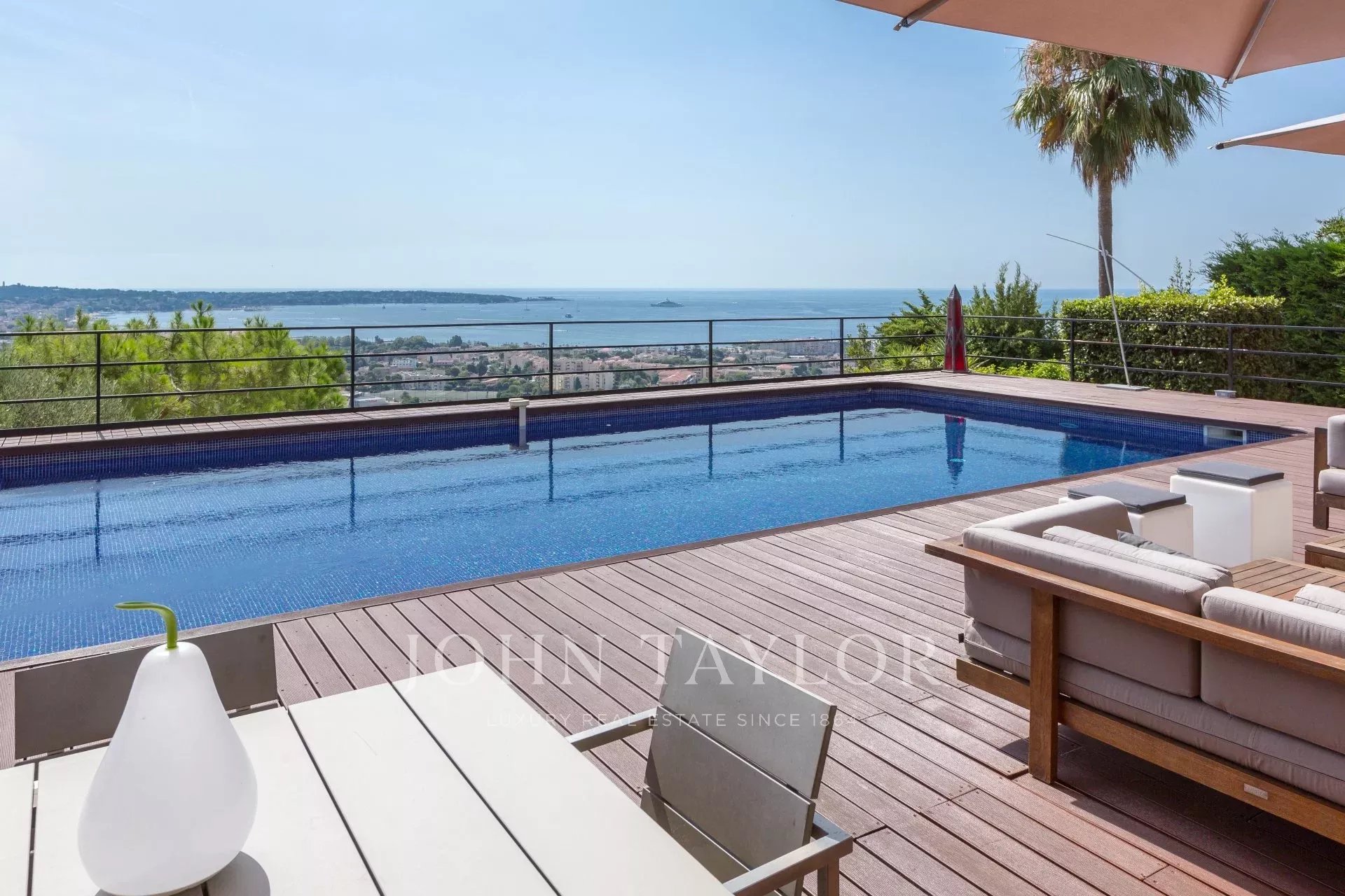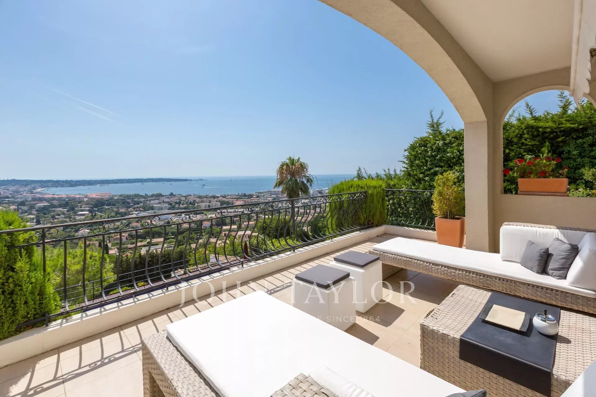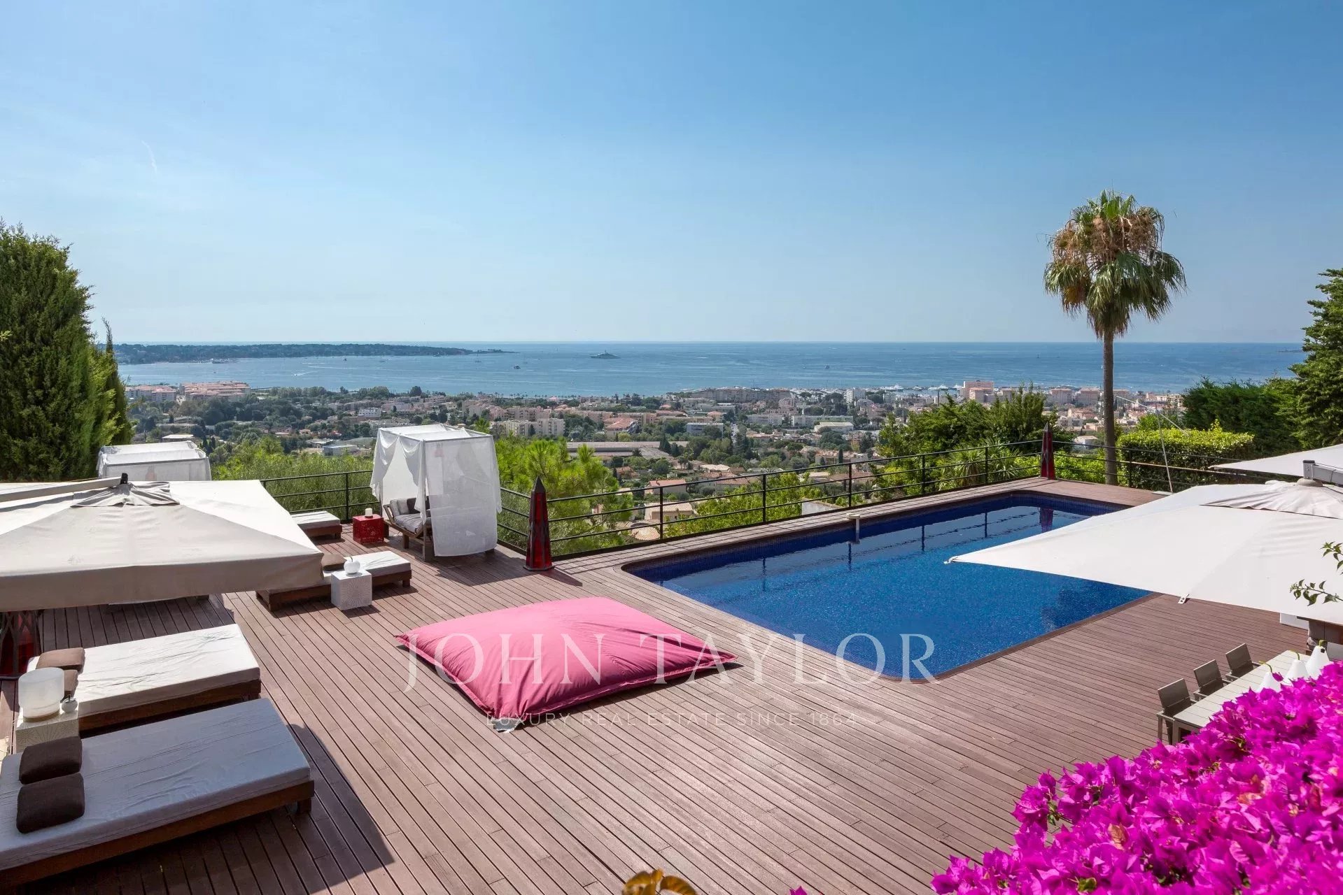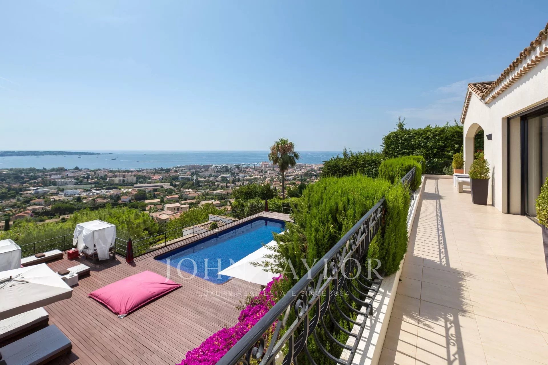 Auf den Anhöhen von Golfe-Juan, im Herzen eines Landschaftsgartens von ca. 3000 m² bietet diese wunderschöne Villa mit hochwertigen zeitgenössischen Leistungen einen außergewöhnlichen Panoramablick auf das Meer bis hin zum Cap d'Antibes.