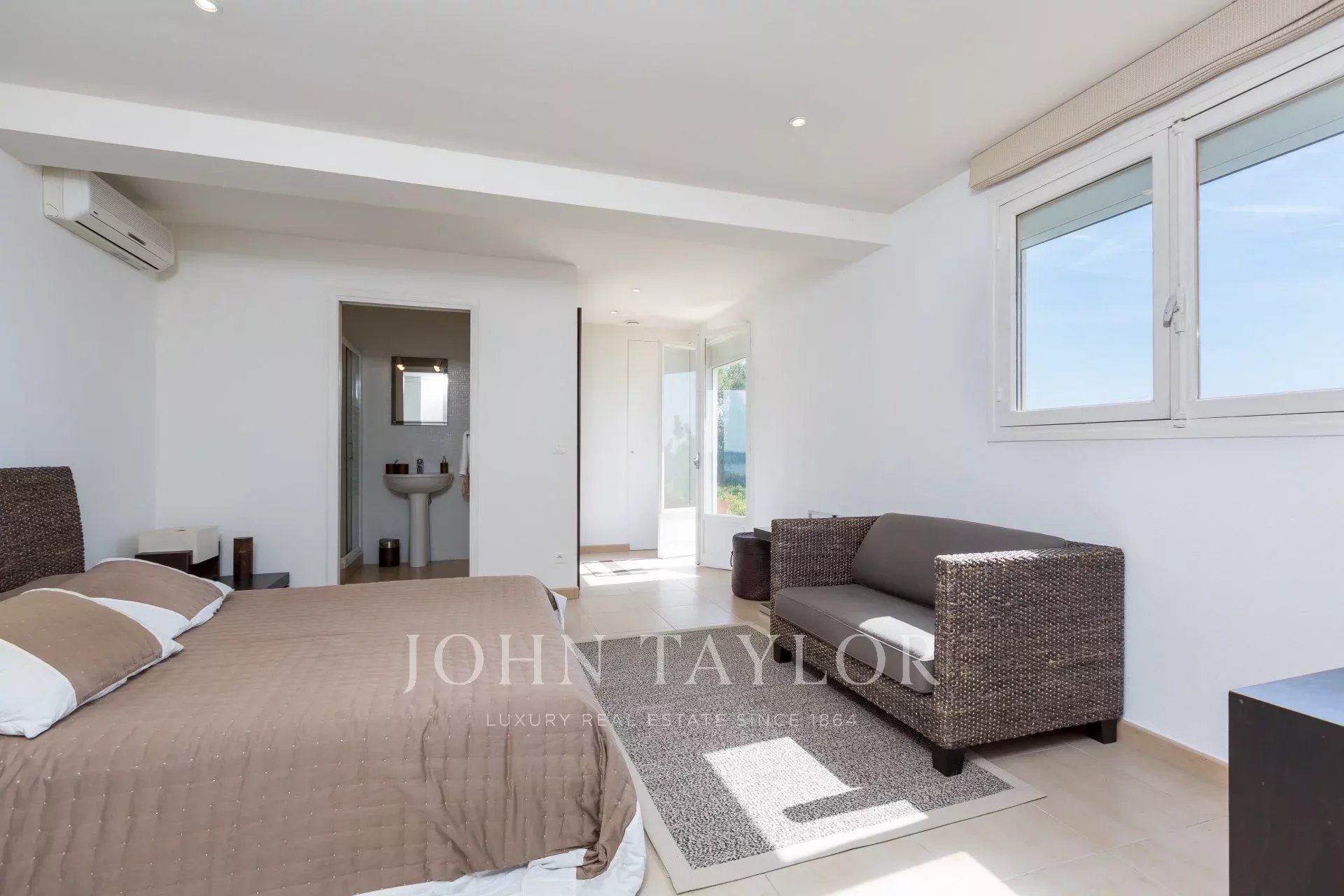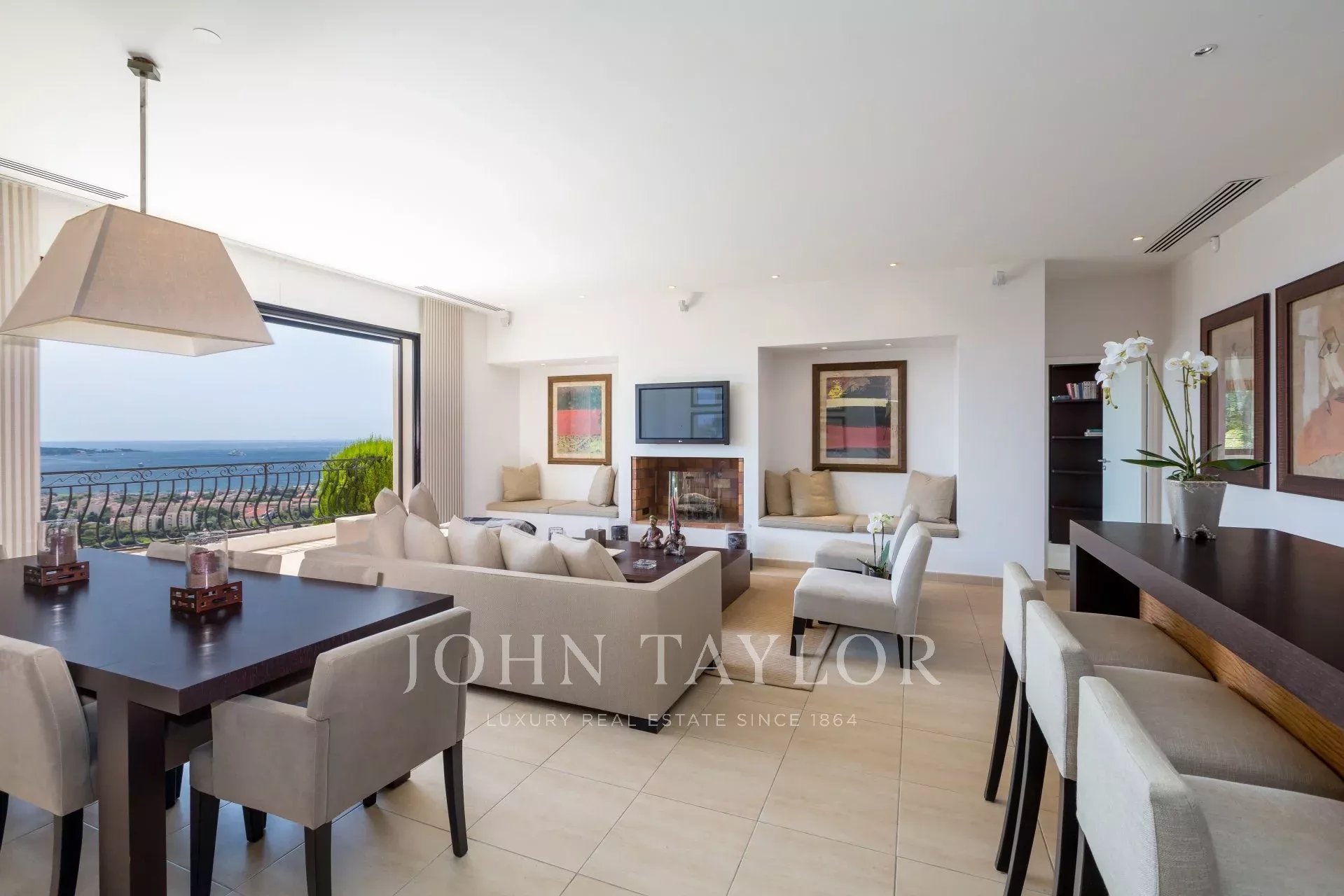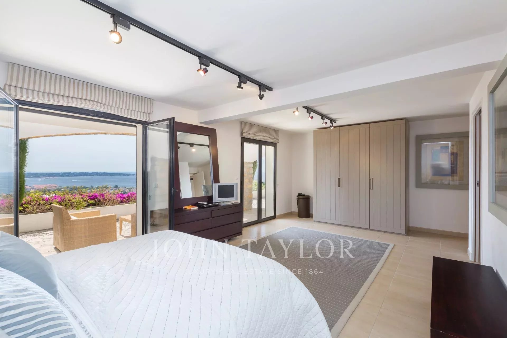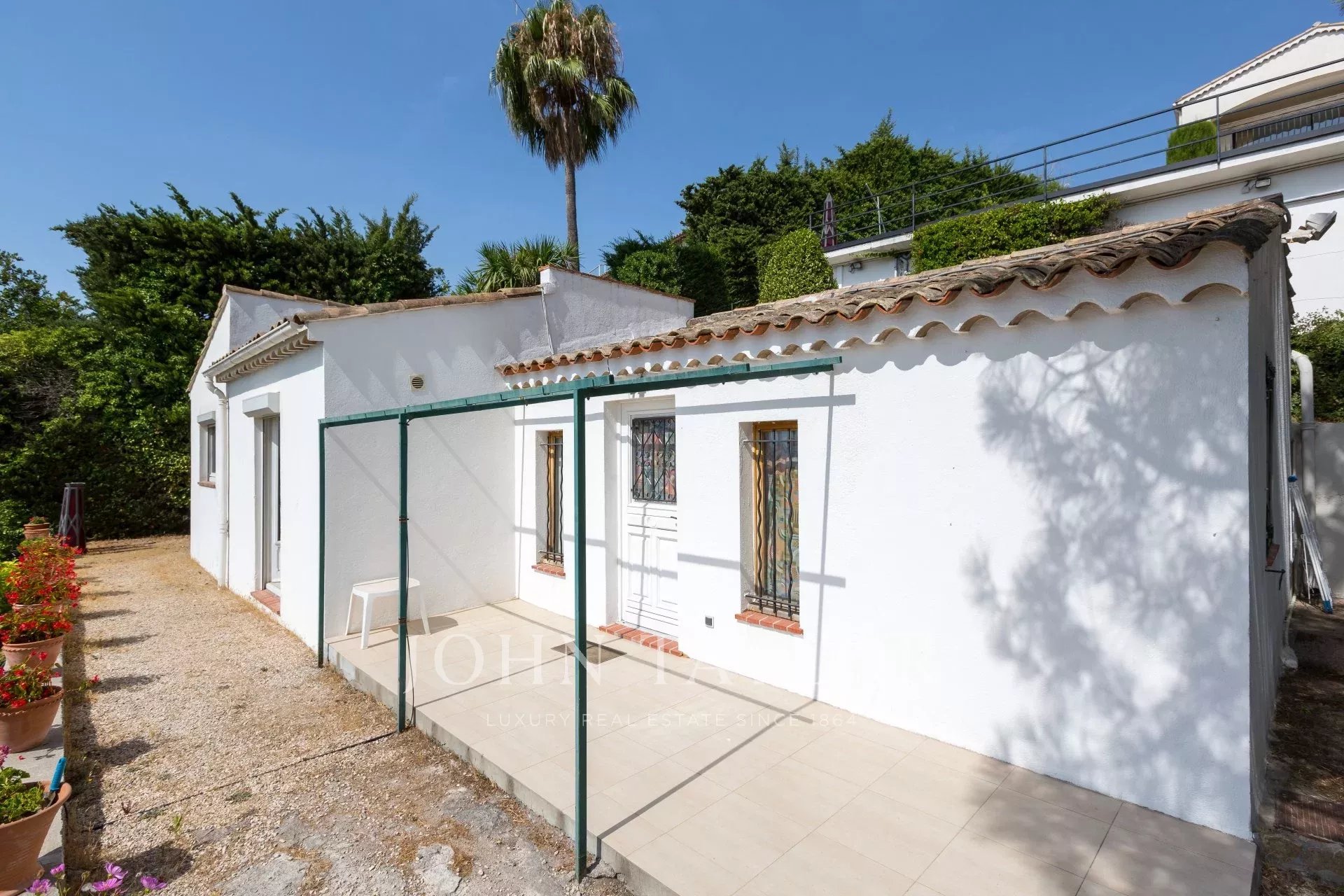 Auf den Anhöhen von Golfe-Juan, im Herzen eines Landschaftsgartens von ca. 3000 m² bietet diese wunderschöne Villa mit hochwertigen zeitgenössischen Leistungen einen außergewöhnlichen Panoramablick auf das Meer bis hin zum Cap d'Antibes.