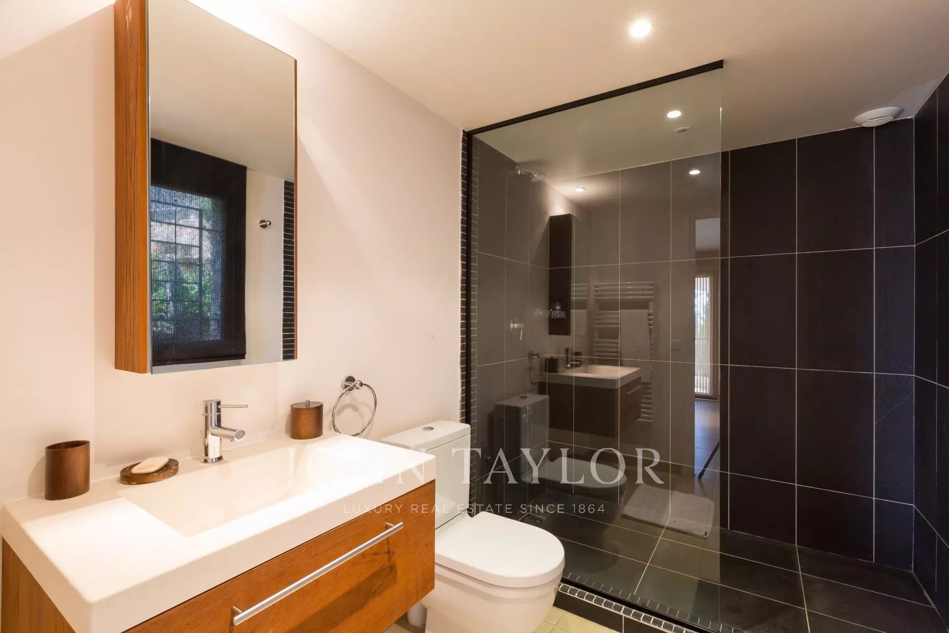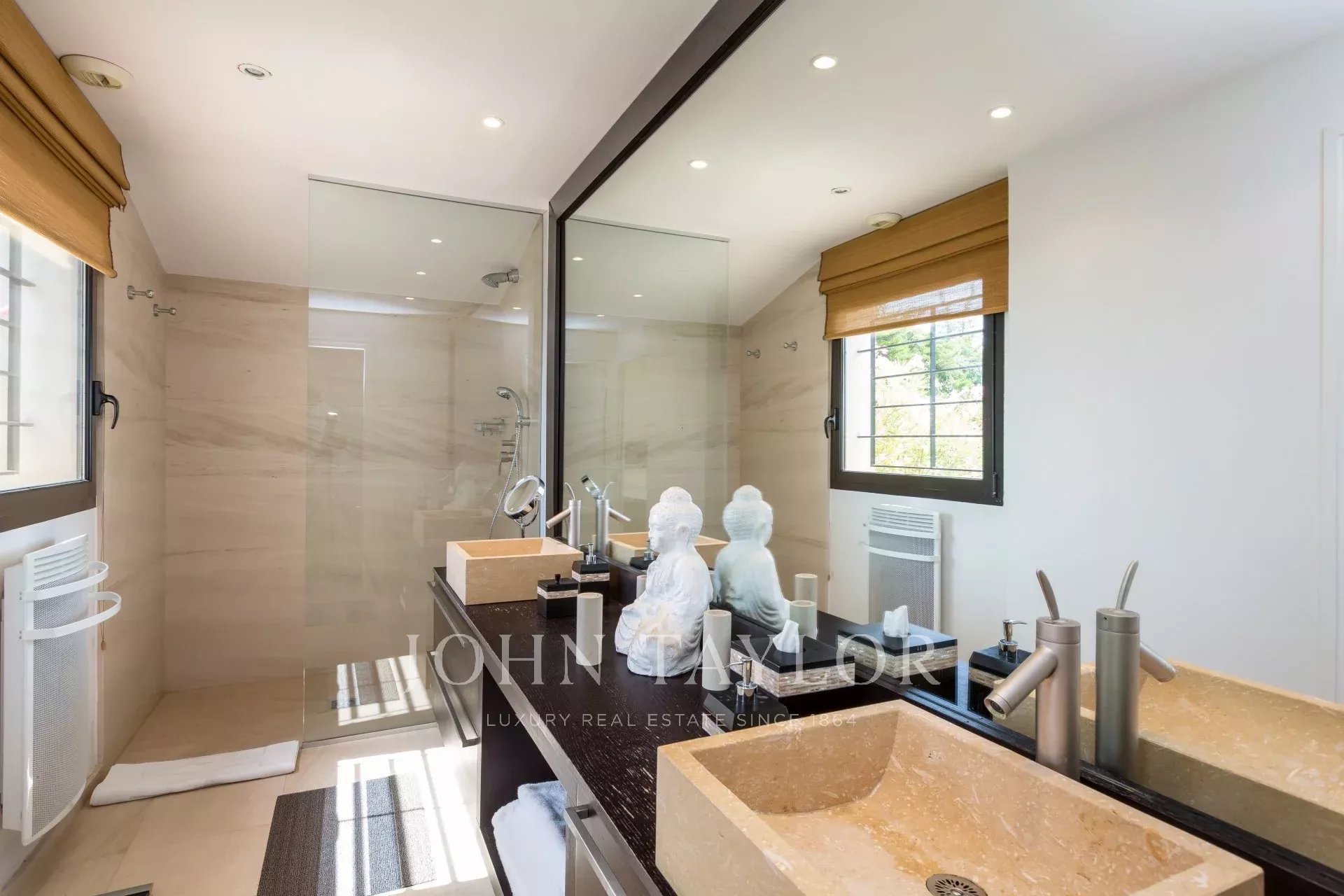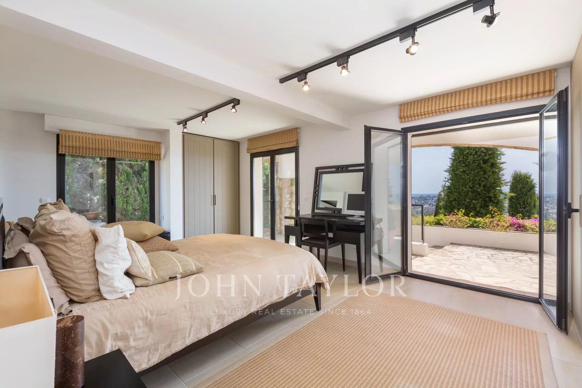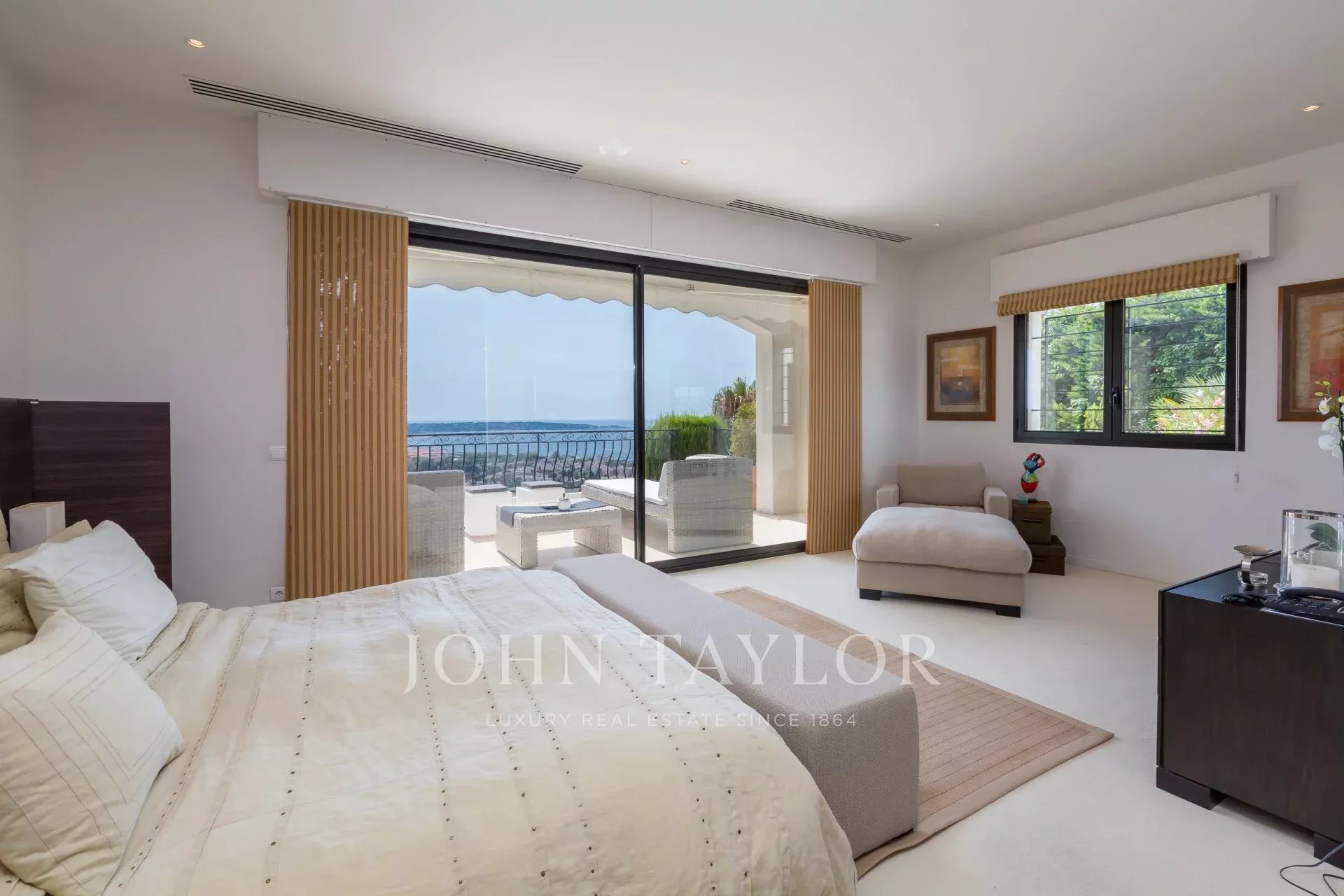 Auf den Anhöhen von Golfe-Juan, im Herzen eines Landschaftsgartens von ca. 3000 m² bietet diese wunderschöne Villa mit hochwertigen zeitgenössischen Leistungen einen außergewöhnlichen Panoramablick auf das Meer bis hin zum Cap d'Antibes.