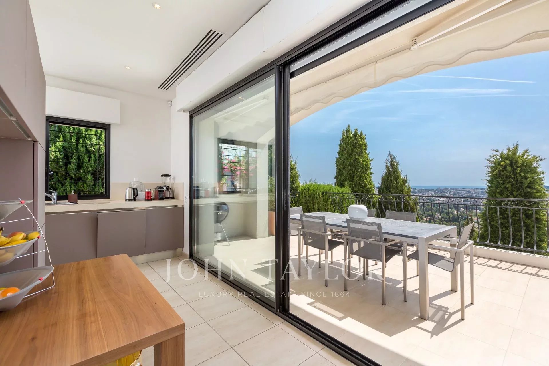 Voll ausgestattete Küche, die sich zur Terrasse hin öffnet.