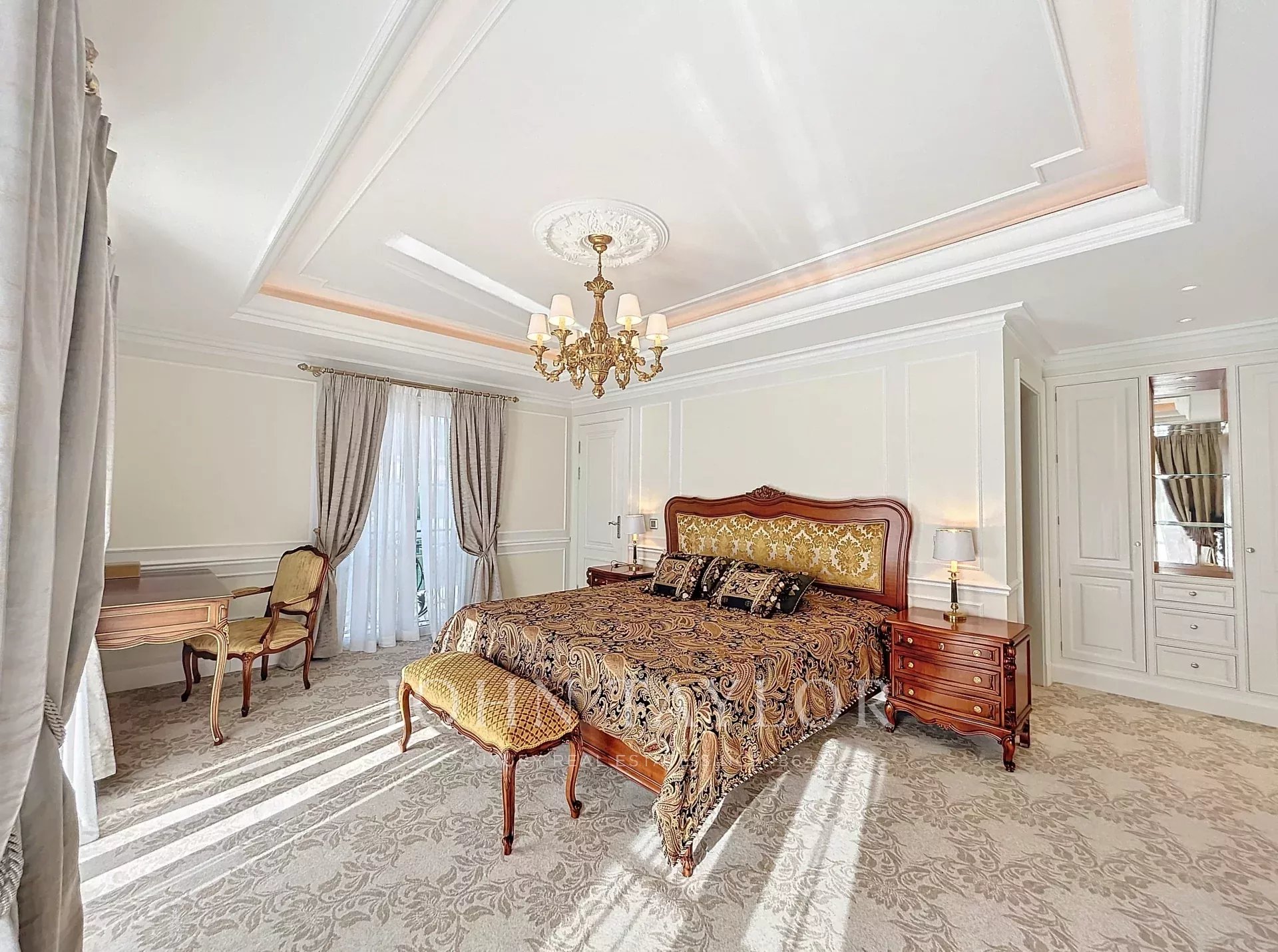 Hauptschlafzimmer mit Zugang zur Terrasse und Meerblick auf die Lérins-Inseln, ausgestattet mit einem Ankleidezimmer und einem Duschbad/WC en suite.