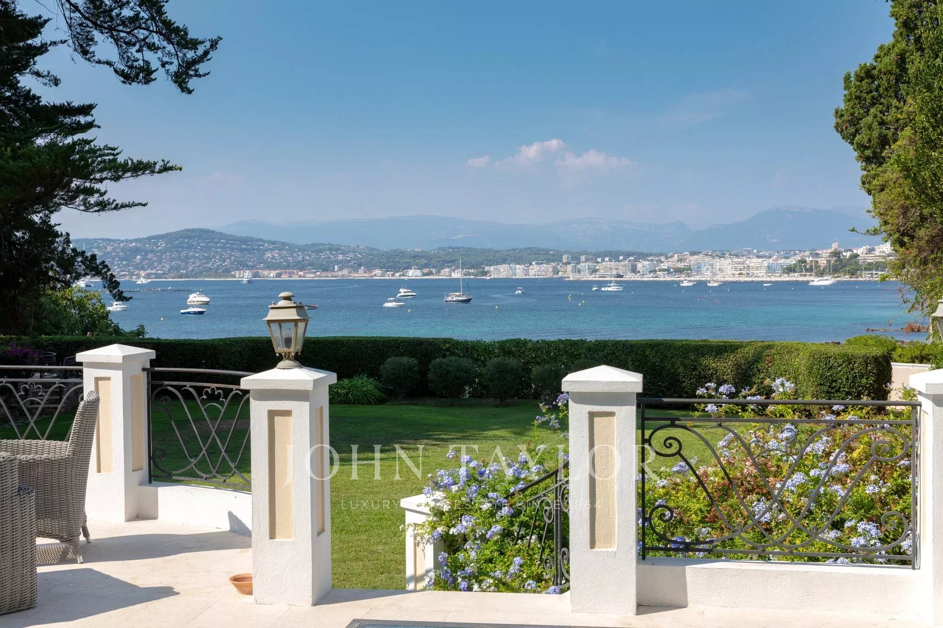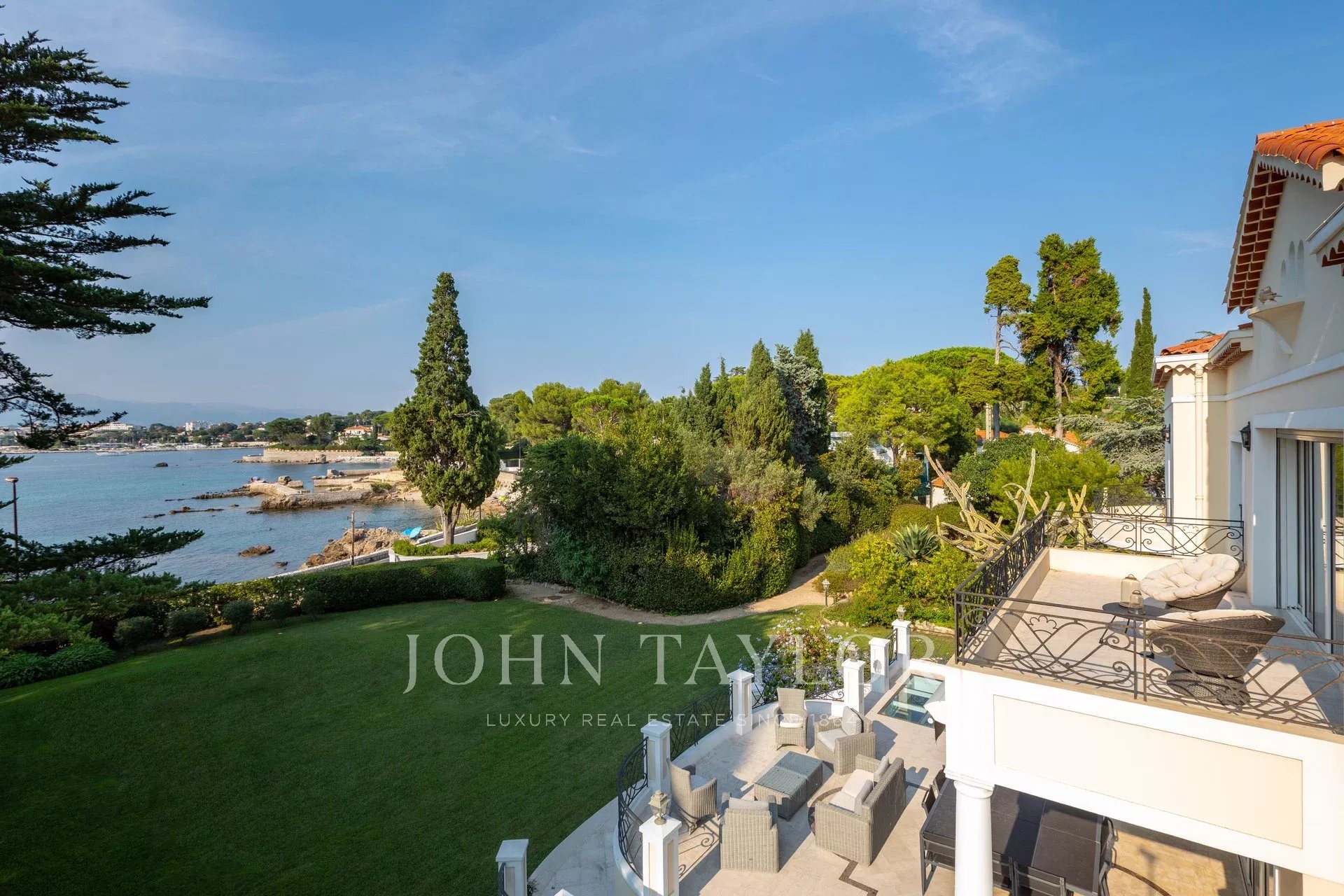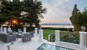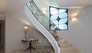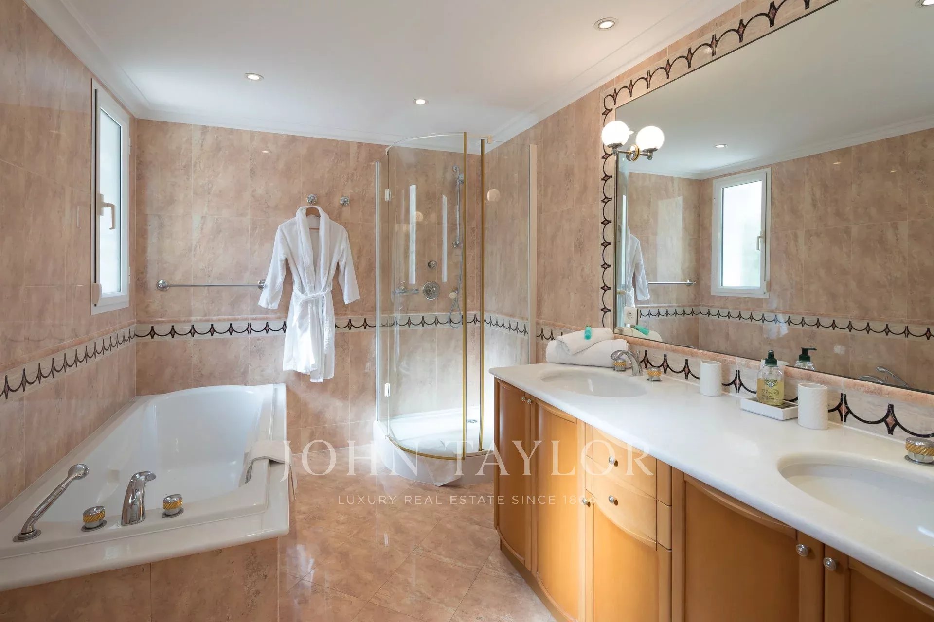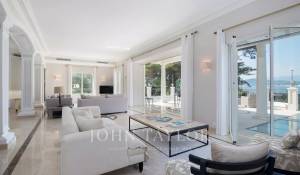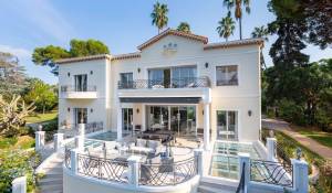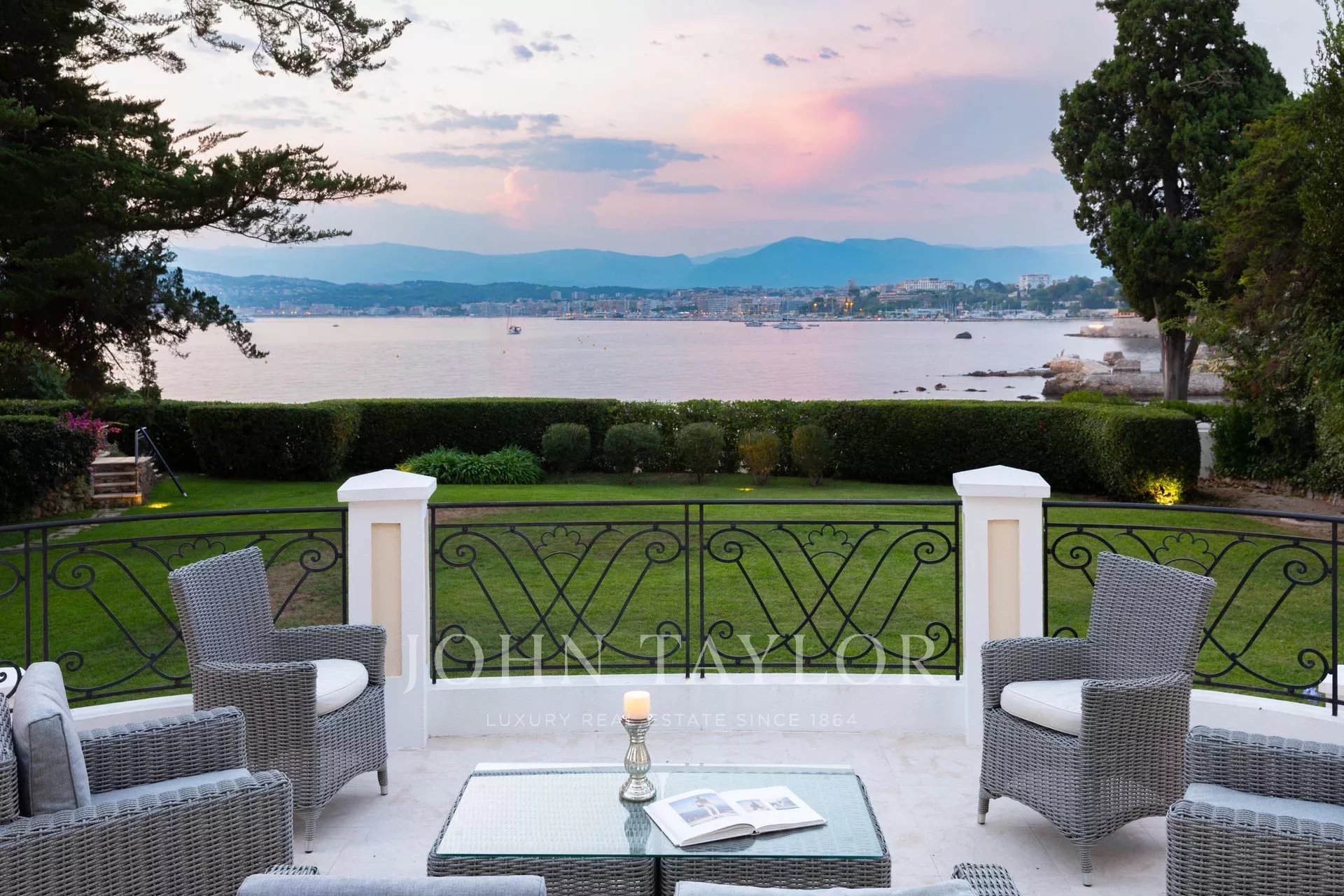 Wunderschönes Anwesen auf drei Ebenen am Rande des Boulevard du Littoral. Nur wenige Gehminuten vom Hotel Eden Roc entfernt, genießt es einen wunderschönen Blick auf die Bucht von Juan Les Pins, die Iles de Lérins und das Esterel-Gebirge. Es wurde vollständig renoviert und klimatisiert und ist von einem 9000 m2 großen, schön gestalteten Park mit Rasen, Blumen und sehr schönen Bäumen umgeben.