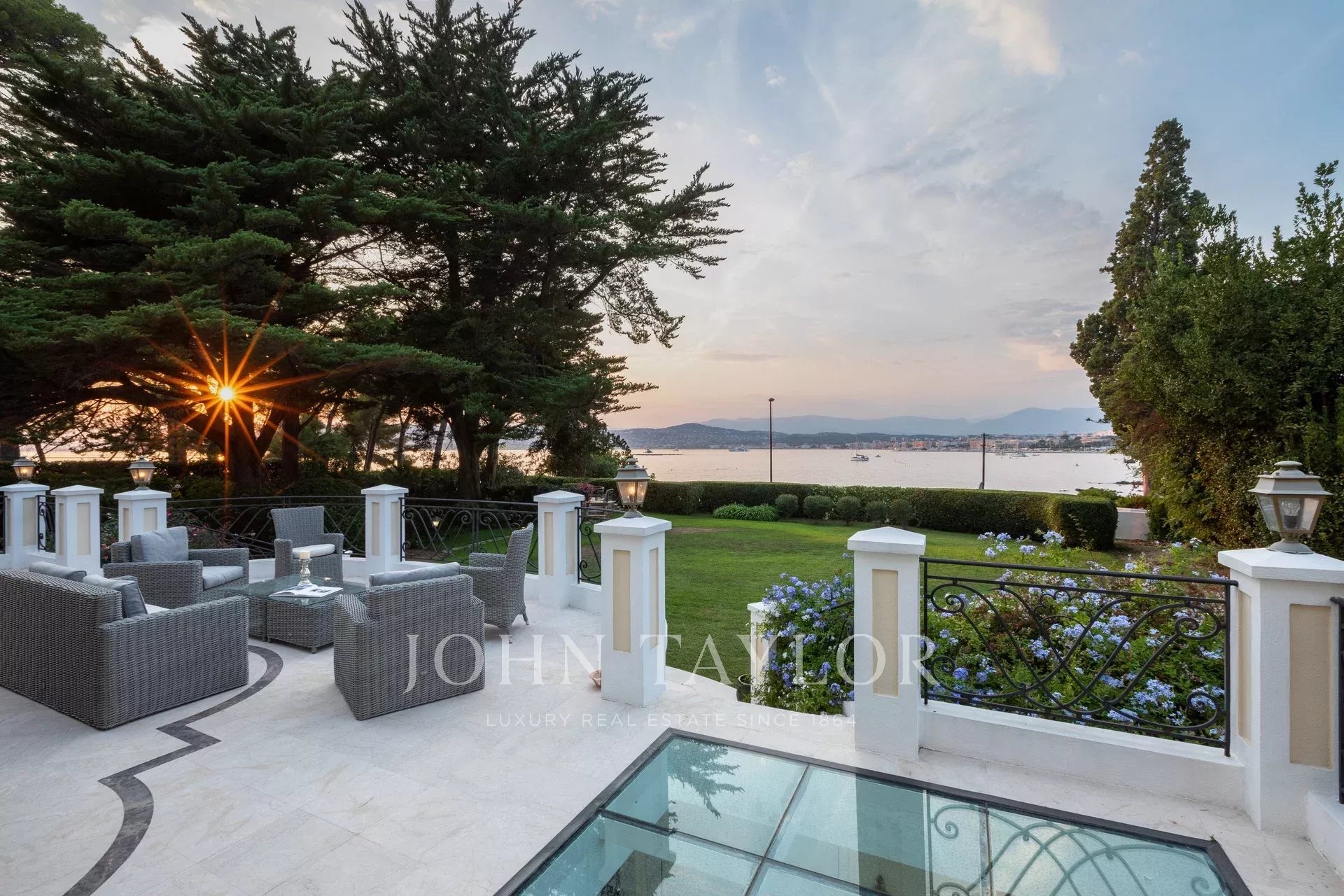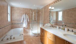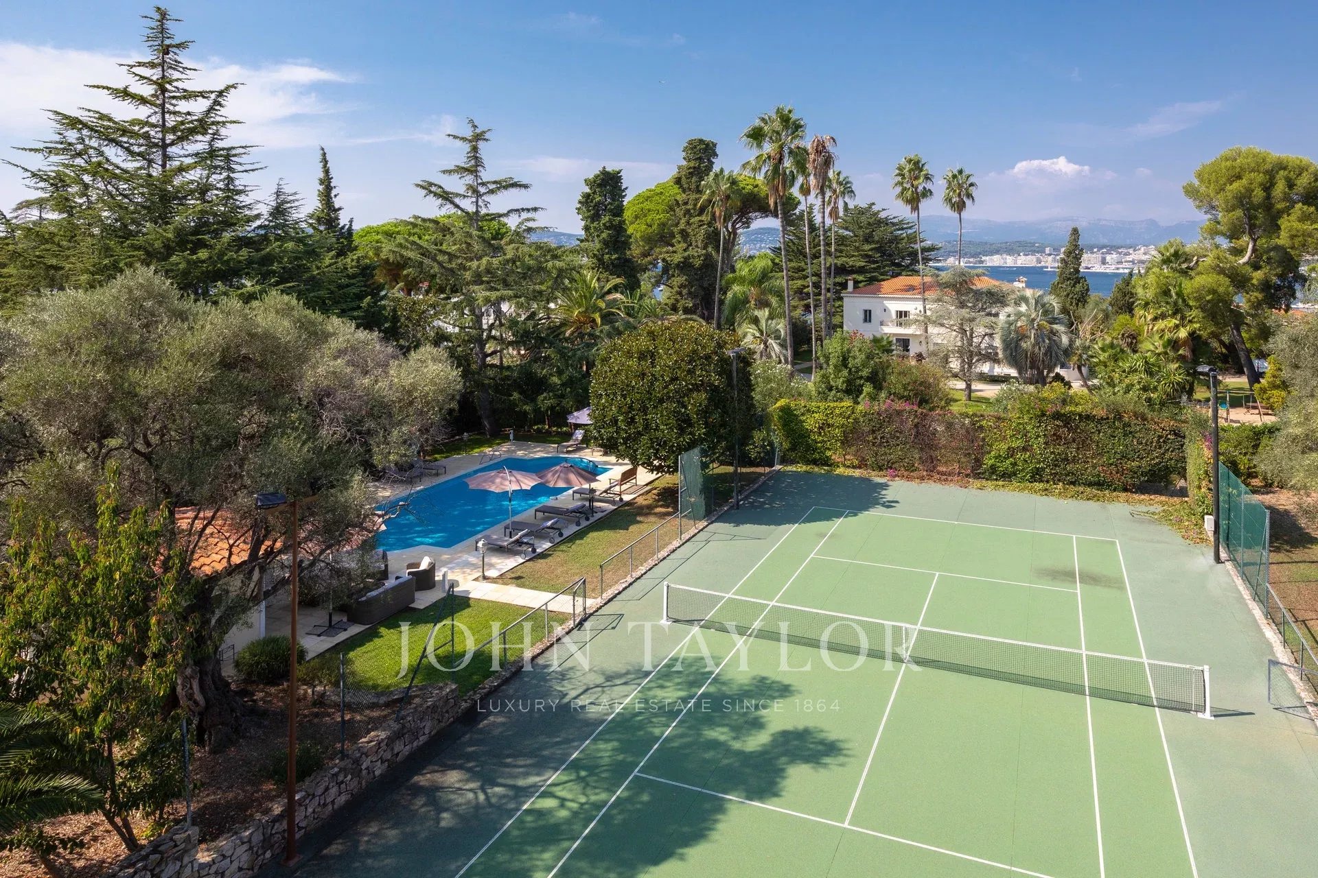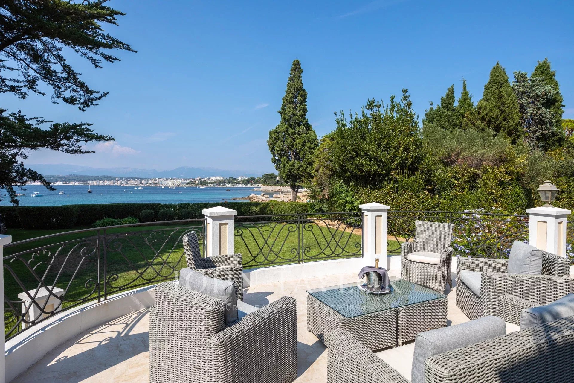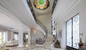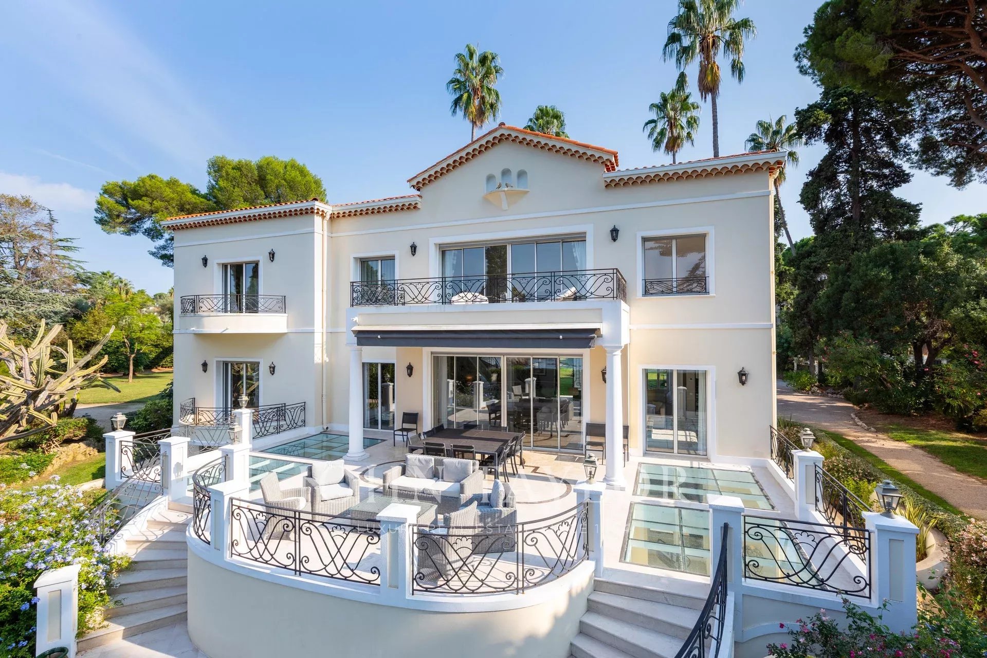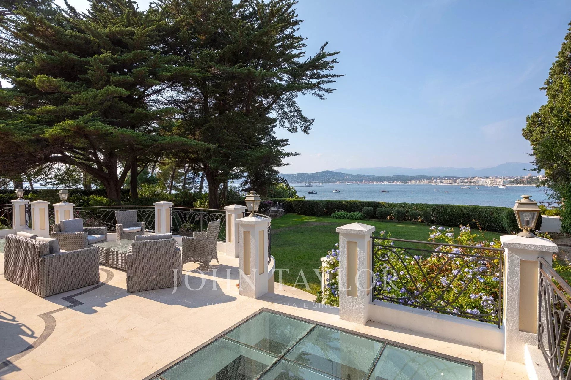 Wunderschönes Anwesen auf drei Ebenen am Rande des Boulevard du Littoral. Nur wenige Gehminuten vom Hotel Eden Roc entfernt, genießt es einen wunderschönen Blick auf die Bucht von Juan Les Pins, die Iles de Lérins und das Esterel-Gebirge. Es wurde vollständig renoviert und klimatisiert und ist von einem 9000 m2 großen, schön gestalteten Park mit Rasen, Blumen und sehr schönen Bäumen umgeben.