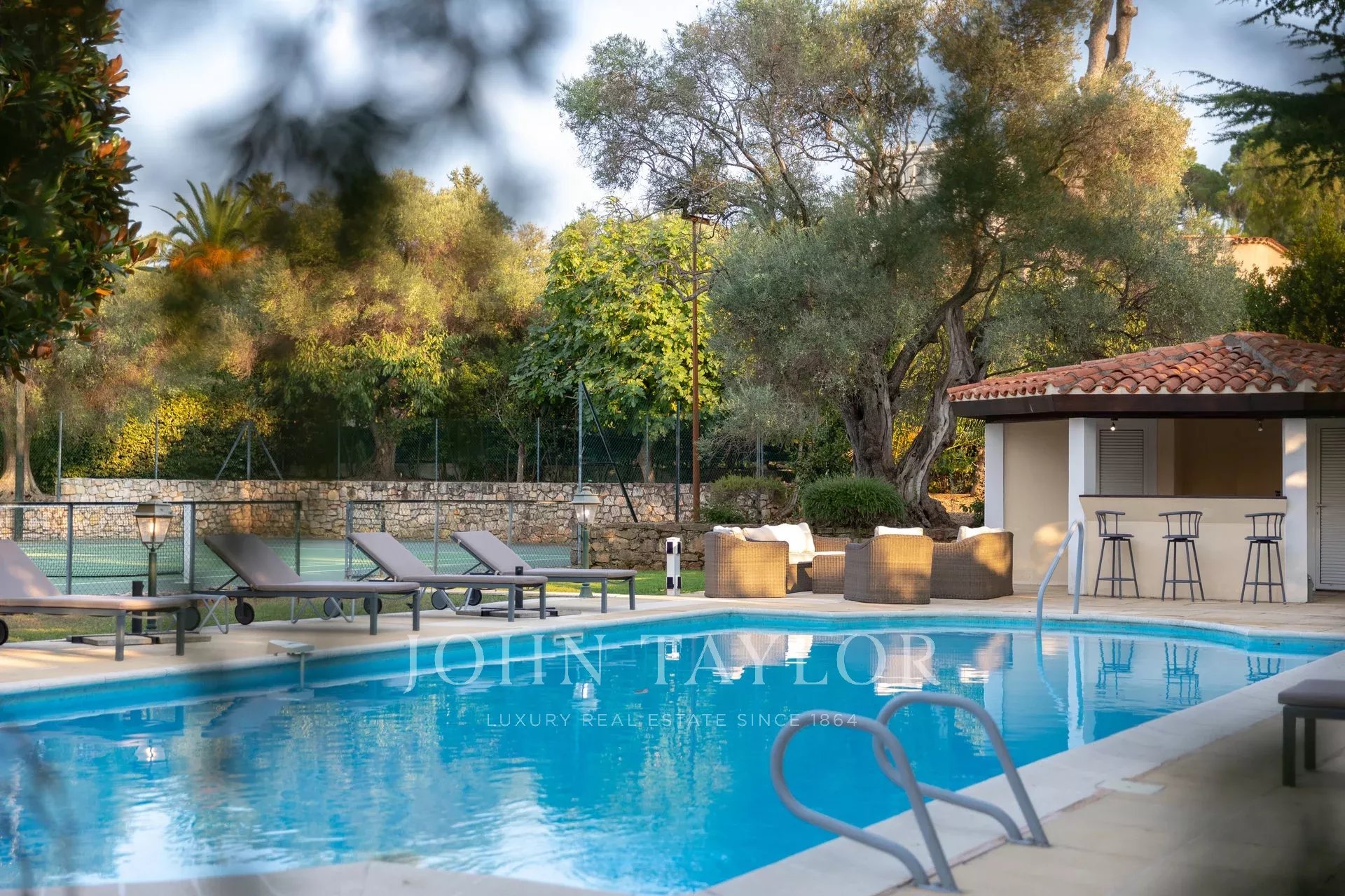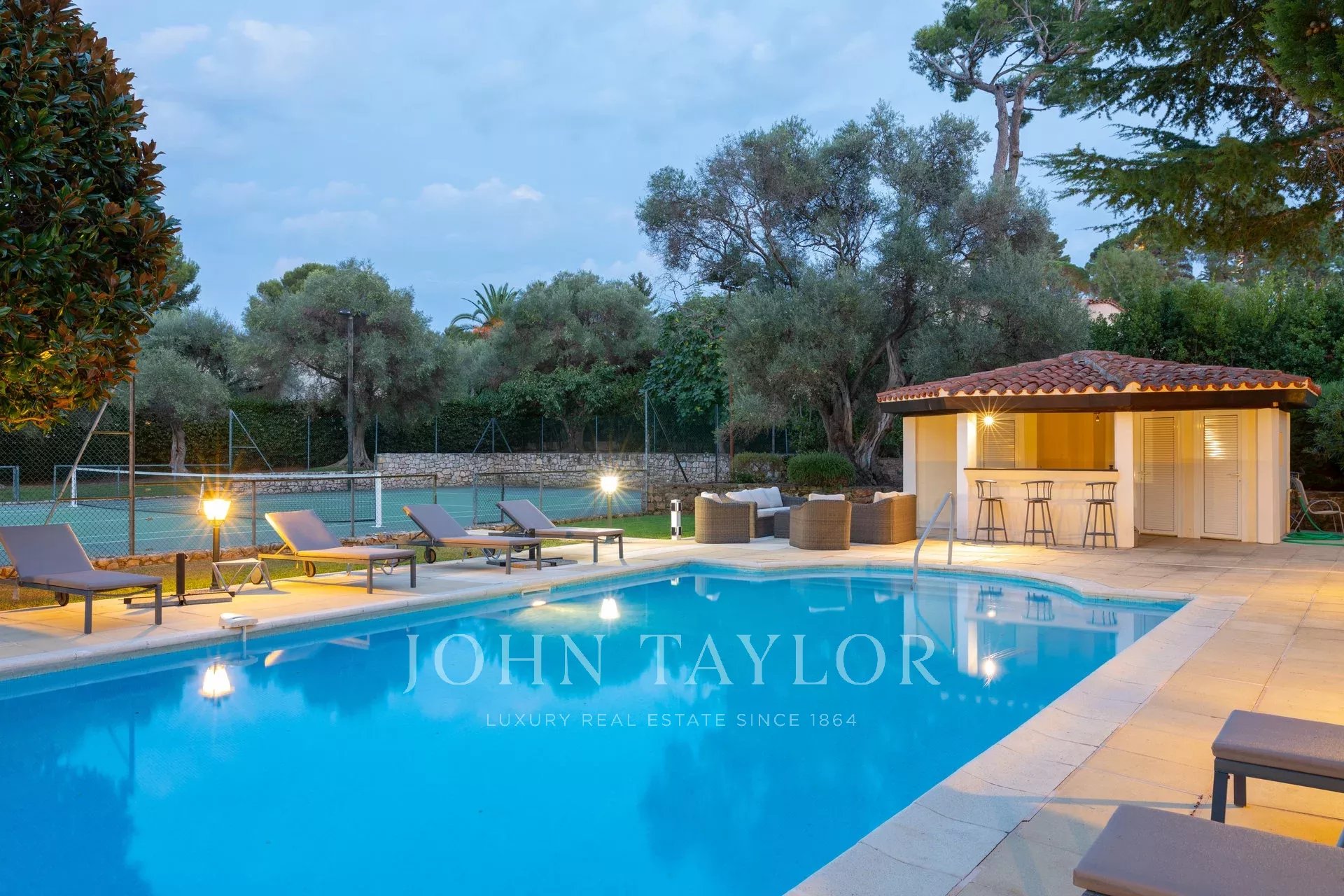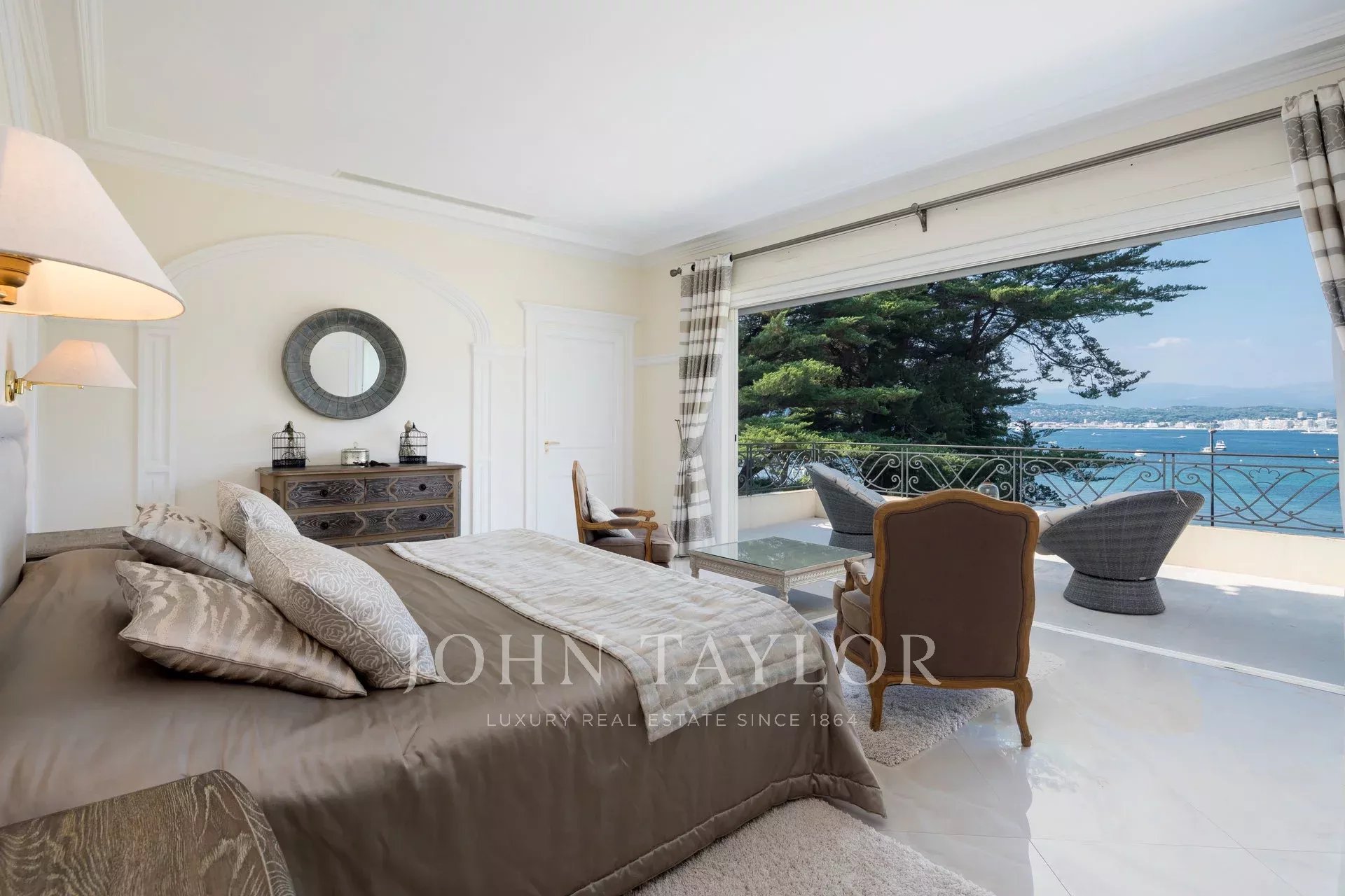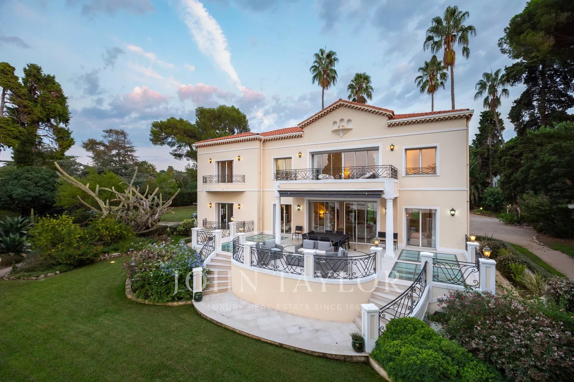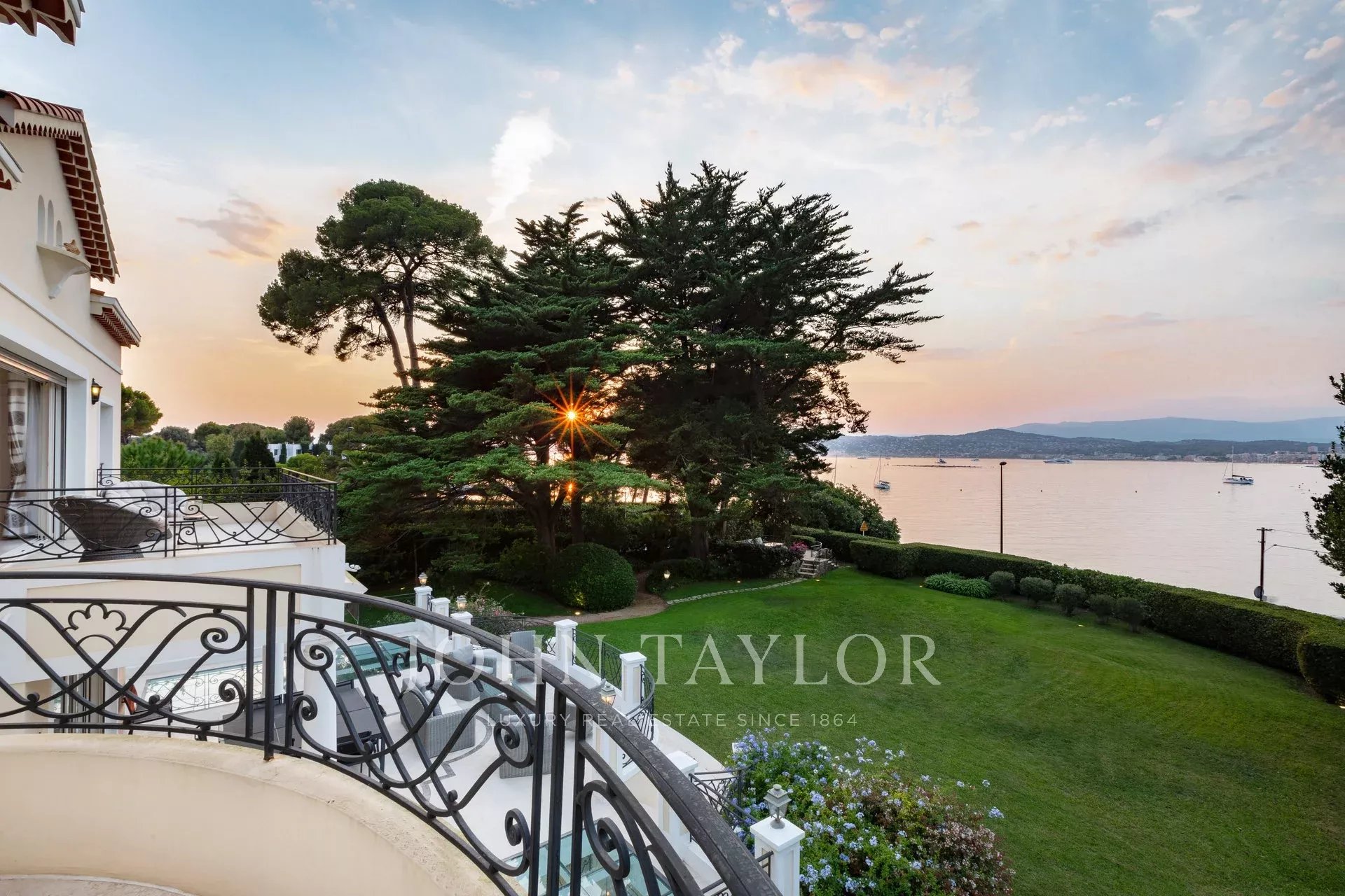 Wunderschönes Anwesen auf drei Ebenen am Rande des Boulevard du Littoral. Nur wenige Gehminuten vom Hotel Eden Roc entfernt, genießt es einen wunderschönen Blick auf die Bucht von Juan Les Pins, die Iles de Lérins und das Esterel-Gebirge. Es wurde vollständig renoviert und klimatisiert und ist von einem 9000 m2 großen, schön gestalteten Park mit Rasen, Blumen und sehr schönen Bäumen umgeben.