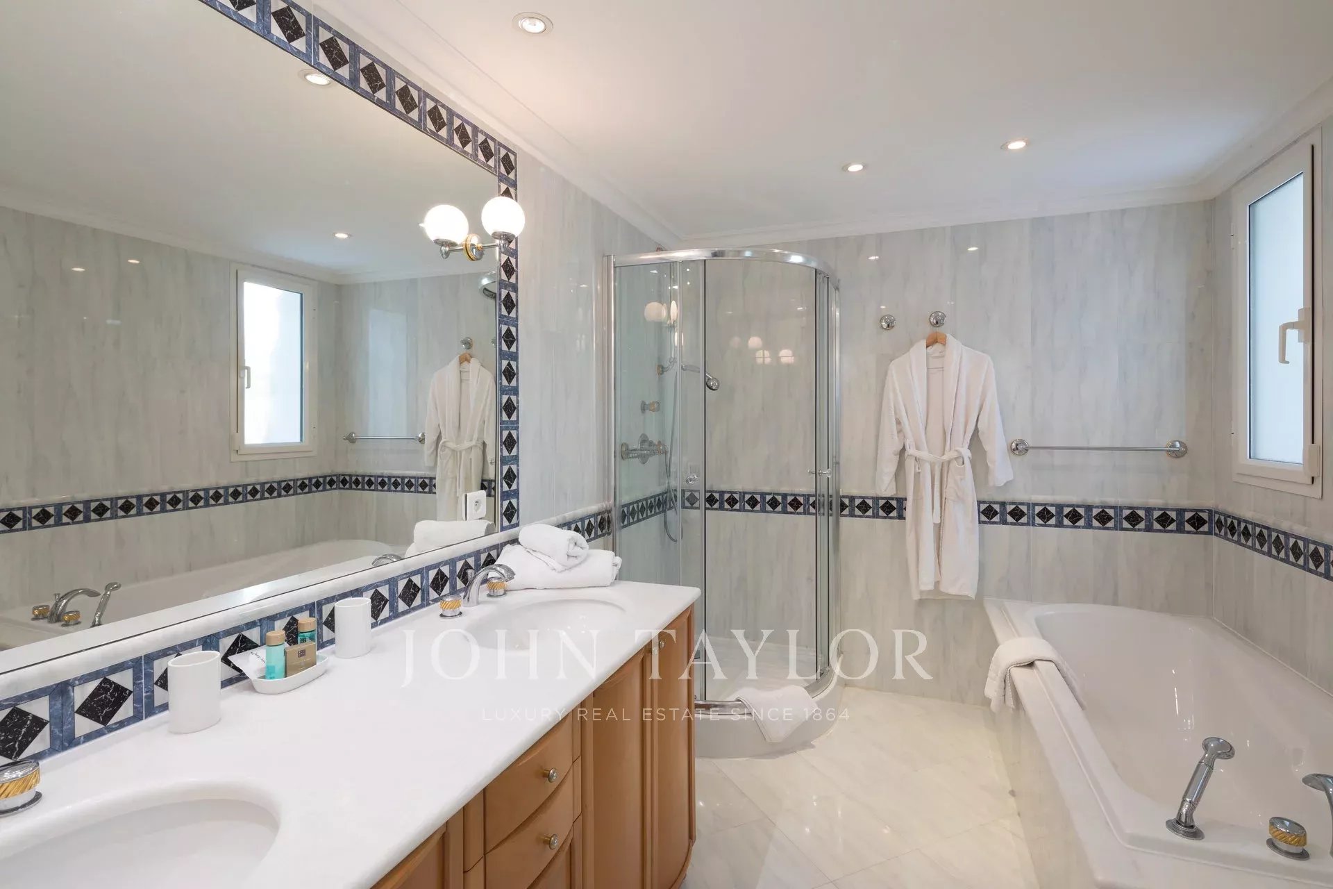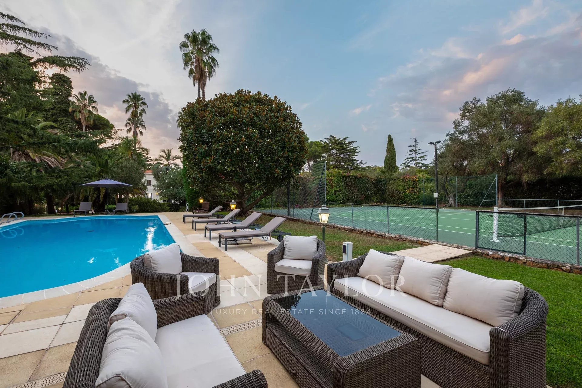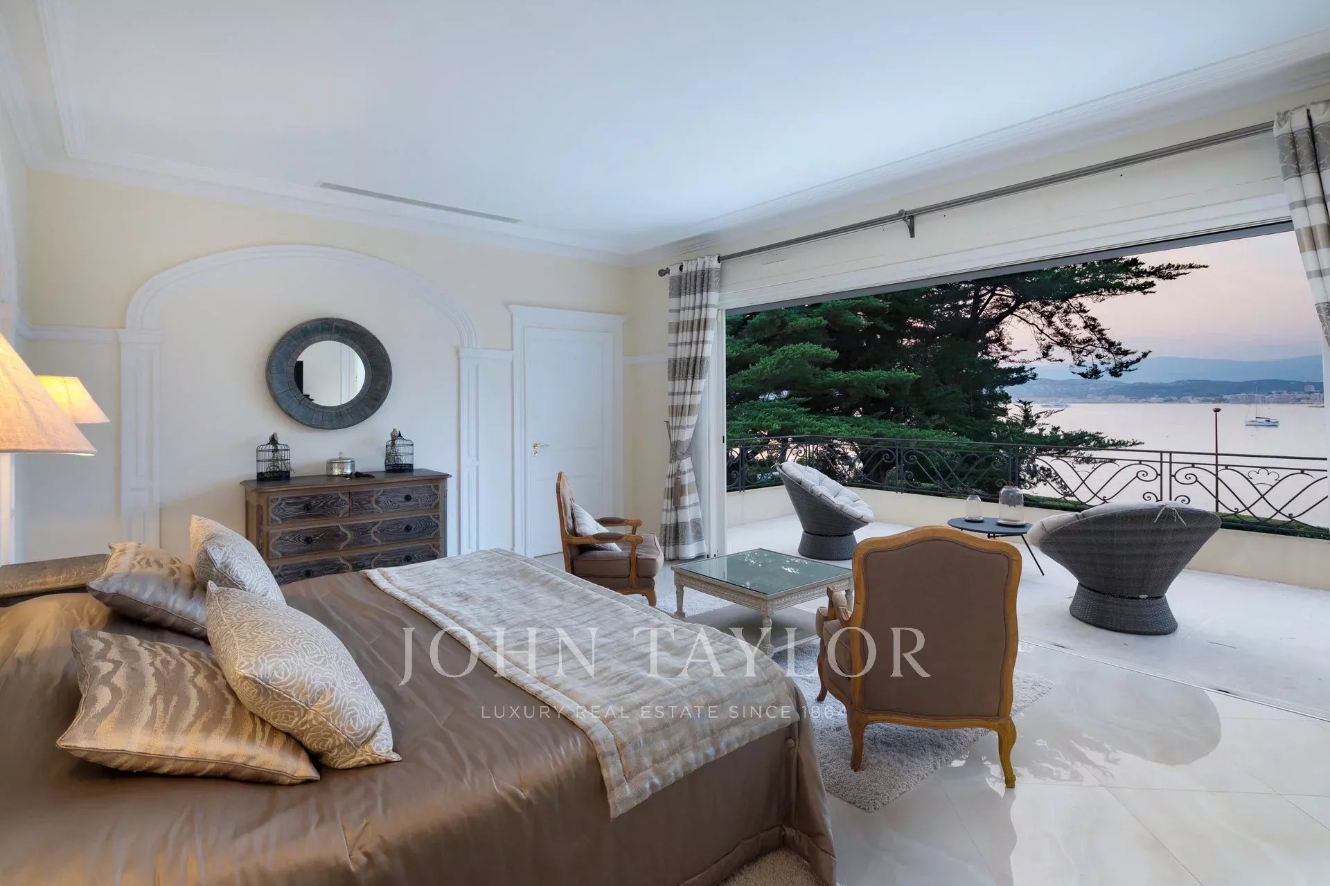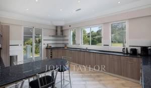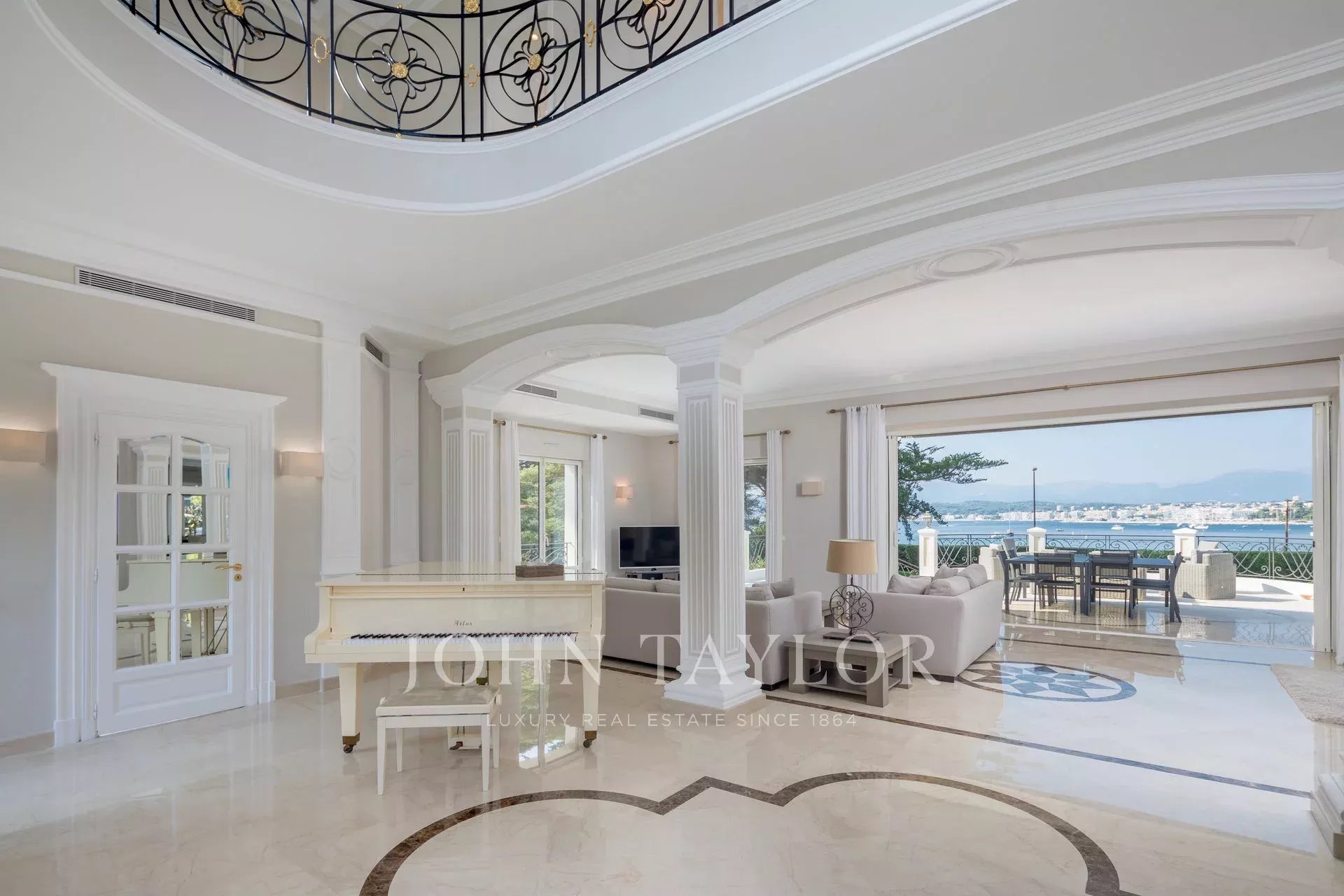Wunderschönes Anwesen auf drei Ebenen am Rande des Boulevard du Littoral. Nur wenige Gehminuten vom Hotel Eden Roc entfernt, genießt es einen wunderschönen Blick auf die Bucht von Juan Les Pins, die Iles de Lérins und das Esterel-Gebirge. Es wurde vollständig renoviert und klimatisiert und ist von einem 9000 m2 großen, schön gestalteten Park mit Rasen, Blumen und sehr schönen Bäumen umgeben.