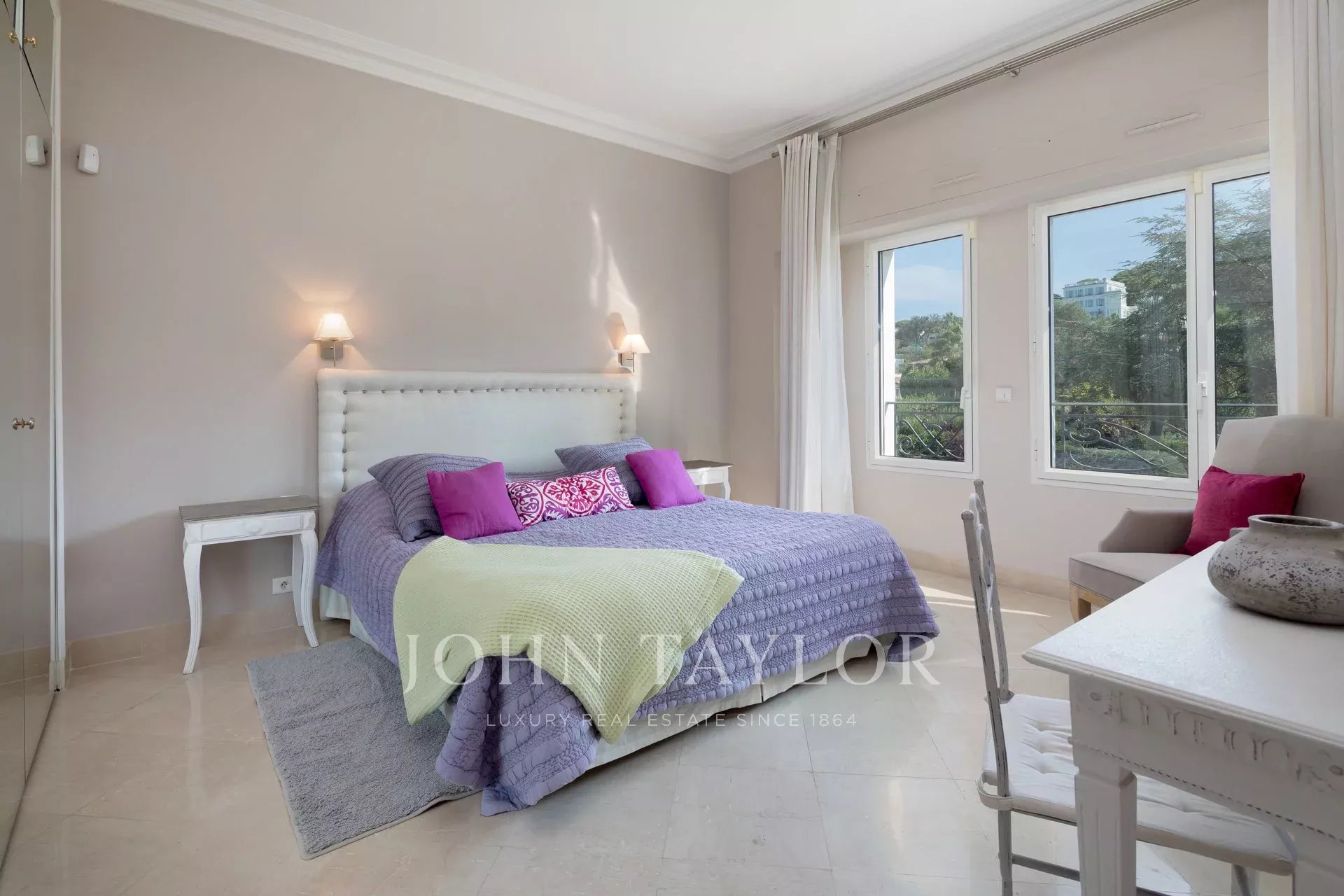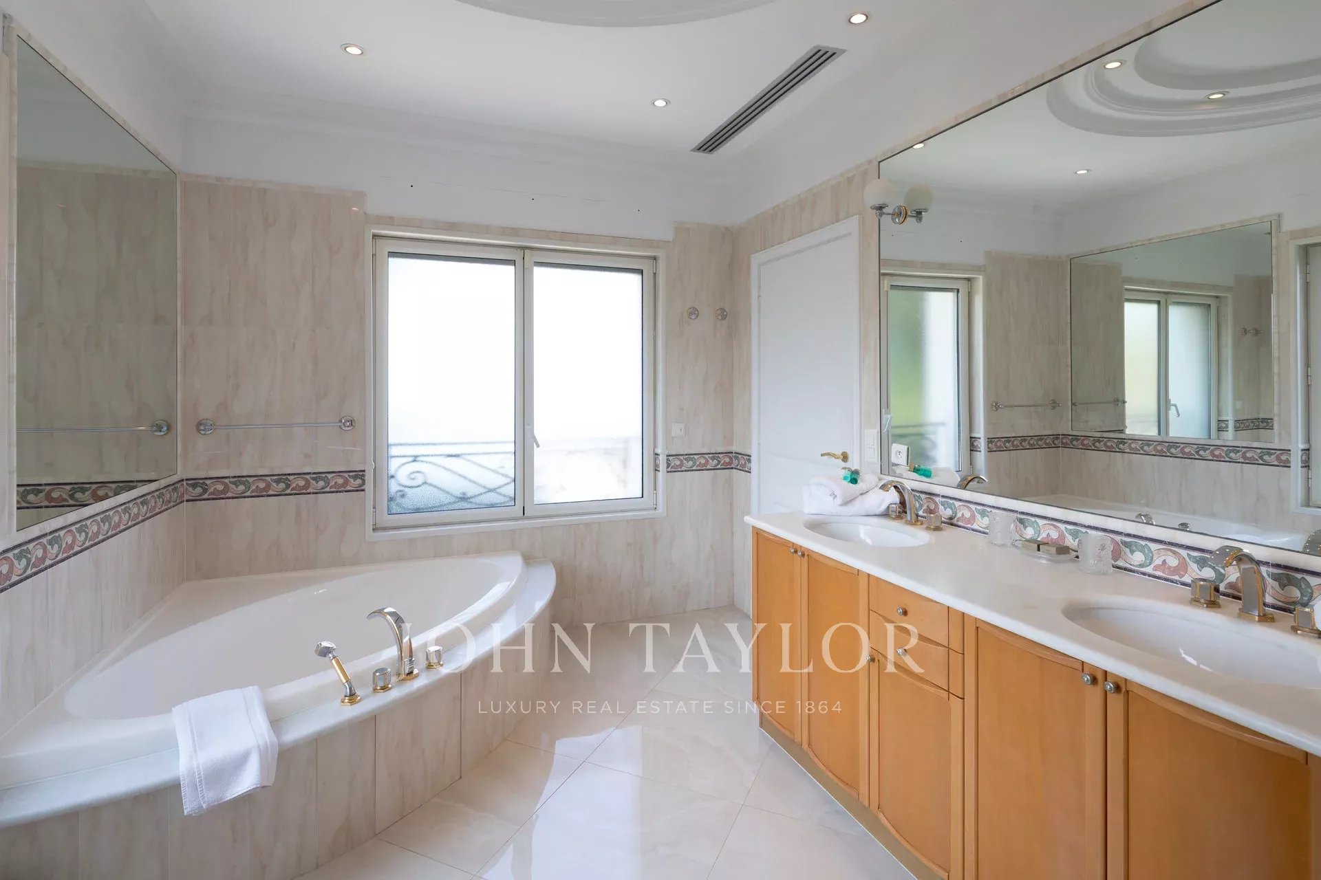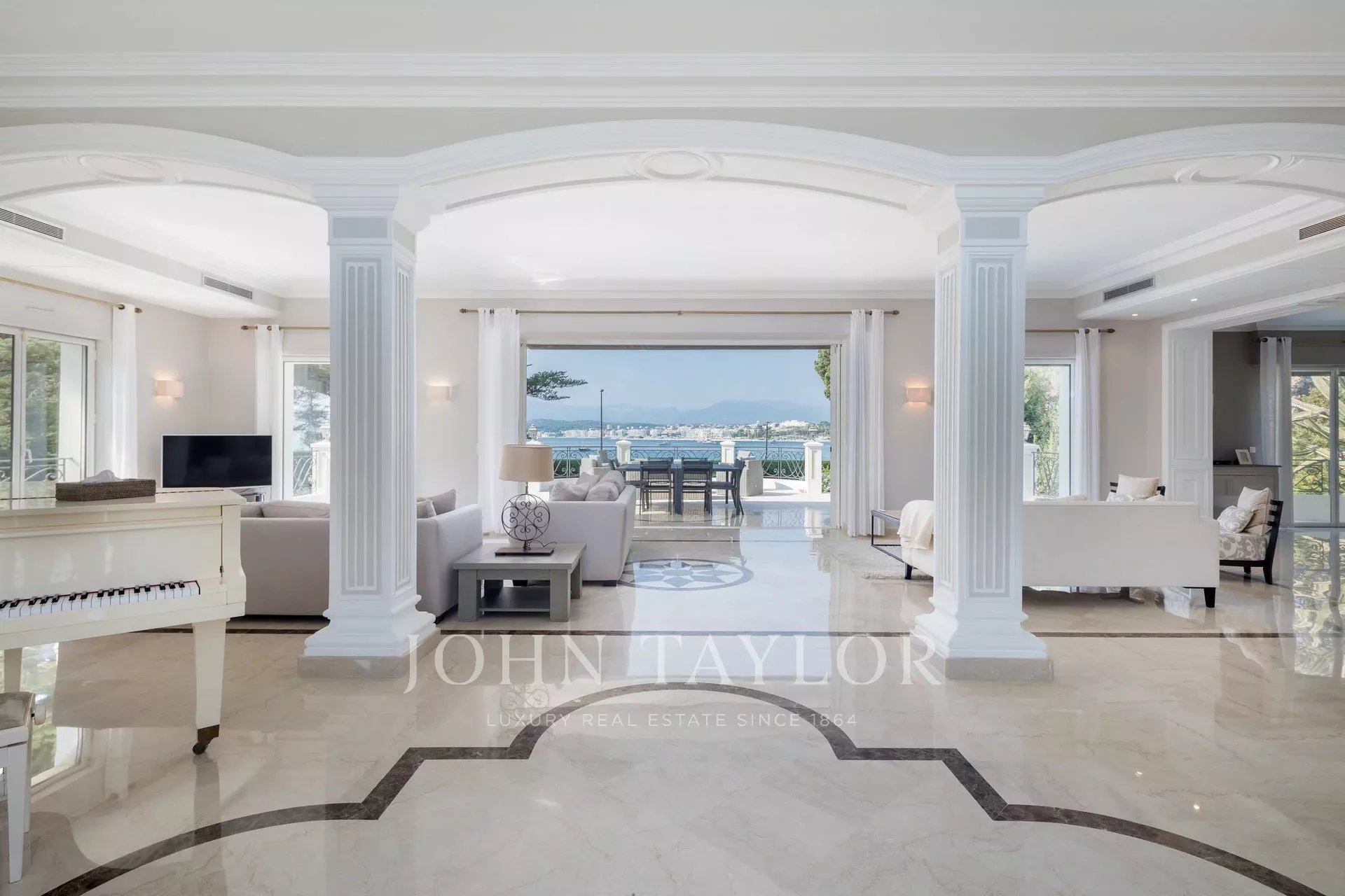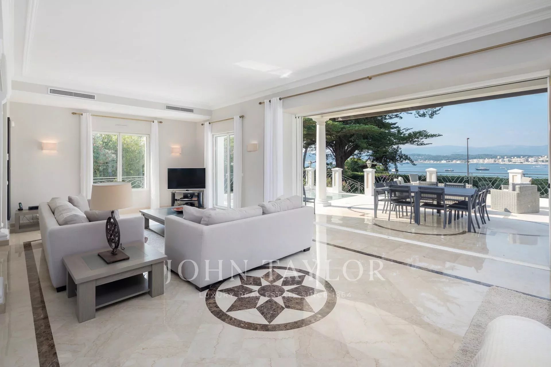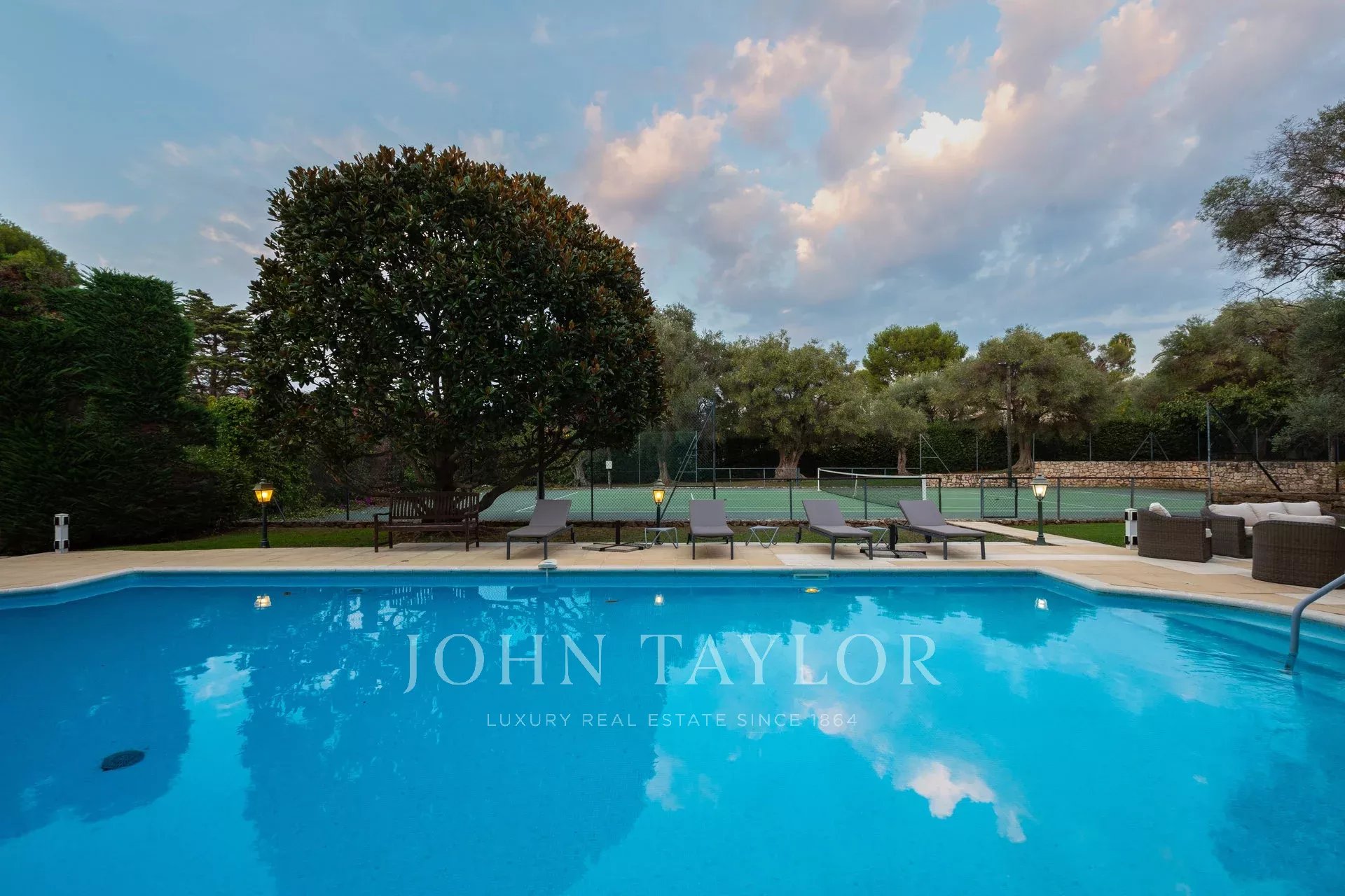 Wunderschönes Anwesen auf drei Ebenen am Rande des Boulevard du Littoral. Nur wenige Gehminuten vom Hotel Eden Roc entfernt, genießt es einen wunderschönen Blick auf die Bucht von Juan Les Pins, die Iles de Lérins und das Esterel-Gebirge. Es wurde vollständig renoviert und klimatisiert und ist von einem 9000 m2 großen, schön gestalteten Park mit Rasen, Blumen und sehr schönen Bäumen umgeben.