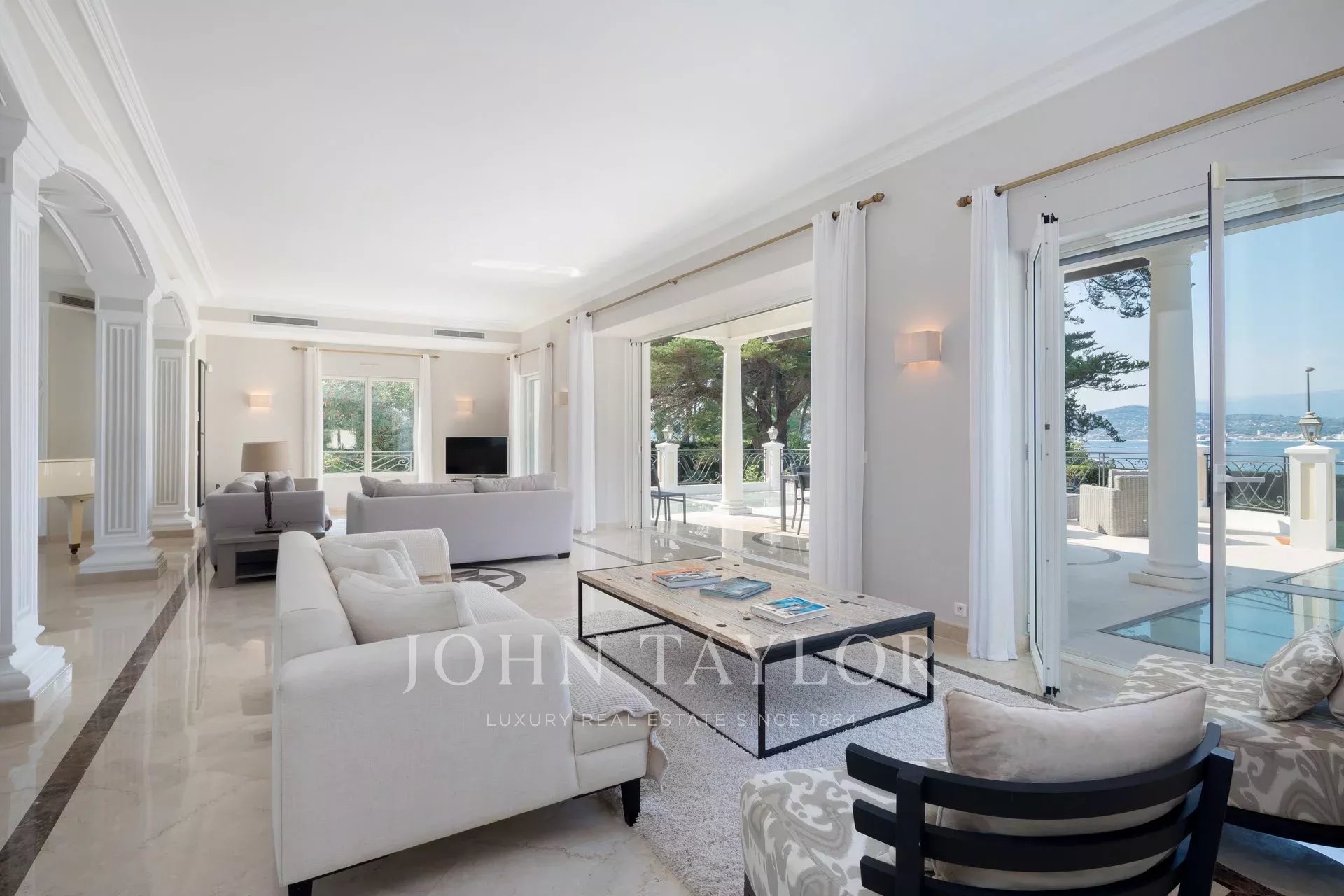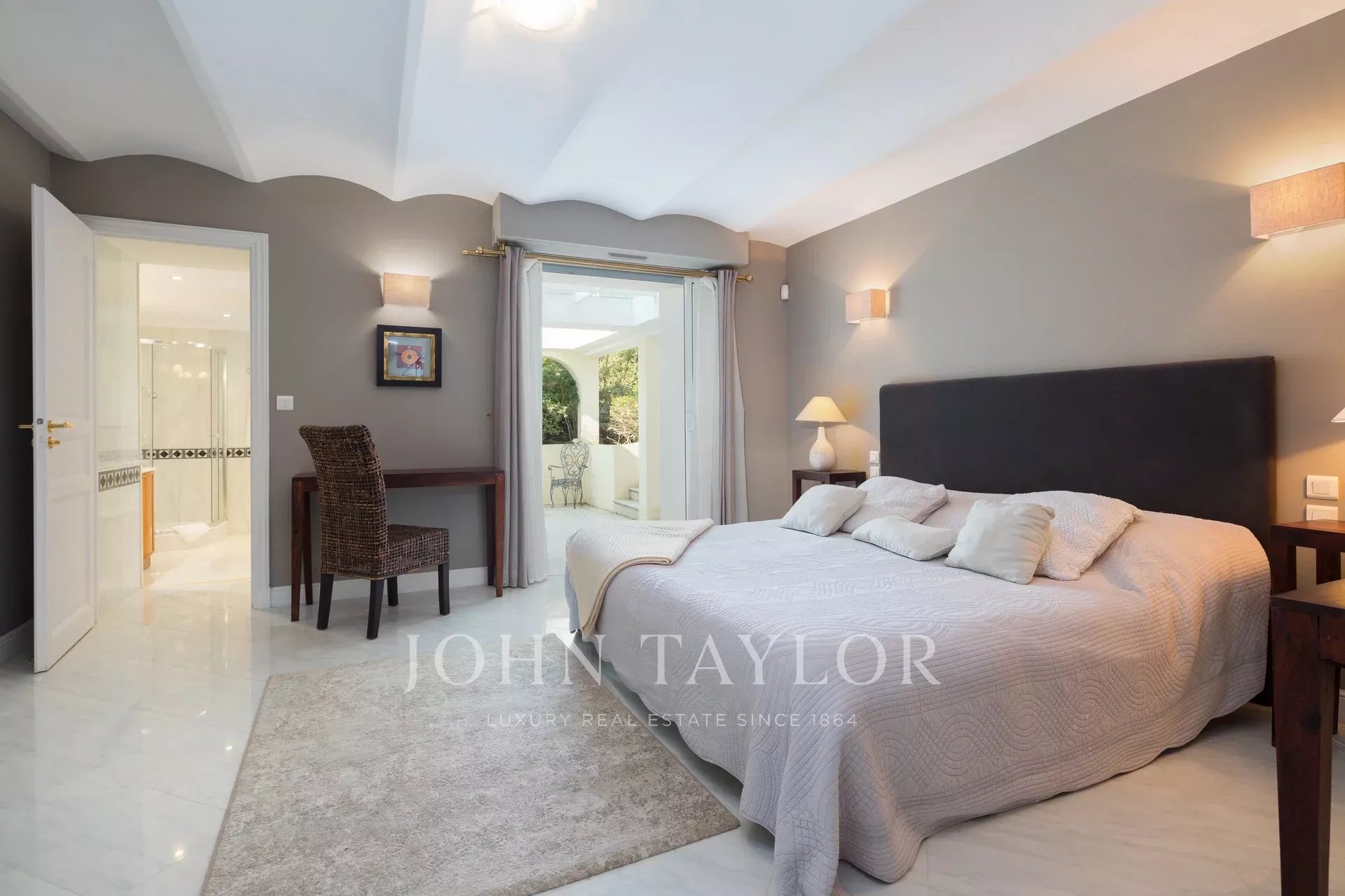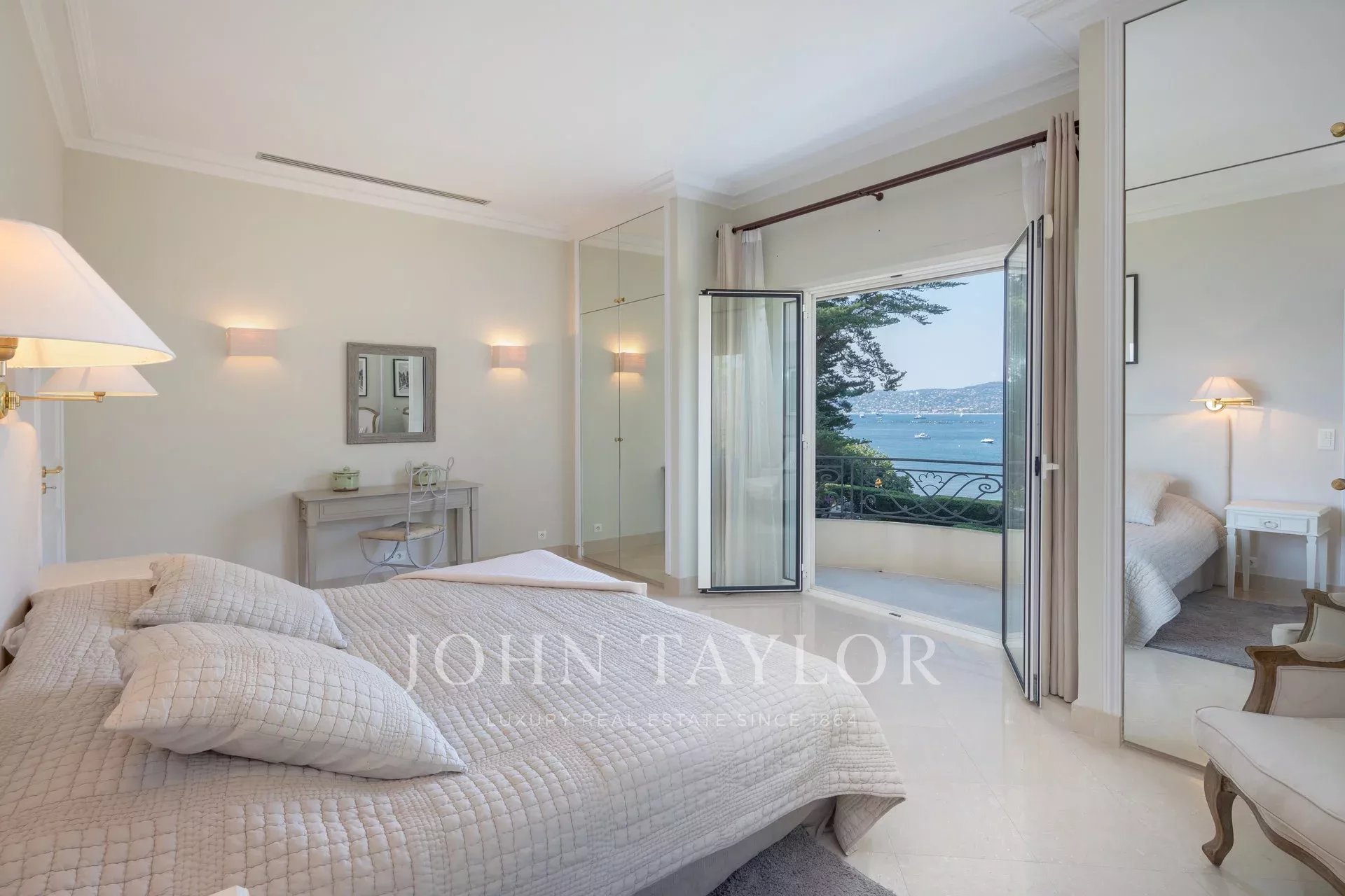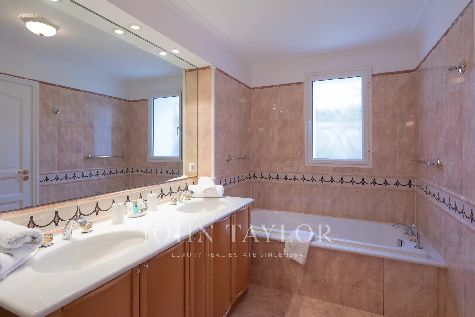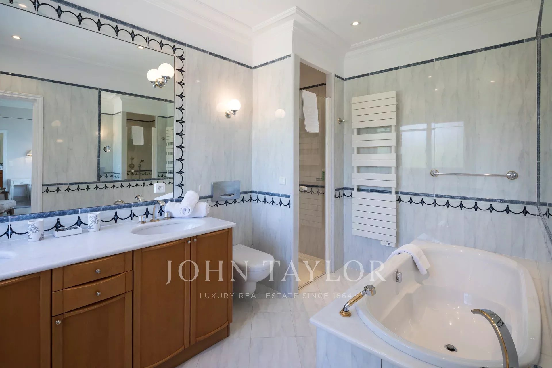 Wunderschönes Anwesen auf drei Ebenen am Rande des Boulevard du Littoral. Nur wenige Gehminuten vom Hotel Eden Roc entfernt, genießt es einen wunderschönen Blick auf die Bucht von Juan Les Pins, die Iles de Lérins und das Esterel-Gebirge. Es wurde vollständig renoviert und klimatisiert und ist von einem 9000 m2 großen, schön gestalteten Park mit Rasen, Blumen und sehr schönen Bäumen umgeben.