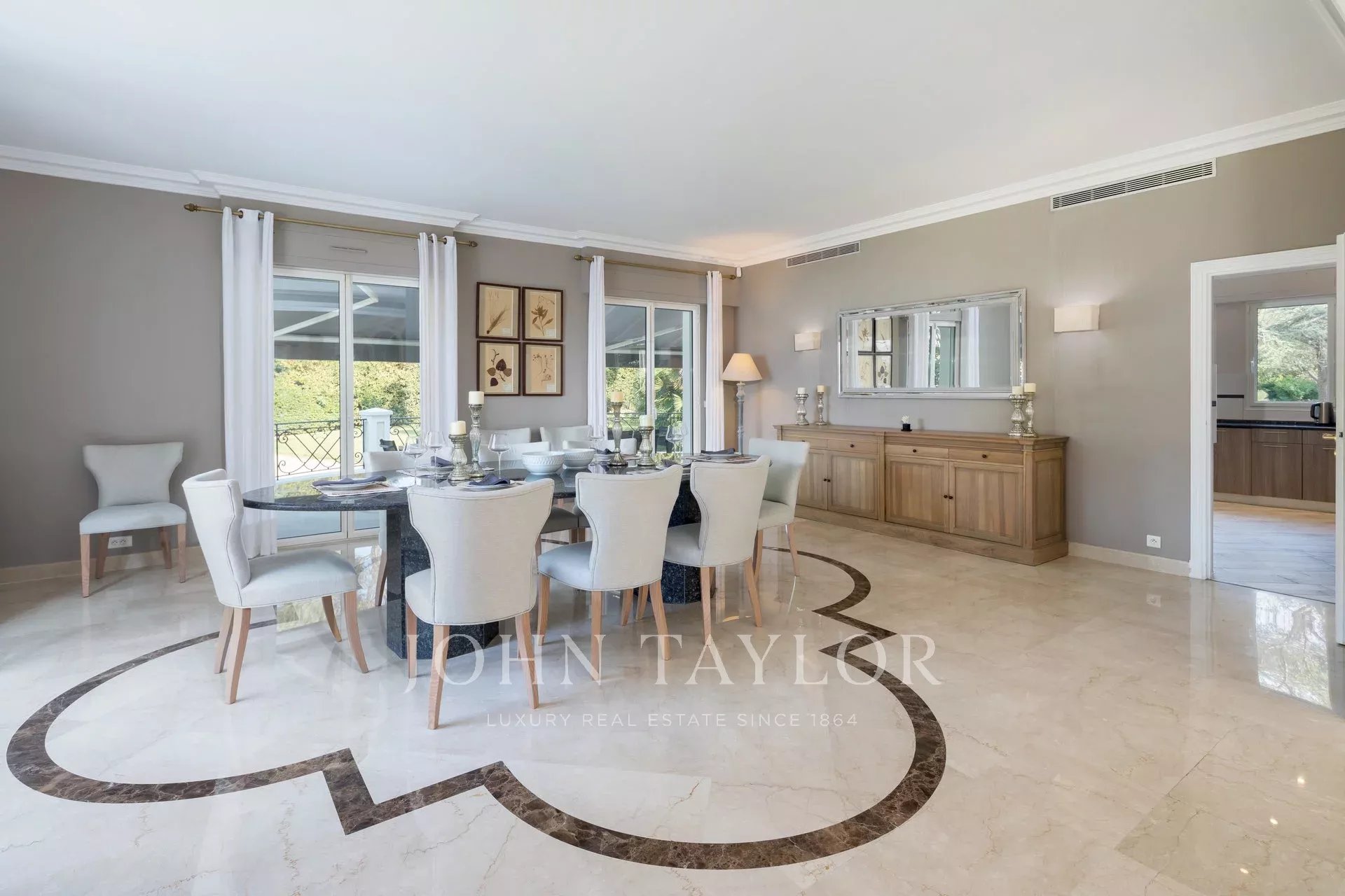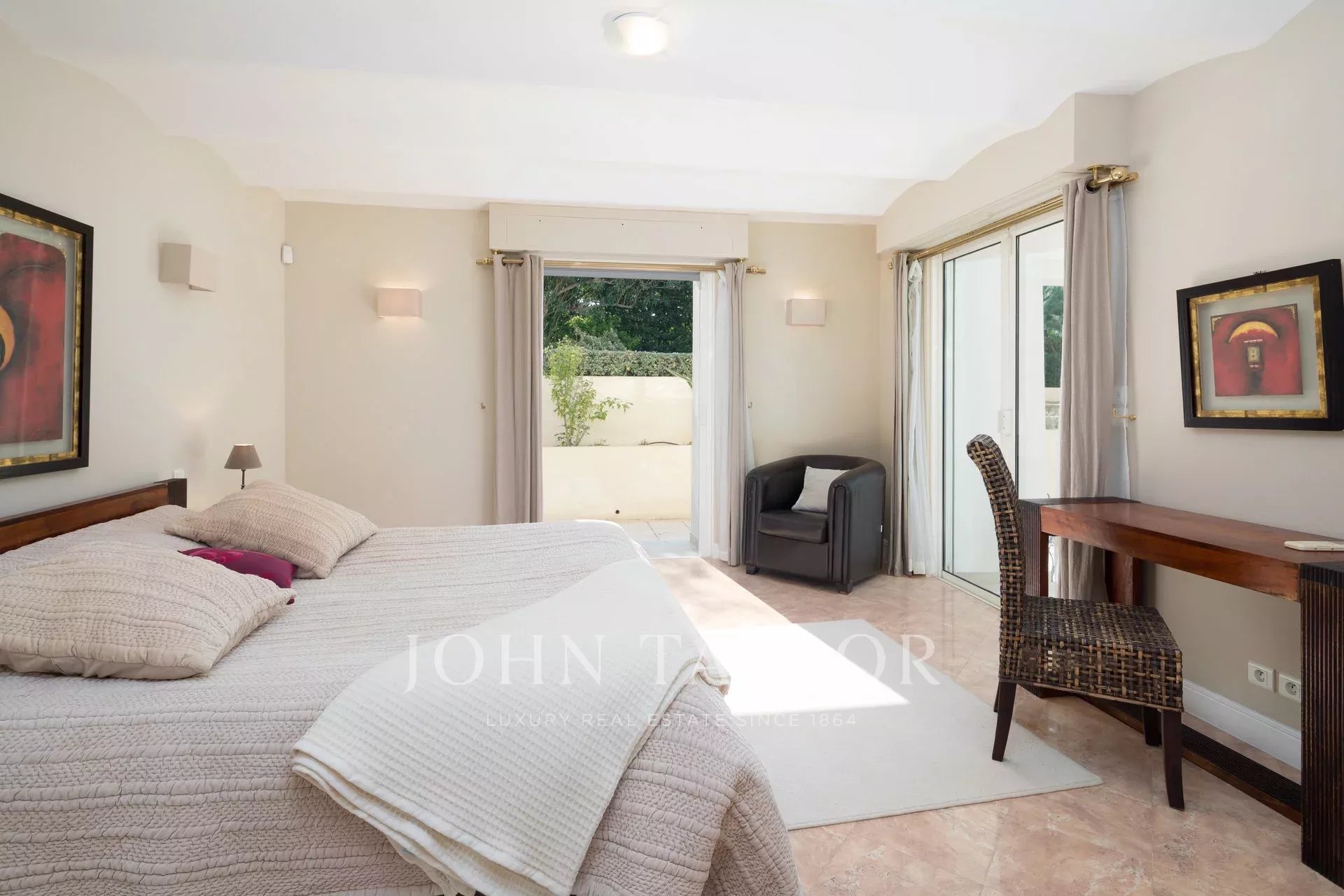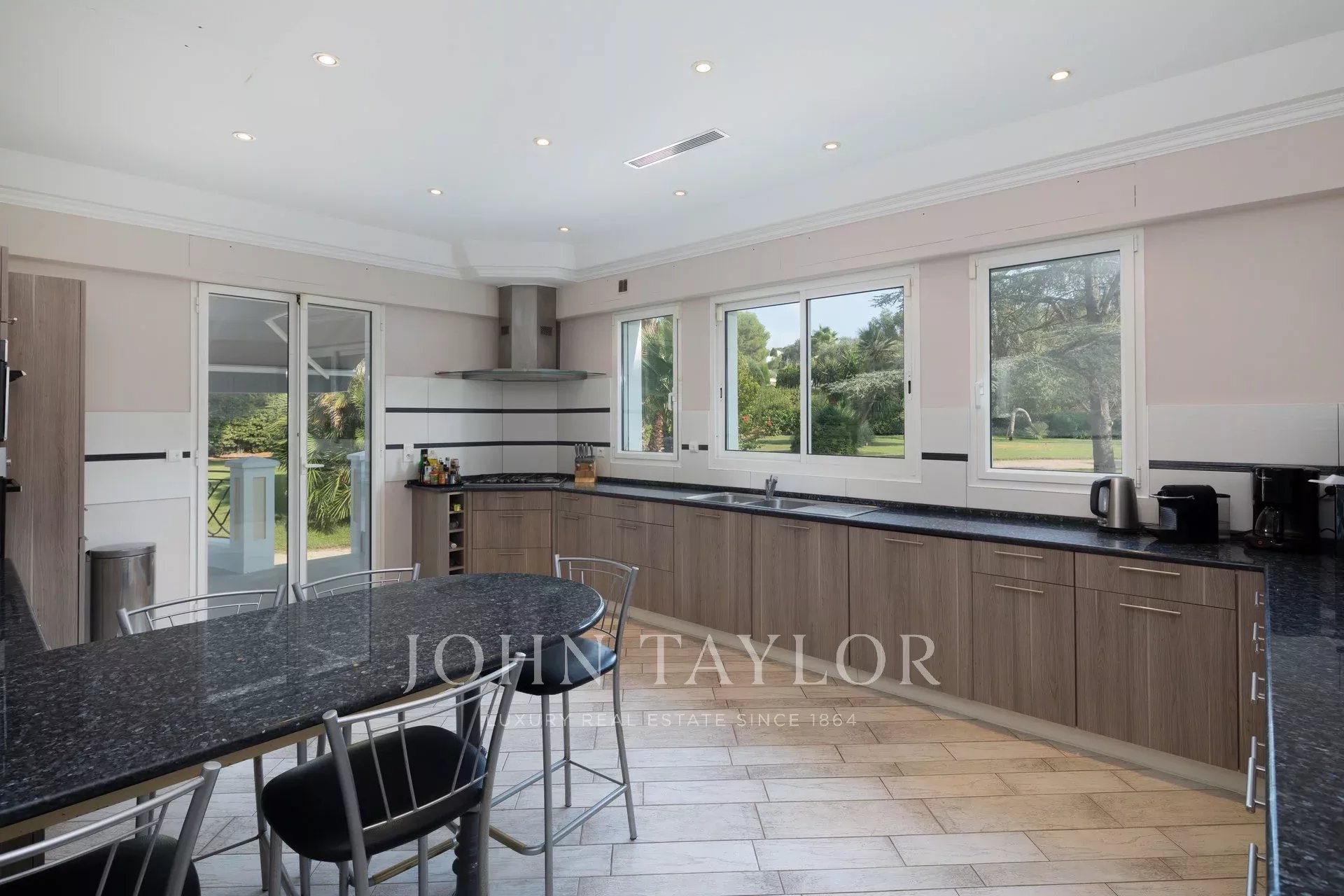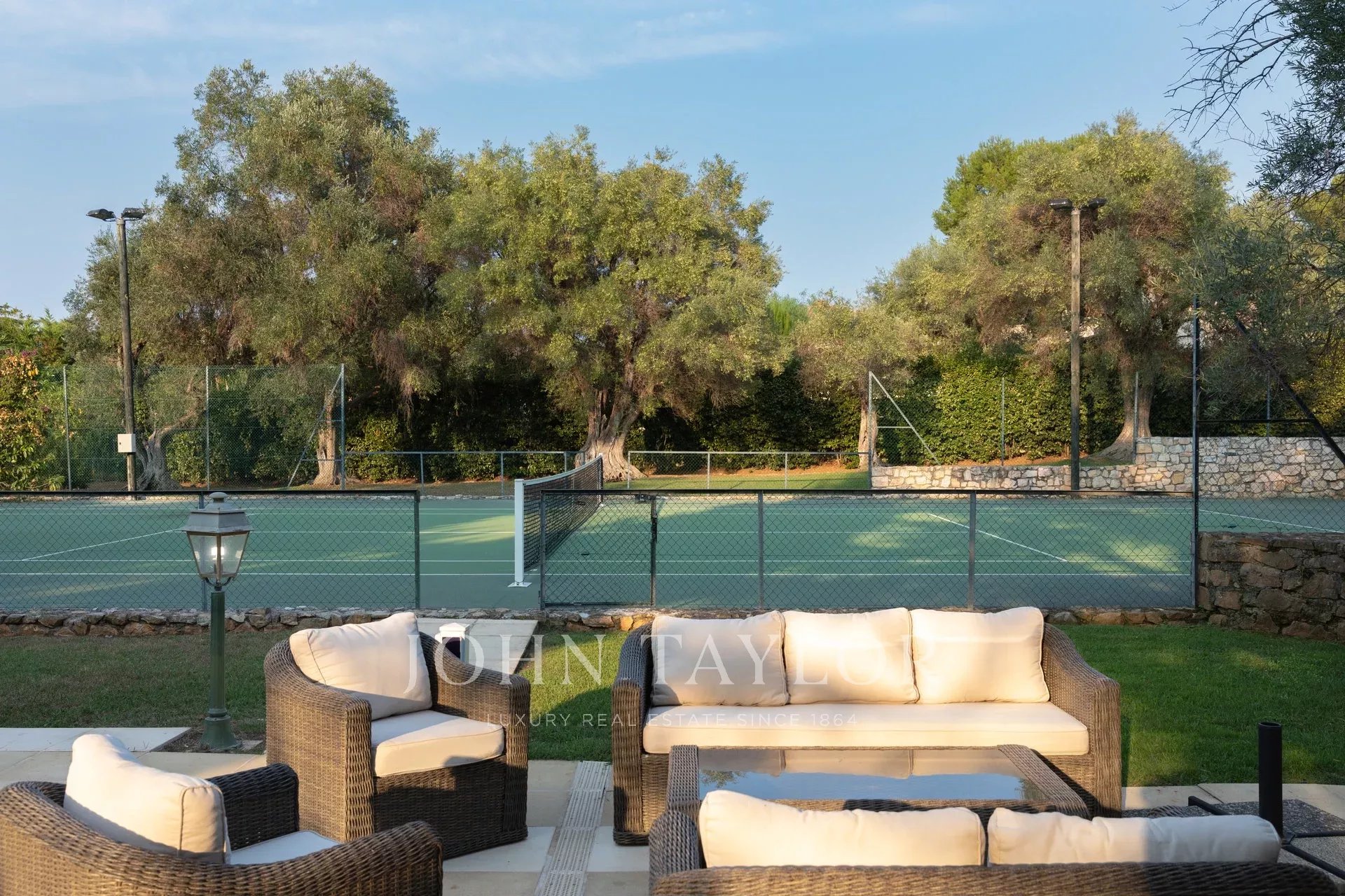 Wunderschönes Anwesen auf drei Ebenen am Rande des Boulevard du Littoral. Nur wenige Gehminuten vom Hotel Eden Roc entfernt, genießt es einen wunderschönen Blick auf die Bucht von Juan Les Pins, die Iles de Lérins und das Esterel-Gebirge. Es wurde vollständig renoviert und klimatisiert und ist von einem 9000 m2 großen, schön gestalteten Park mit Rasen, Blumen und sehr schönen Bäumen umgeben.