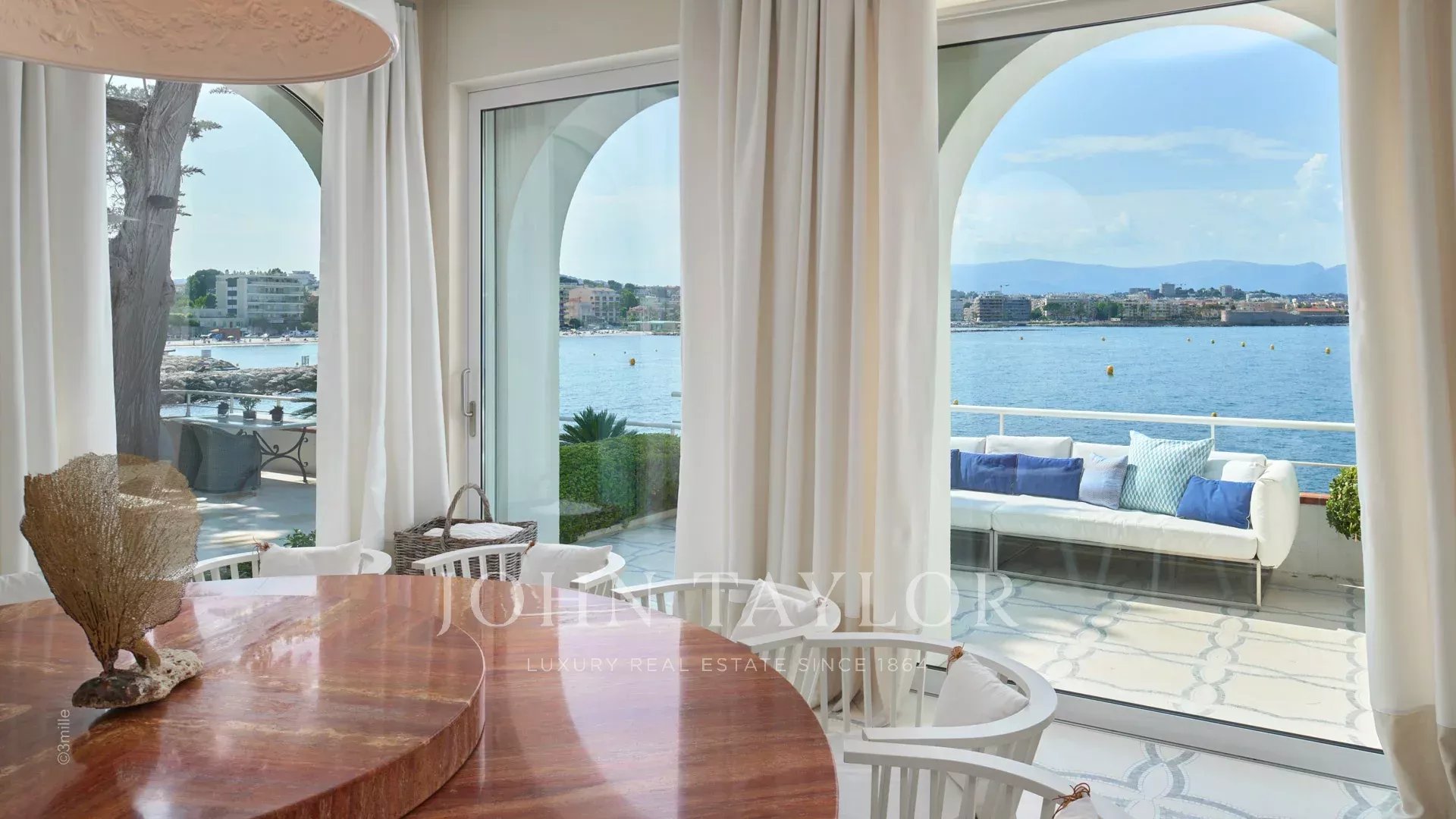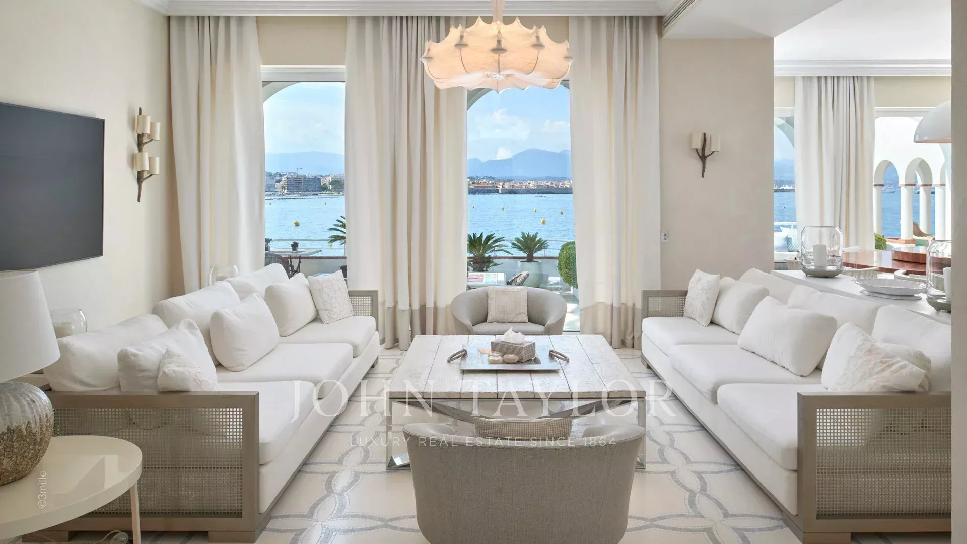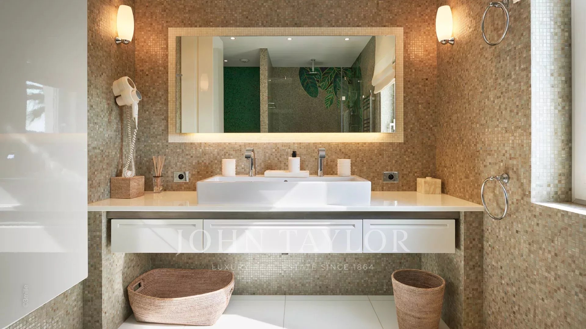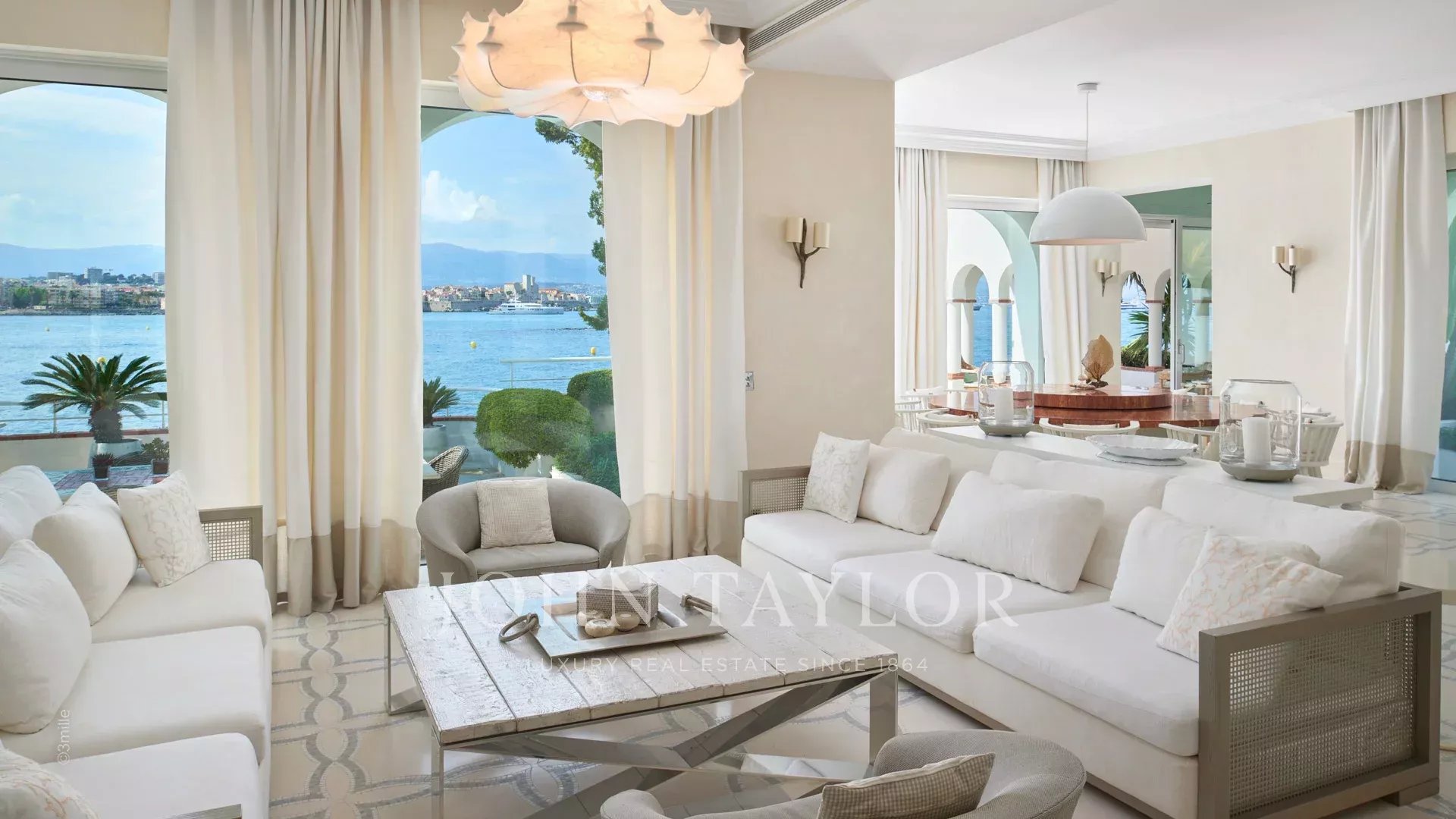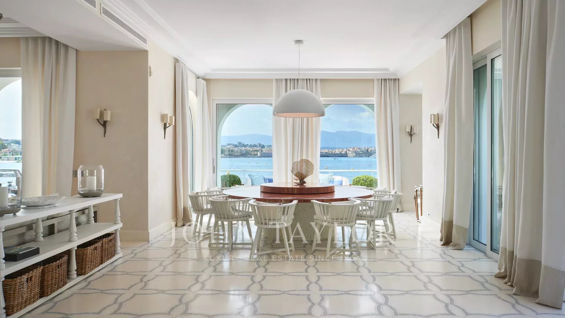 Der Eingang führt Sie in einen großen Empfangsbereich, der sich zu einer herrlichen Terrasse mit Blick auf das Meer und das alte Antibes öffnet und aus einem Wohn- und Esszimmer besteht, das 12 Personen Platz bietet.