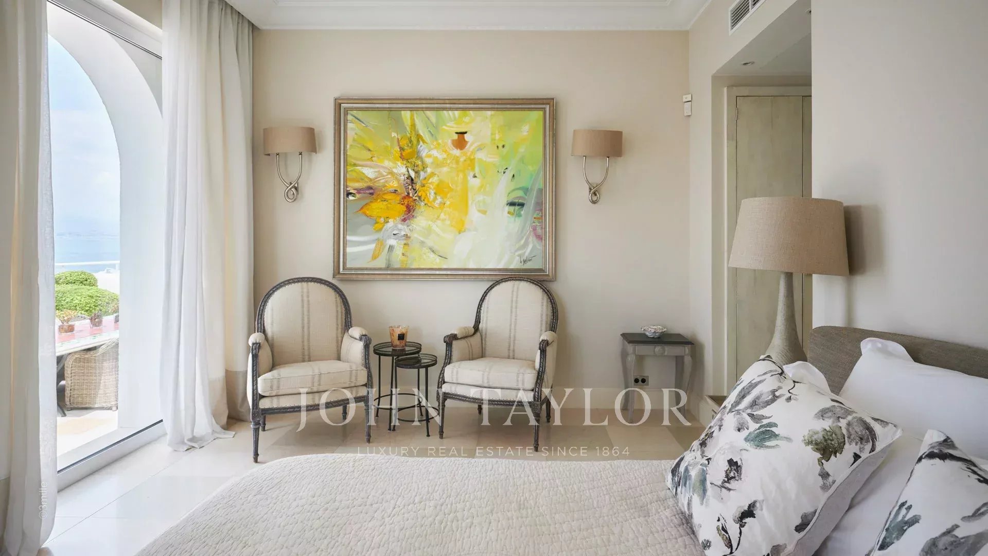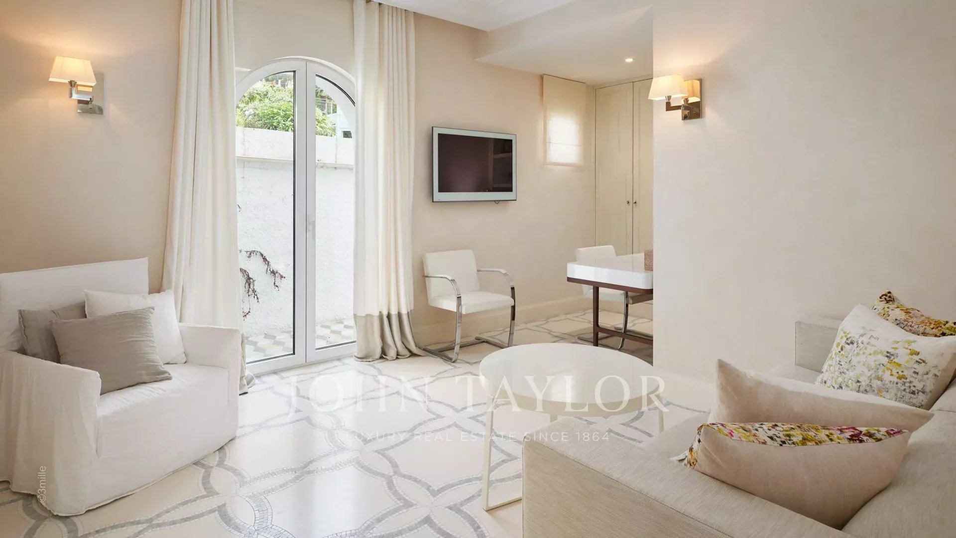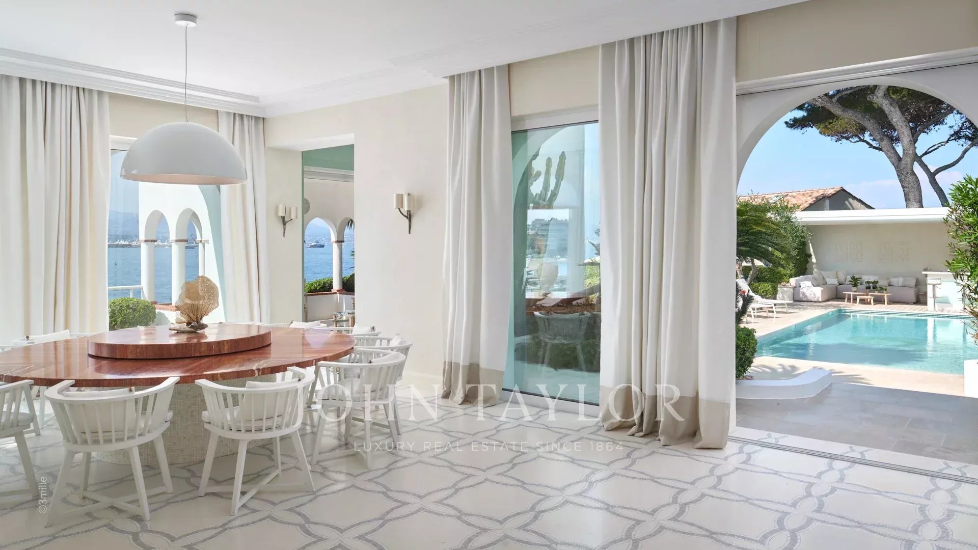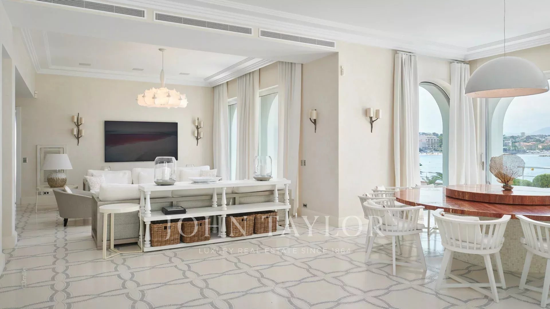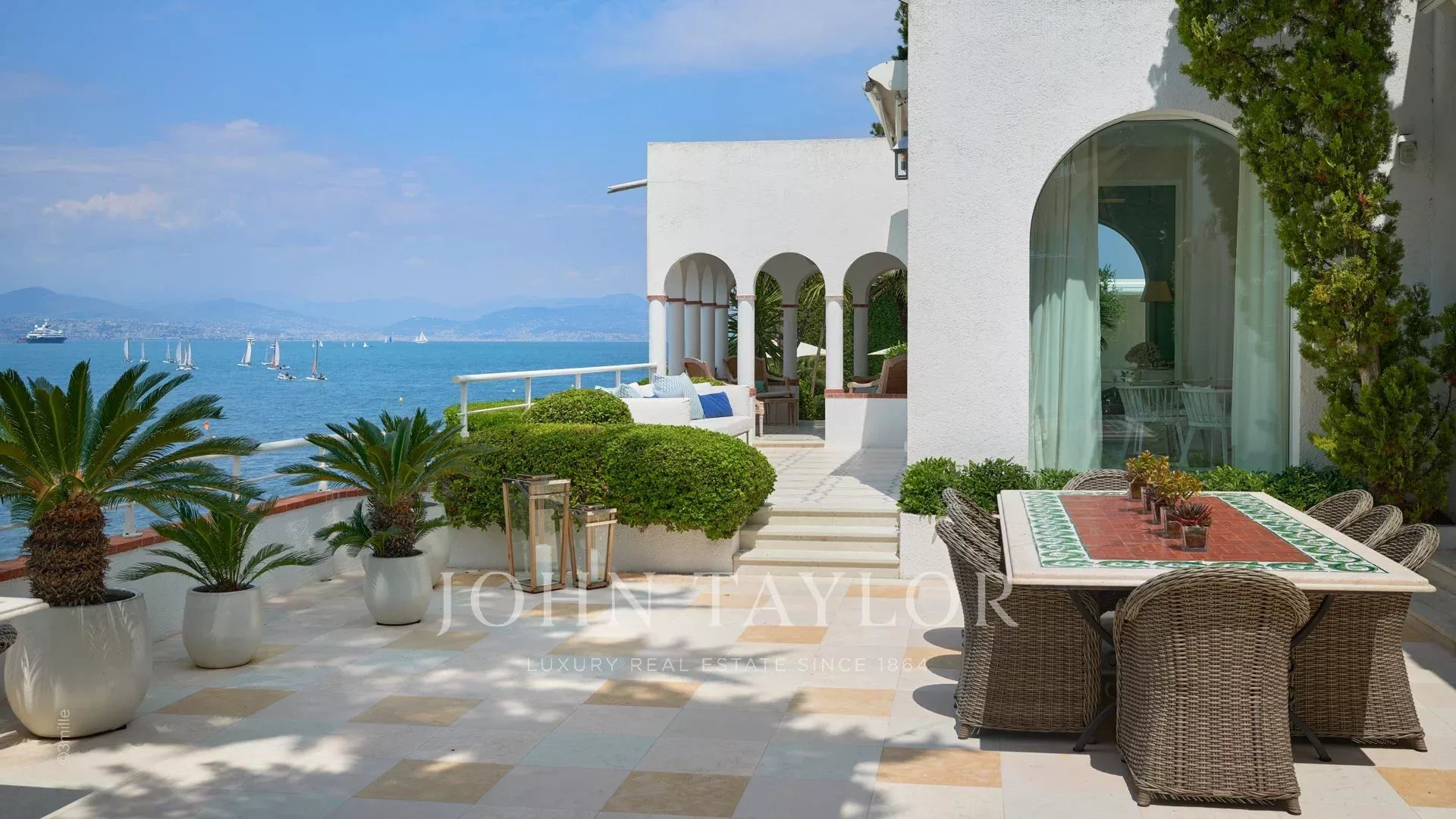 Der Eingang führt Sie in einen großen Empfangsbereich, der sich zu einer herrlichen Terrasse mit Blick auf das Meer und das alte Antibes öffnet und aus einem Wohn- und Esszimmer besteht, das 12 Personen Platz bietet.