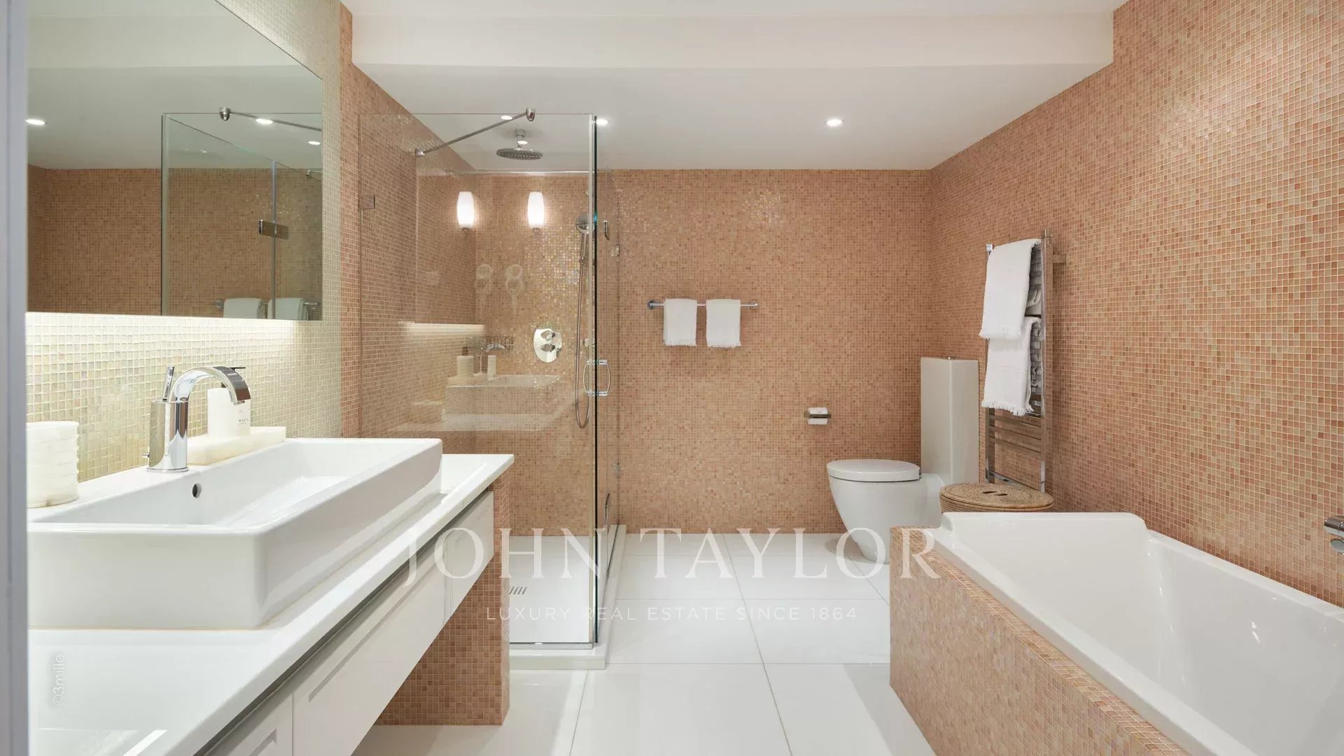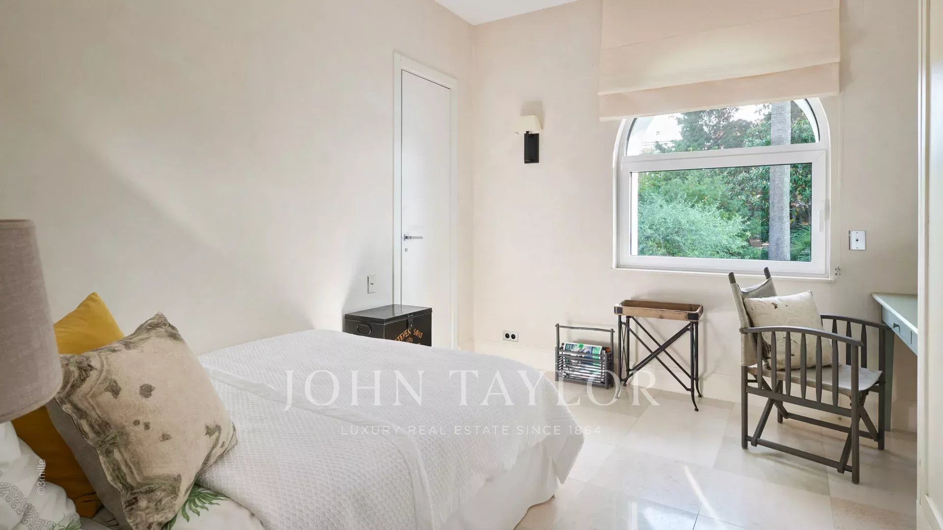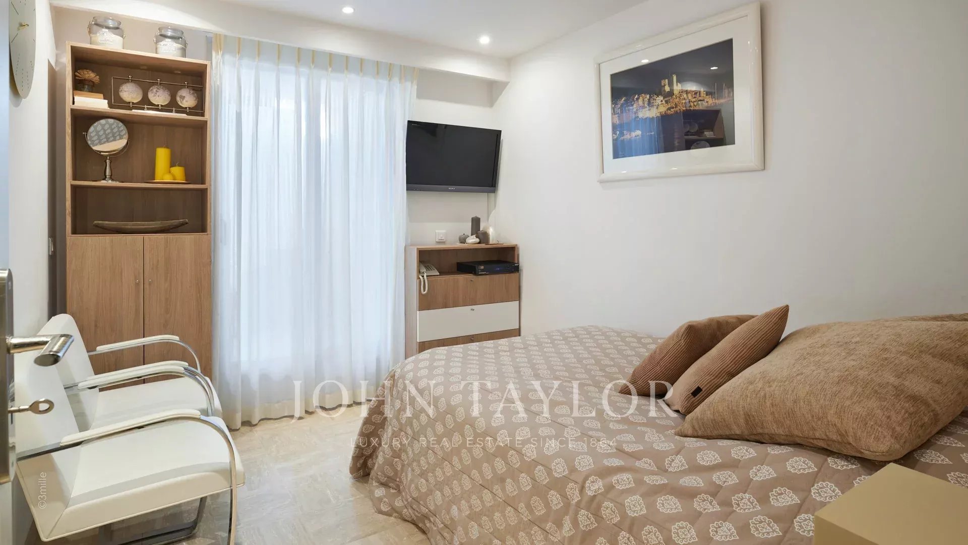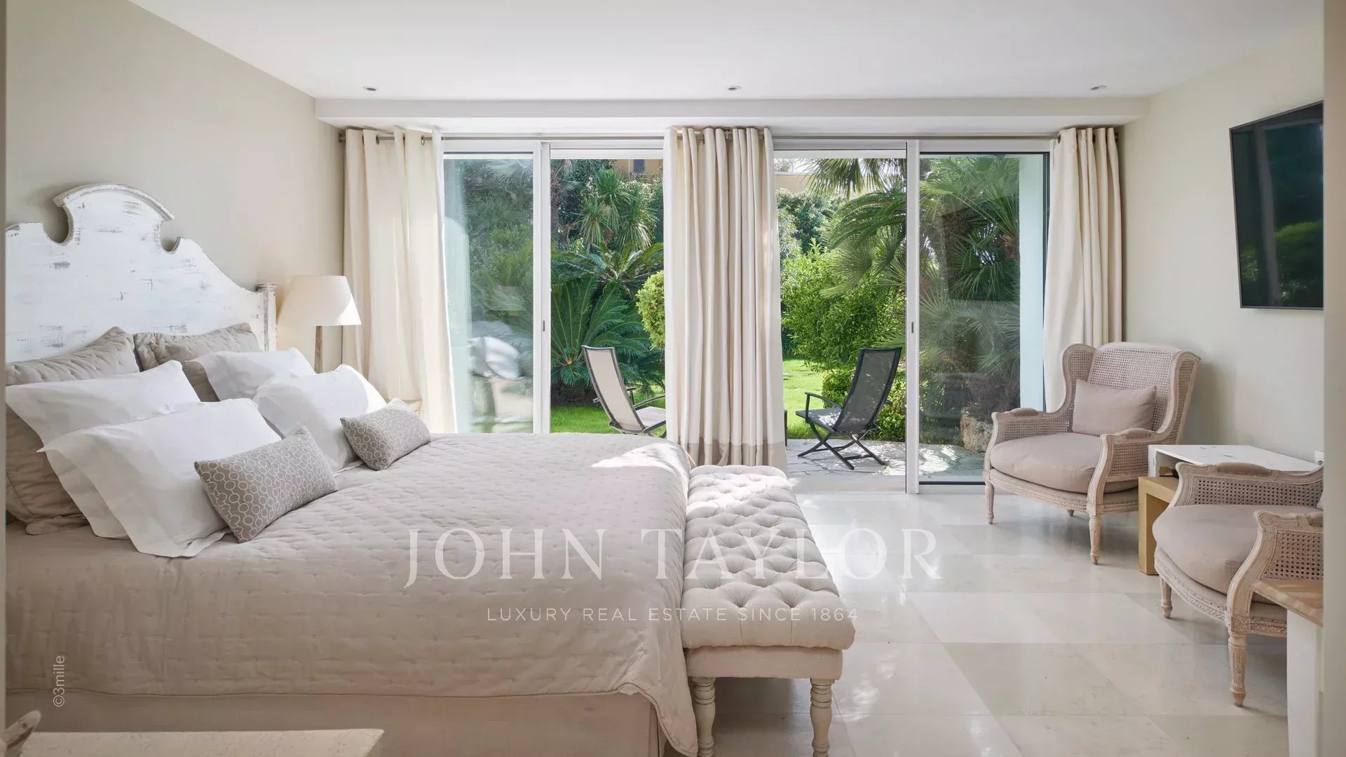 Das Hauptschlafzimmer mit einem Doppelbett und einem Fernseher öffnet sich auf eine Terrasse, einschließlich eines Ankleidezimmers und eines Duschraums/WCs.