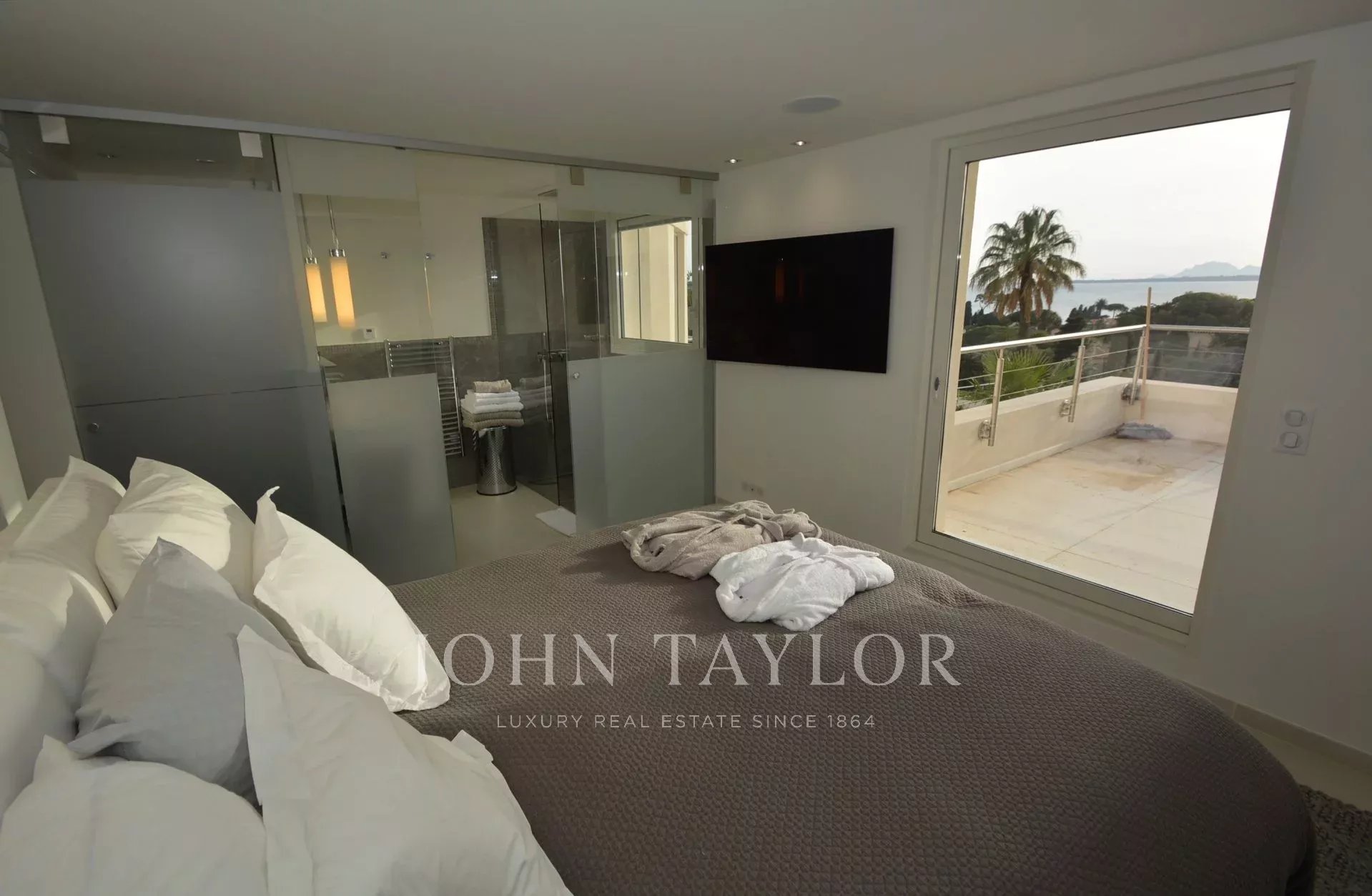 Schlafzimmer (Doppelbett - Safe) mit Zugang zu einer separaten Terrasse, Meerblick - offener Duschraum / WC.