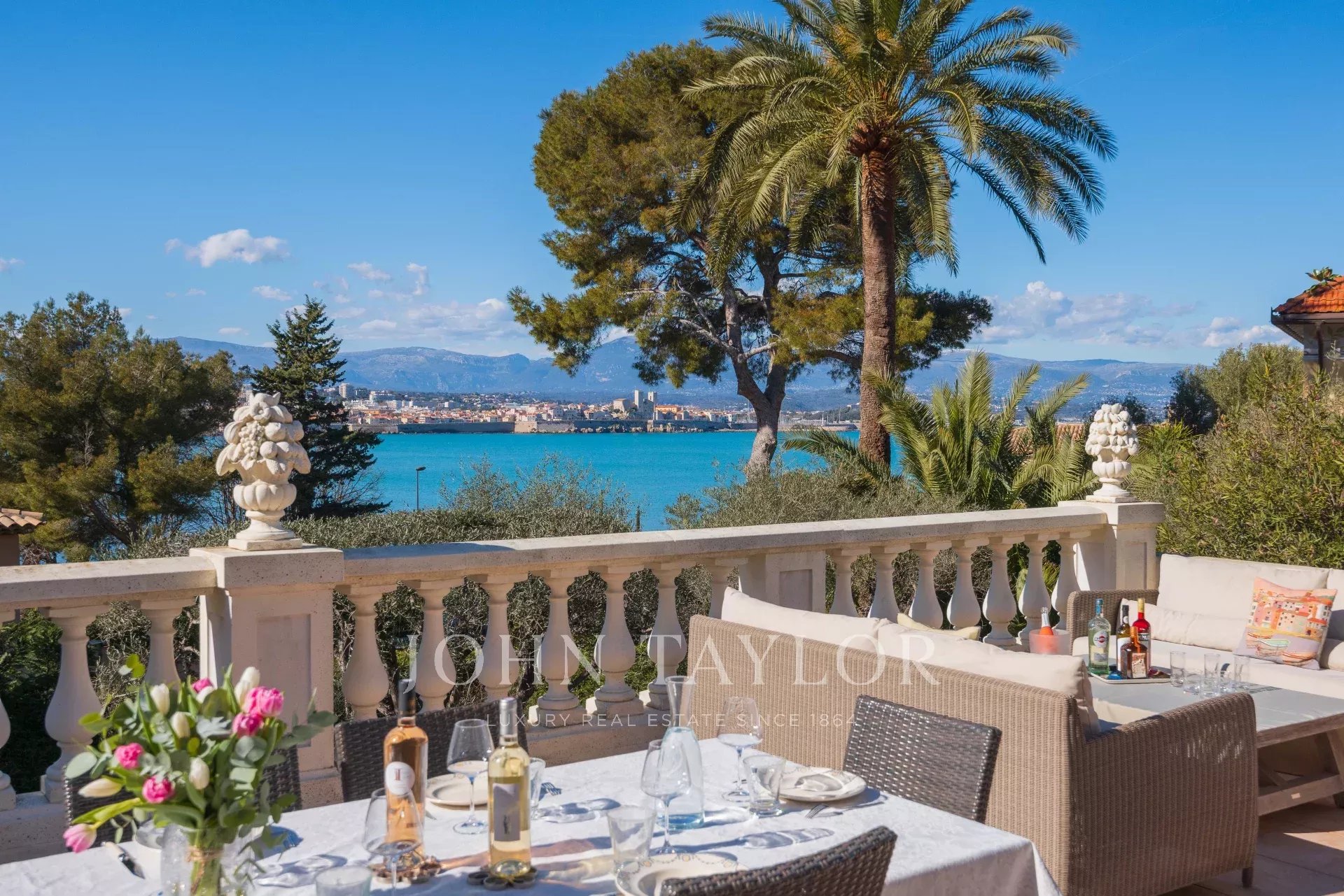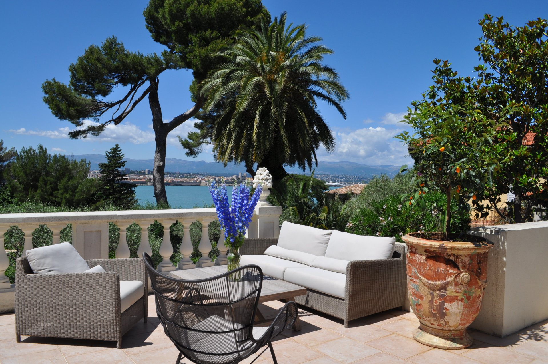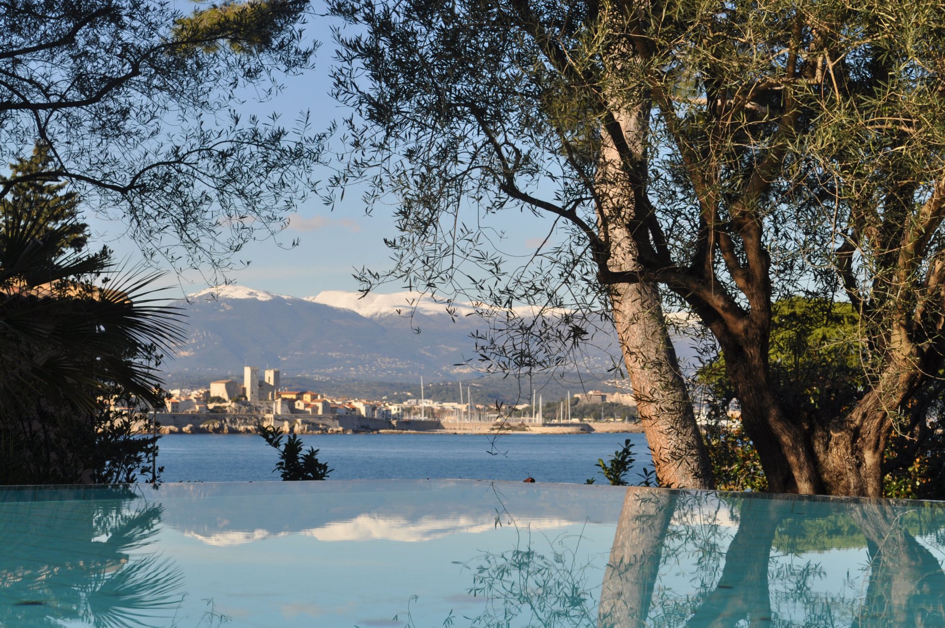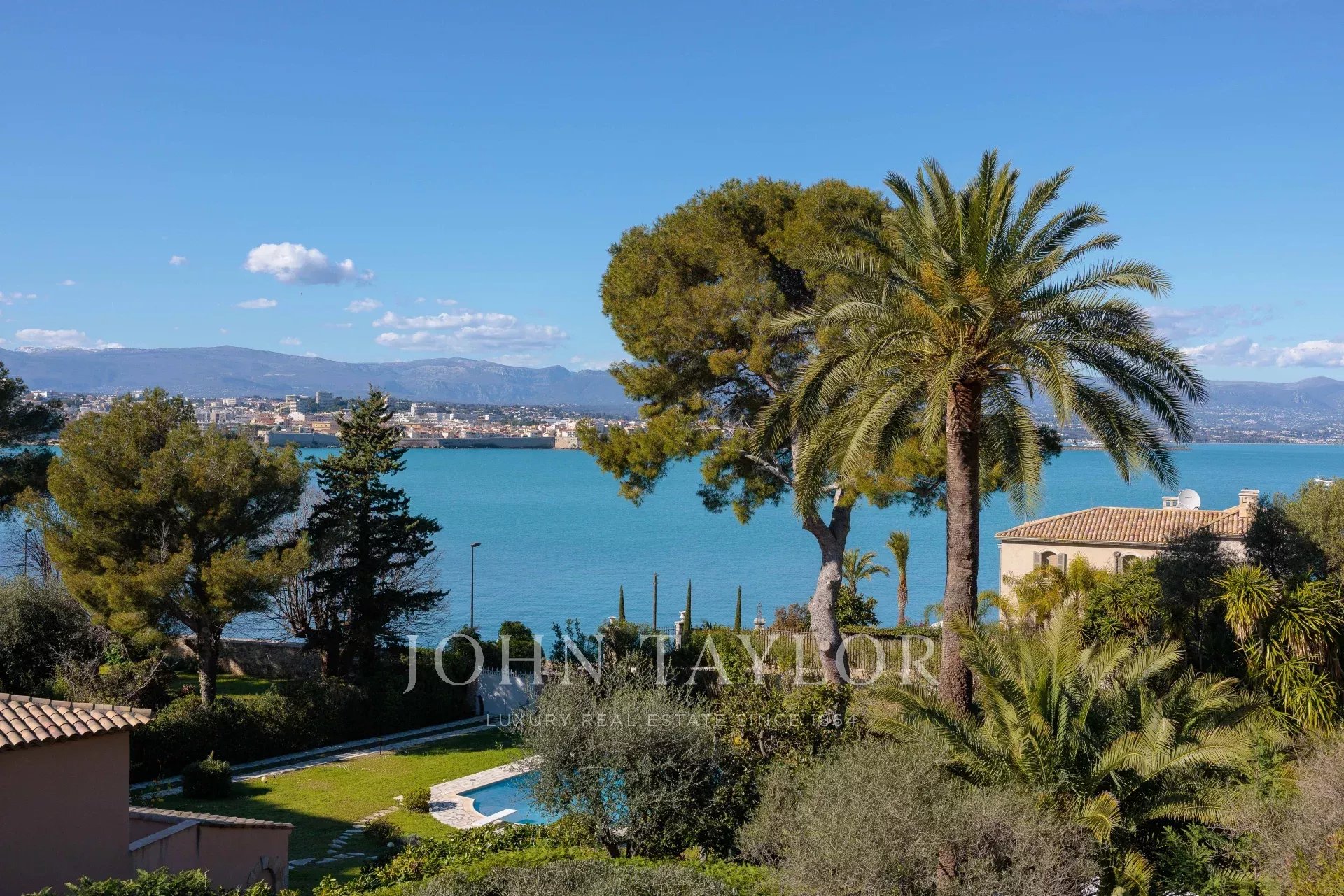 Inmitten eines Gartens, der die Essenzen der Côte d'Azur wie Zitrusfrüchte, Olivenbäume, Feigenbäume, Myrte und Jasmin, aber auch Kakteen und große Euphorbien enthält, genießt die Villa einen herrlichen Blick auf die Altstadt von Antibes und die Baie des Anges, die von den Alpen überragt werden.