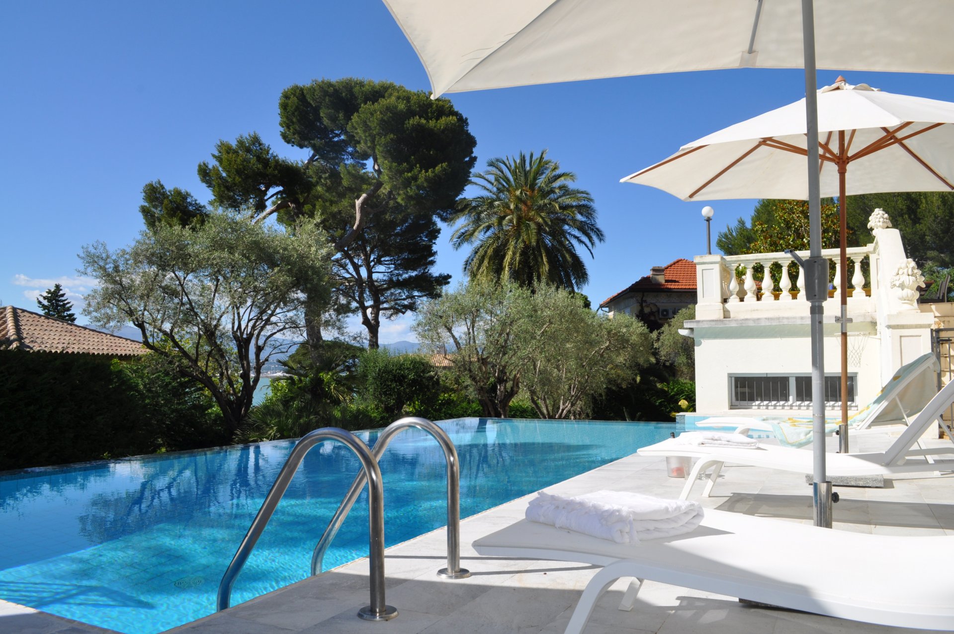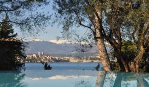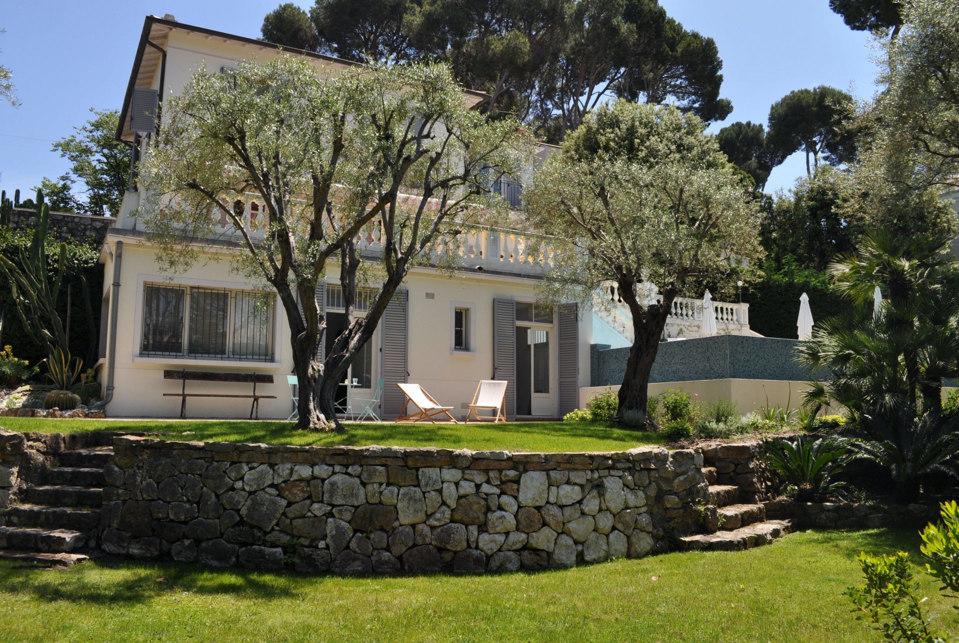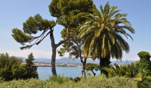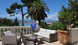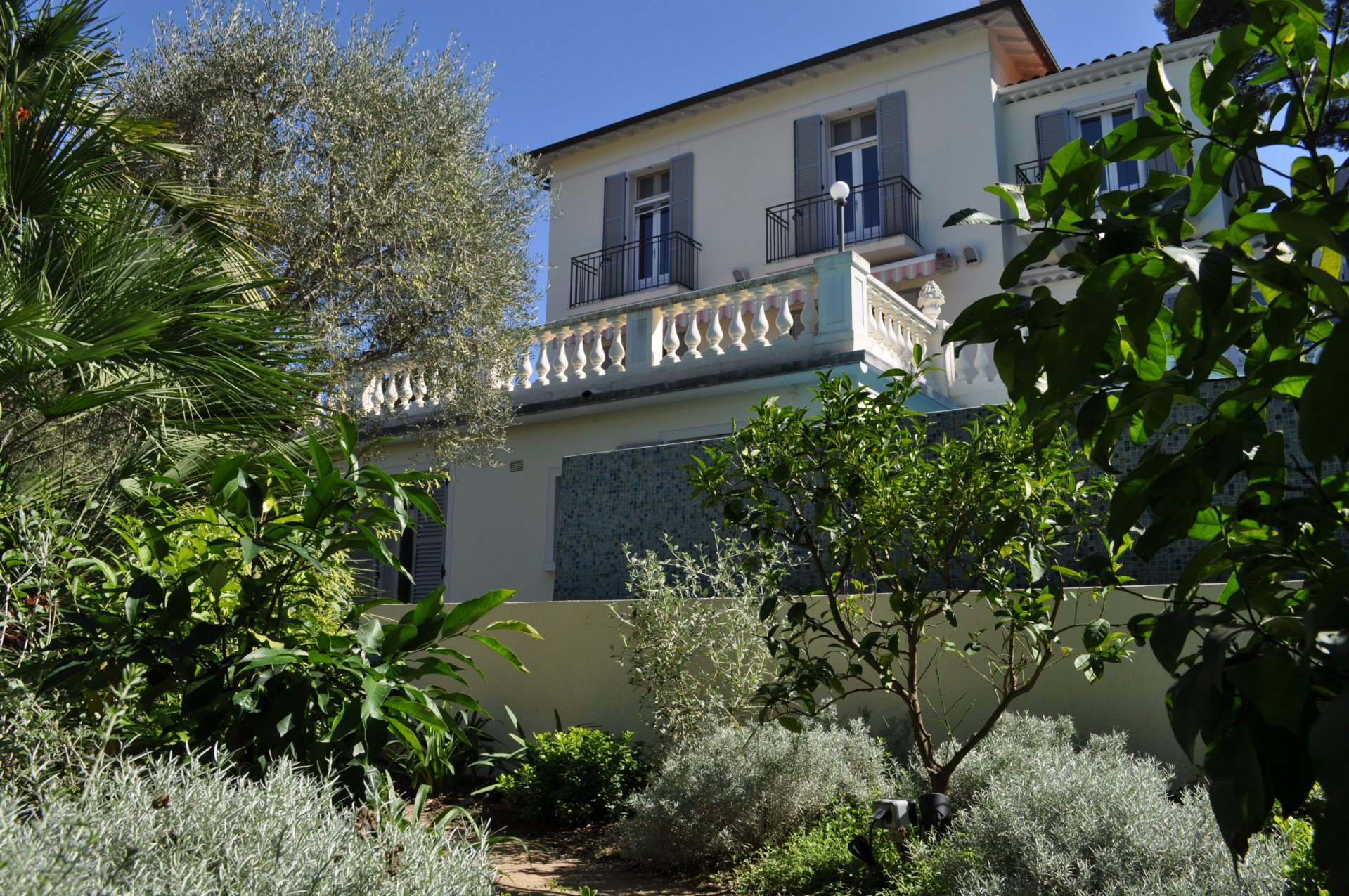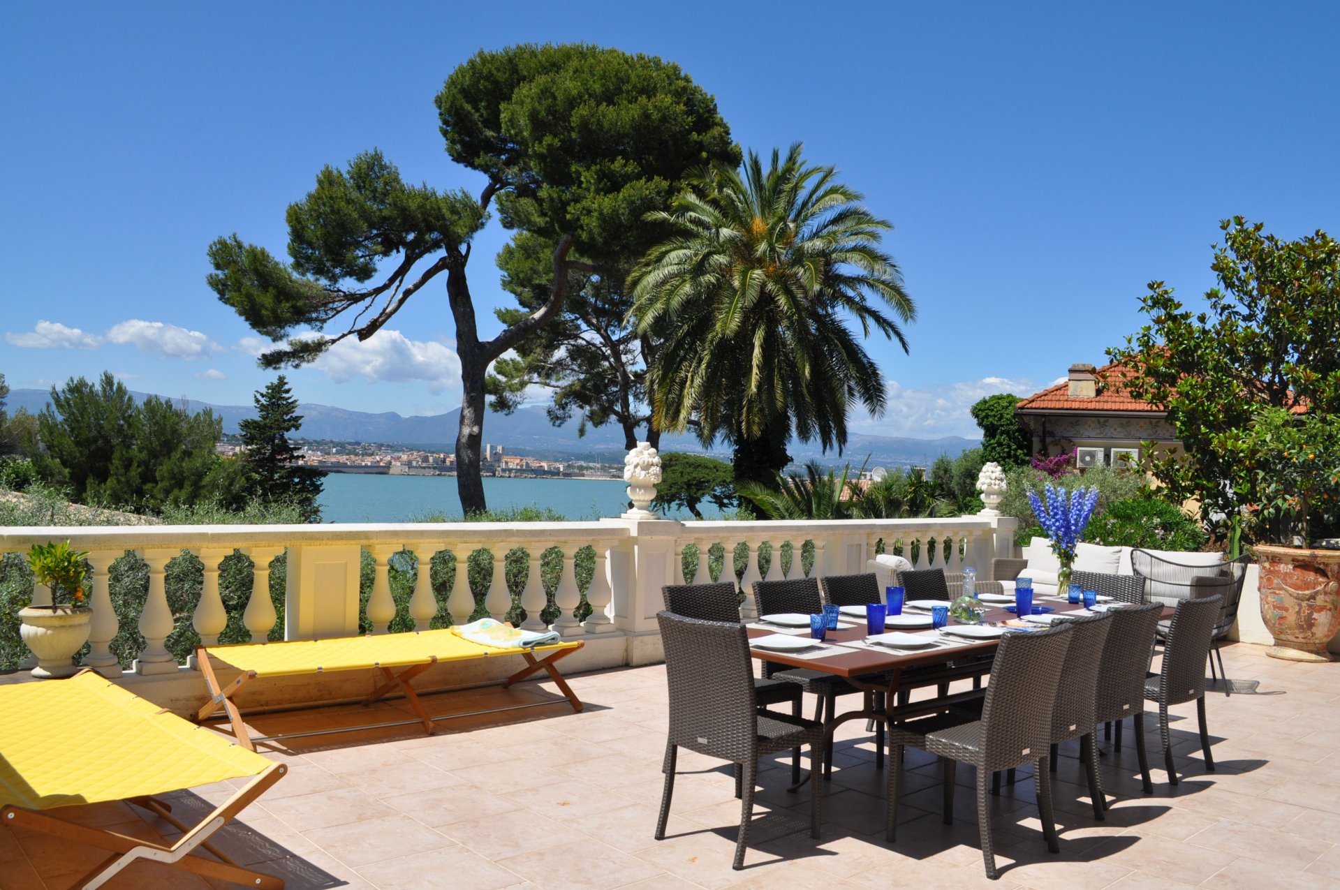 Inmitten eines Gartens, der die Essenzen der Côte d'Azur wie Zitrusfrüchte, Olivenbäume, Feigenbäume, Myrte und Jasmin, aber auch Kakteen und große Euphorbien enthält, genießt die Villa einen herrlichen Blick auf die Altstadt von Antibes und die Baie des Anges, die von den Alpen überragt werden.