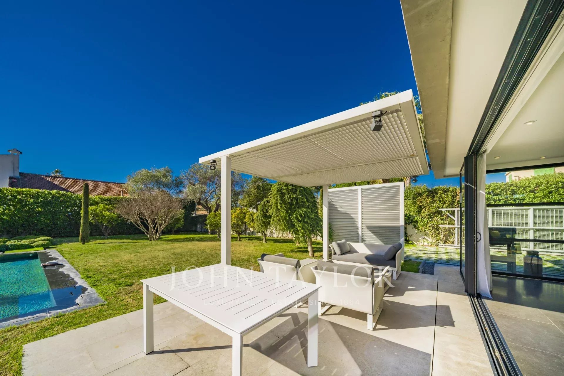 Schöne zeitgenössische Villa, die im Sommer 2020 fertiggestellt wird. Sie bietet 320 m² Wohnfläche im Herzen eines flachen Grundstücks von 940 m² und genießt von ihrer Dachterrasse einen schönen Blick auf das Meer (die Bucht von Juan les Pins und die Iles de Lerins).
