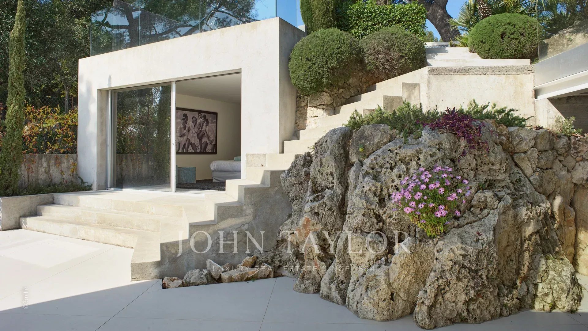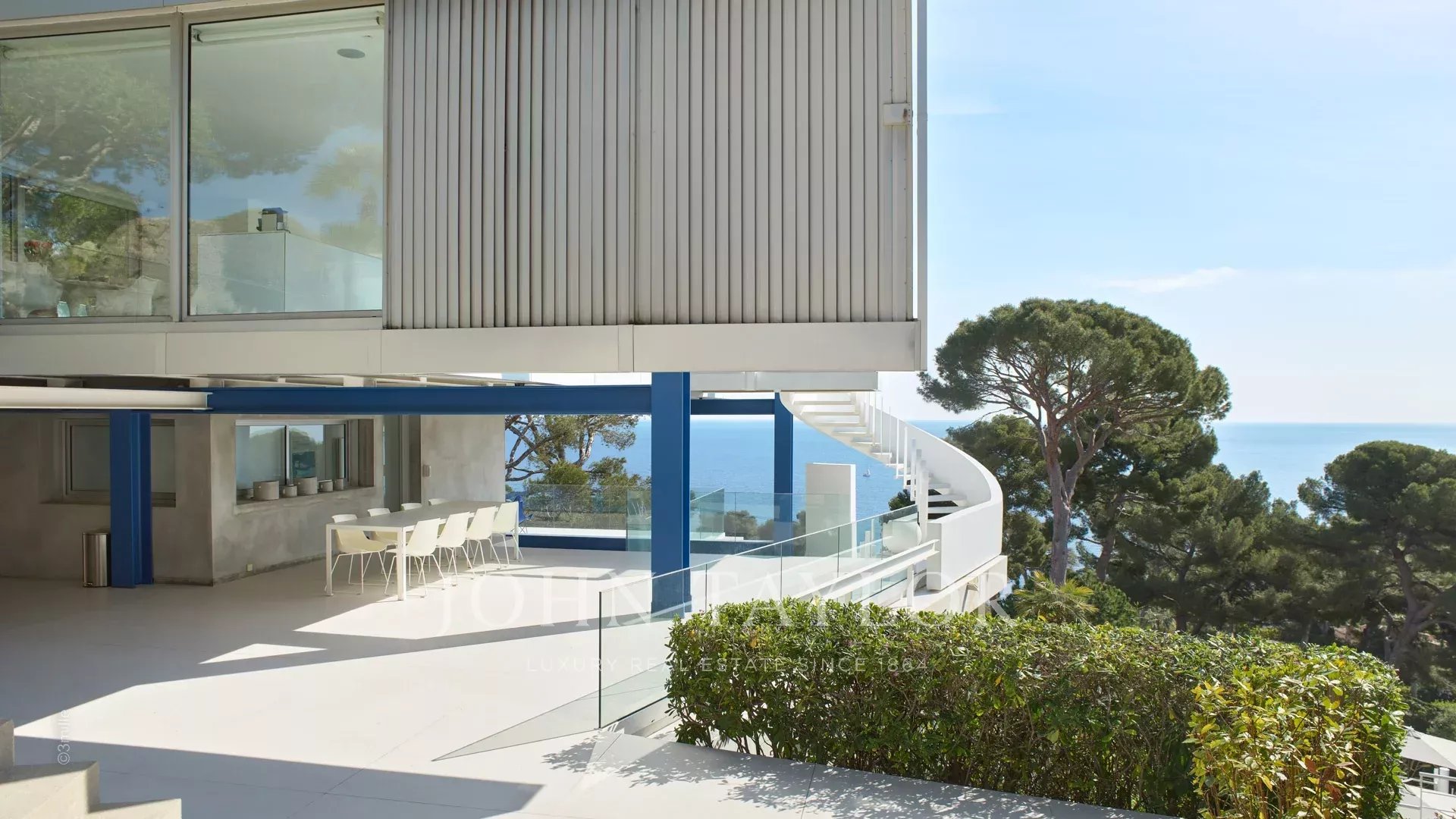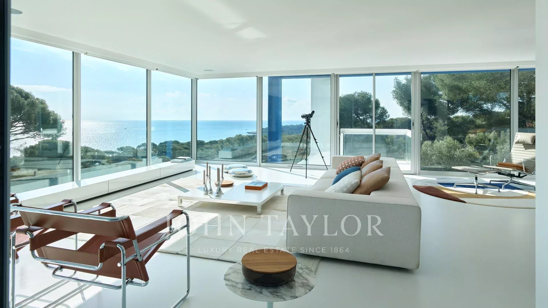 In einem der begehrtesten Viertel von Cap d'Antibes, in der Nähe des Leuchtturms von La Garoupe und nur wenige Autominuten von den Stränden Plages de la Salis und Port de la Gallice entfernt, liegt diese wunderschöne moderne Villa, die 1966 von dem berühmten Architekten Claude Parent erbaut wurde. Sie ist komplett renoviert, klimatisiert und nach Süden ausgerichtet. Sie bietet einen herrlichen Panoramablick auf die Bucht von Cap d'Antibes und die Stadt.