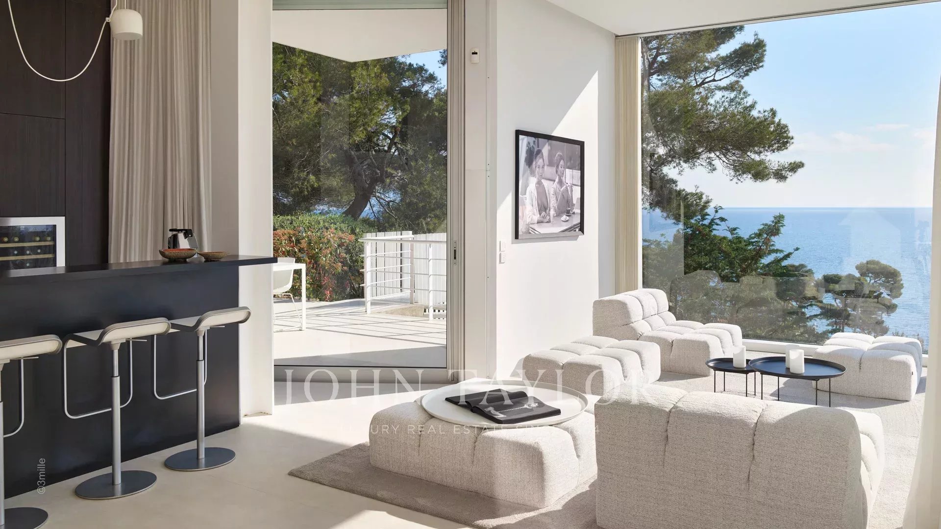 Empfangsbereich, der durch seine großen Fensterfronten sehr hell ist, bestehend aus Wohnzimmer, Esszimmer und amerikanischer Küche, mit atemberaubendem Blick auf das Meer und die Stadt.