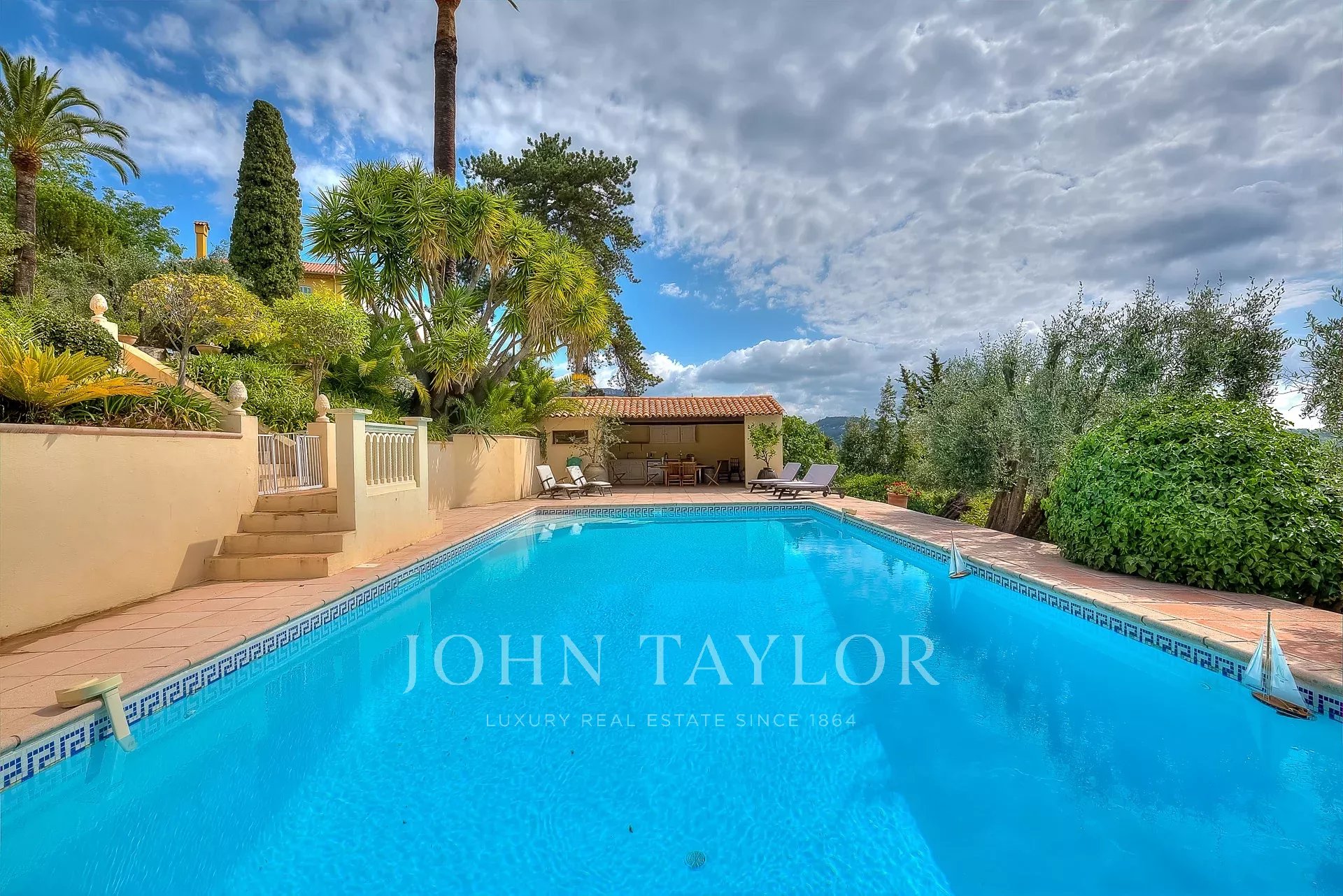 Die Villa genießt ein Grundstück von ca. 3.000 m² mit mediterranem Garten, Poolhaus, Pool, Außenbadezimmer und Sommerküche.