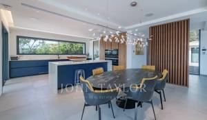 Schon beim Betreten des Hauses werden Sie von seiner eleganten und anspruchsvollen Atmosphäre begeistert sein. Das große Wohnzimmer, das dank der großen Fenster mit natürlichem Licht durchflutet wird, öffnet sich harmonisch nach außen. Das klare Design, die zeitgenössischen Möbel und die sorgfältig ausgewählten Kunstwerke schaffen eine schicke und zugleich einladende Atmosphäre.