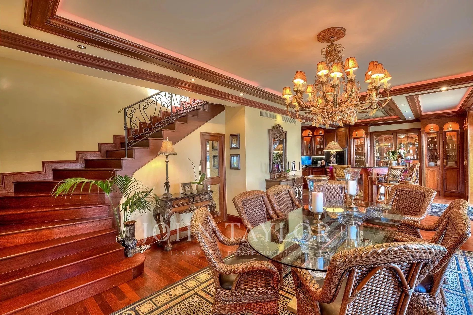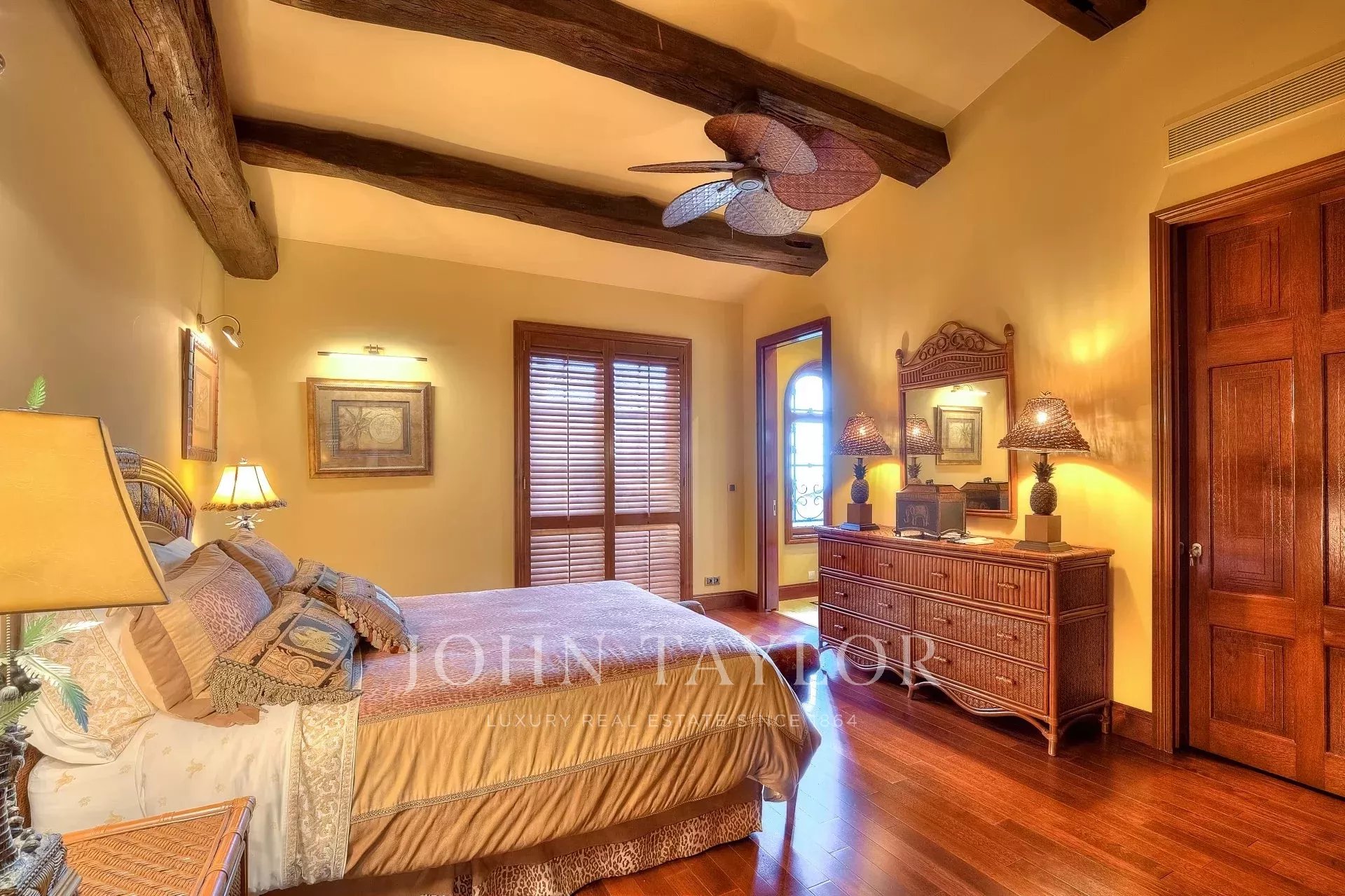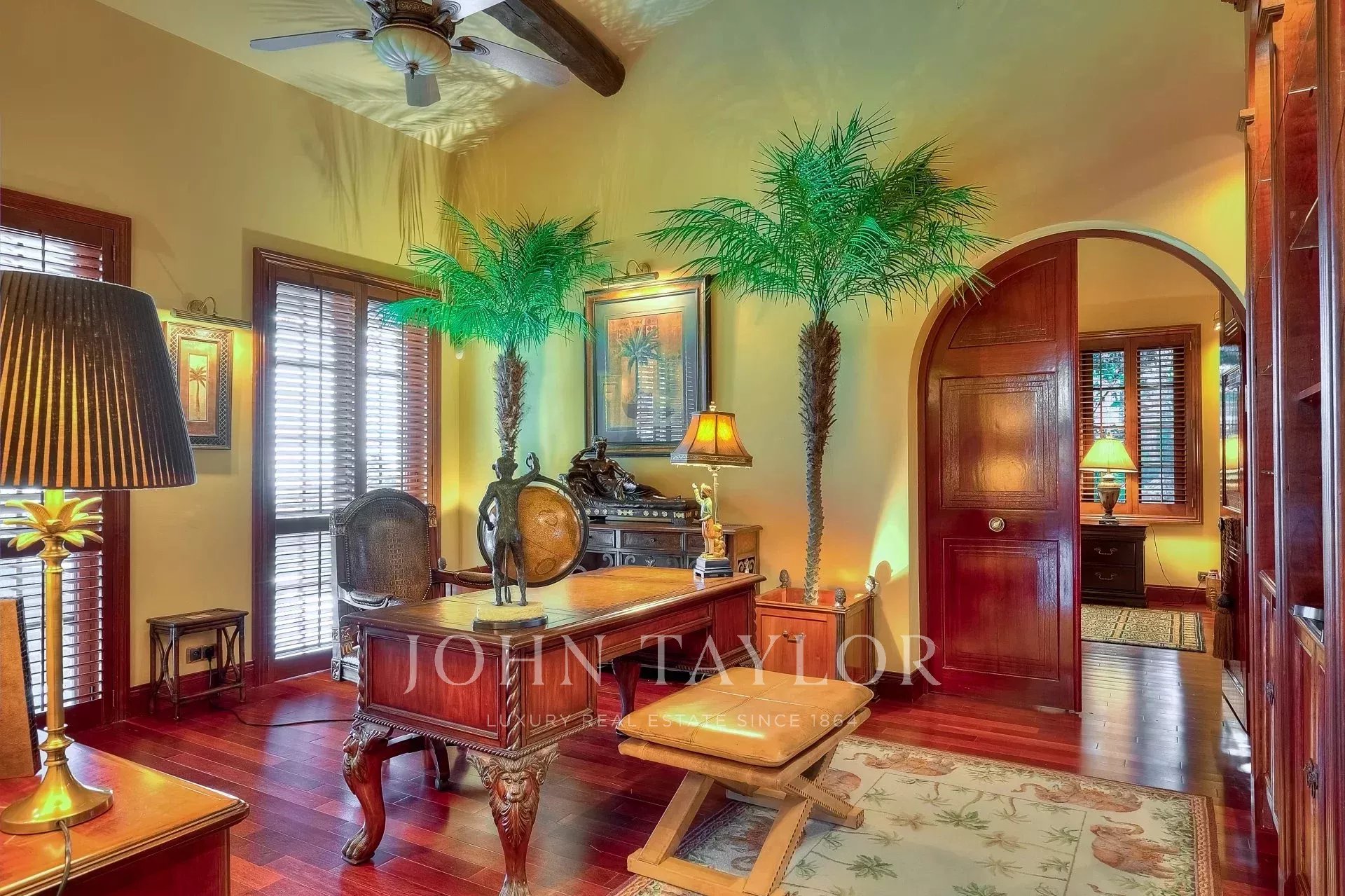 Im Gartengeschoss befinden sich eine Eingangshalle und eine Gästetoilette, ein großer Empfangsraum/Wohnzimmer von über 150 m², ein Esszimmer, eine Küche, ein Büro, ein Hauptschlafzimmer (Nr. 1) mit seinem großen Badezimmer und zwei Ankleidezimmern, ein Sommersalon, ein Kinosaal von 50 m².