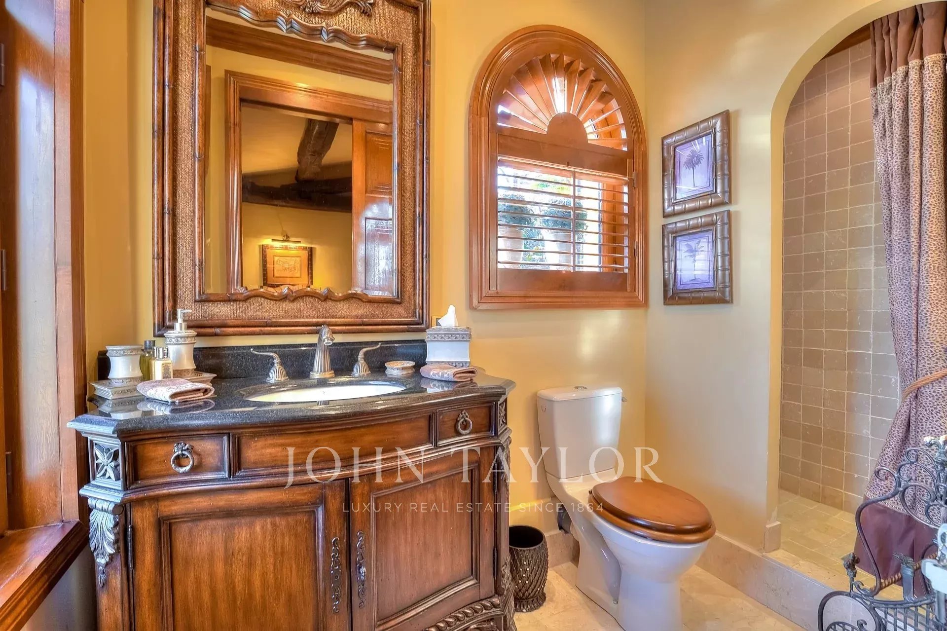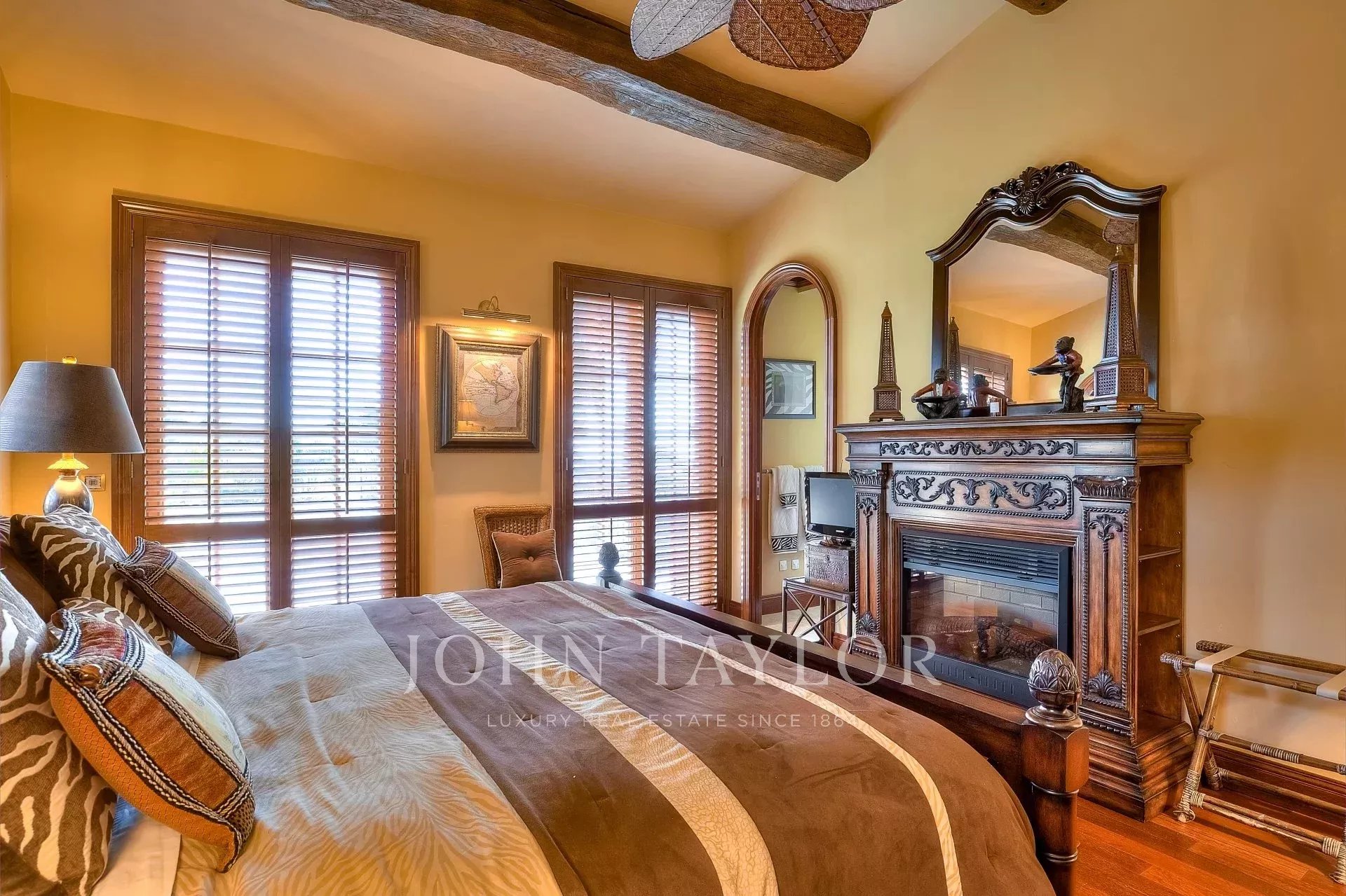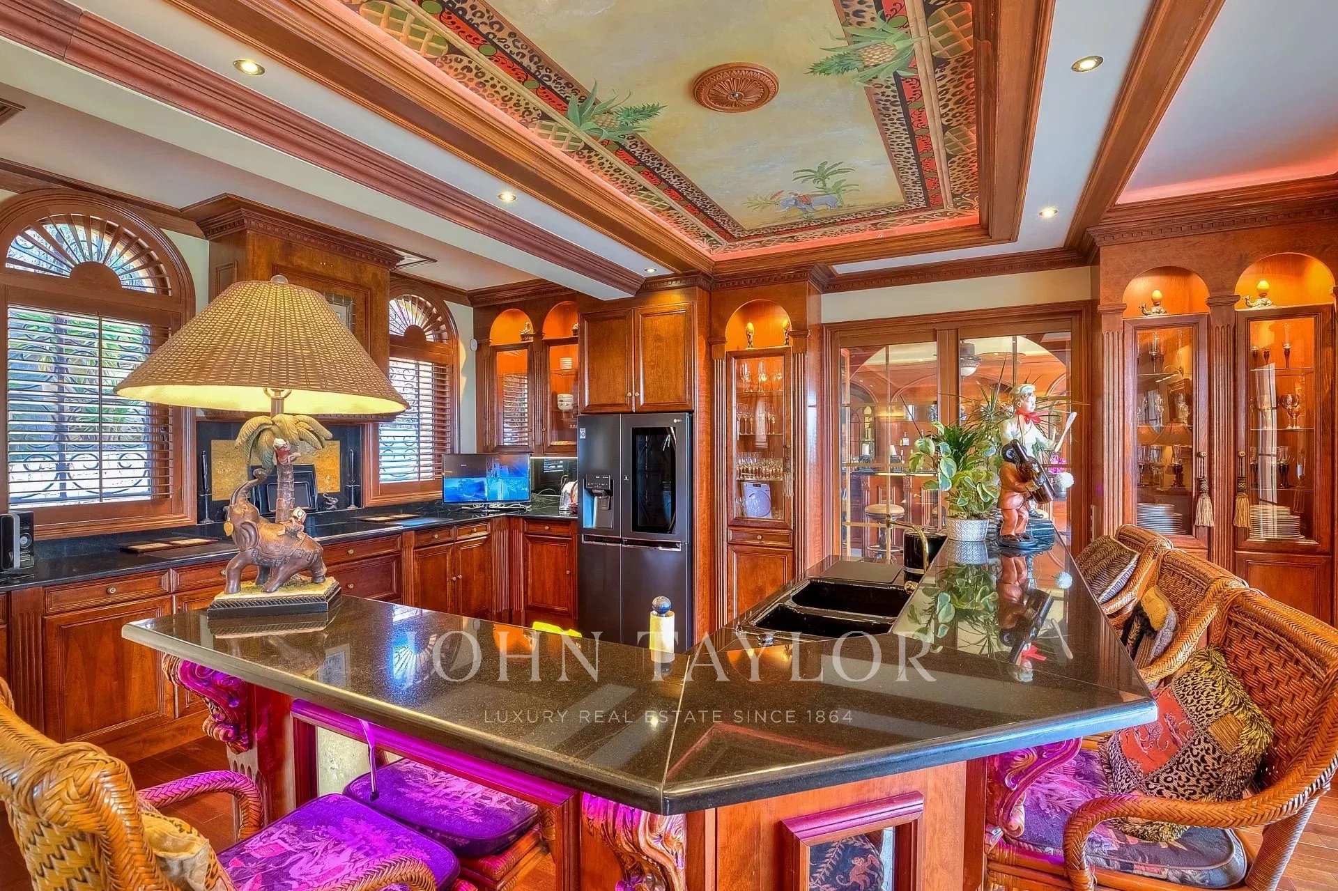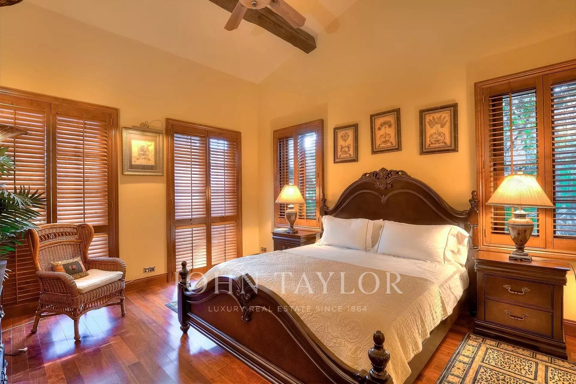 Im Gartengeschoss befinden sich eine Eingangshalle und eine Gästetoilette, ein großer Empfangsraum/Wohnzimmer von über 150 m², ein Esszimmer, eine Küche, ein Büro, ein Hauptschlafzimmer (Nr. 1) mit seinem großen Badezimmer und zwei Ankleidezimmern, ein Sommersalon, ein Kinosaal von 50 m².