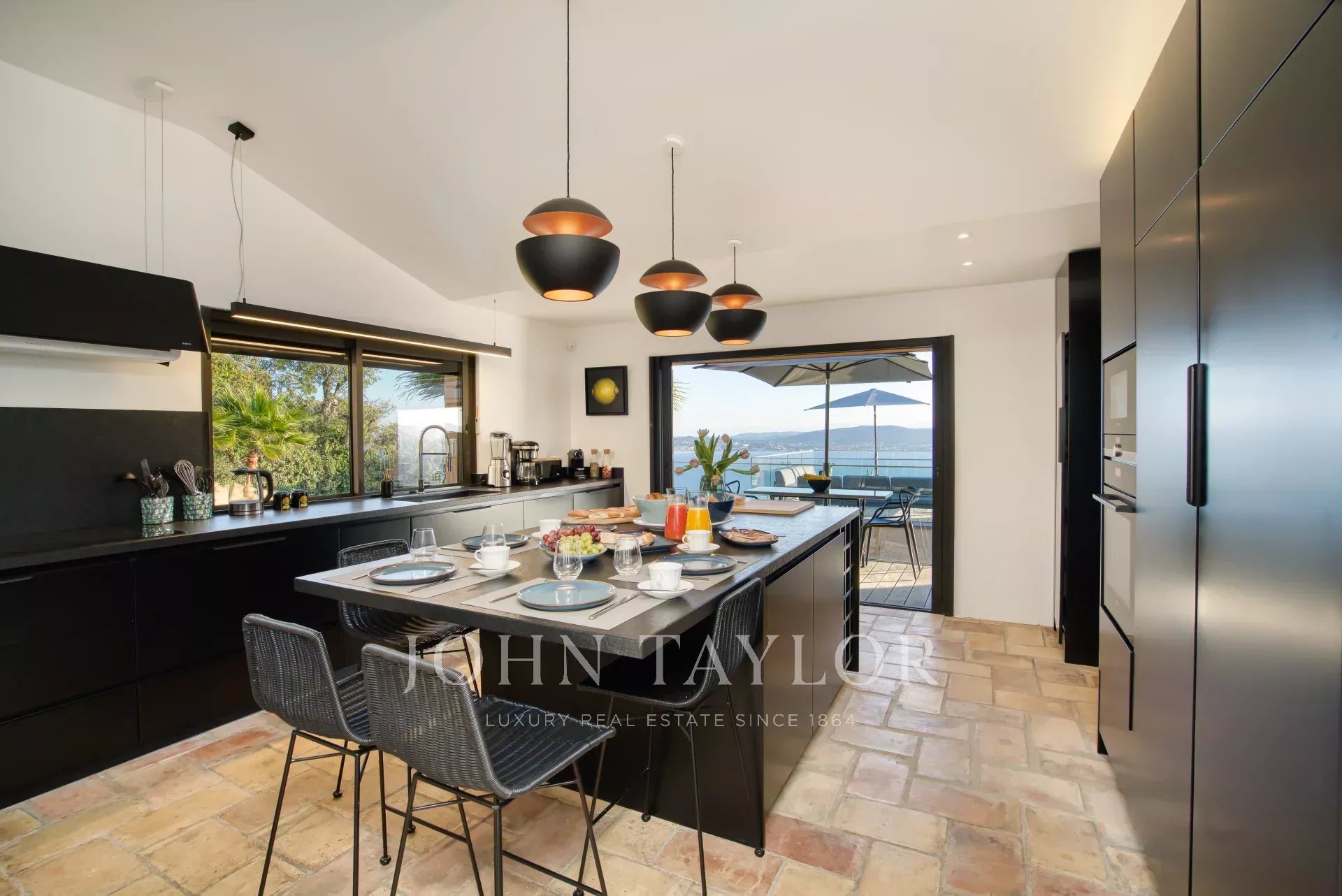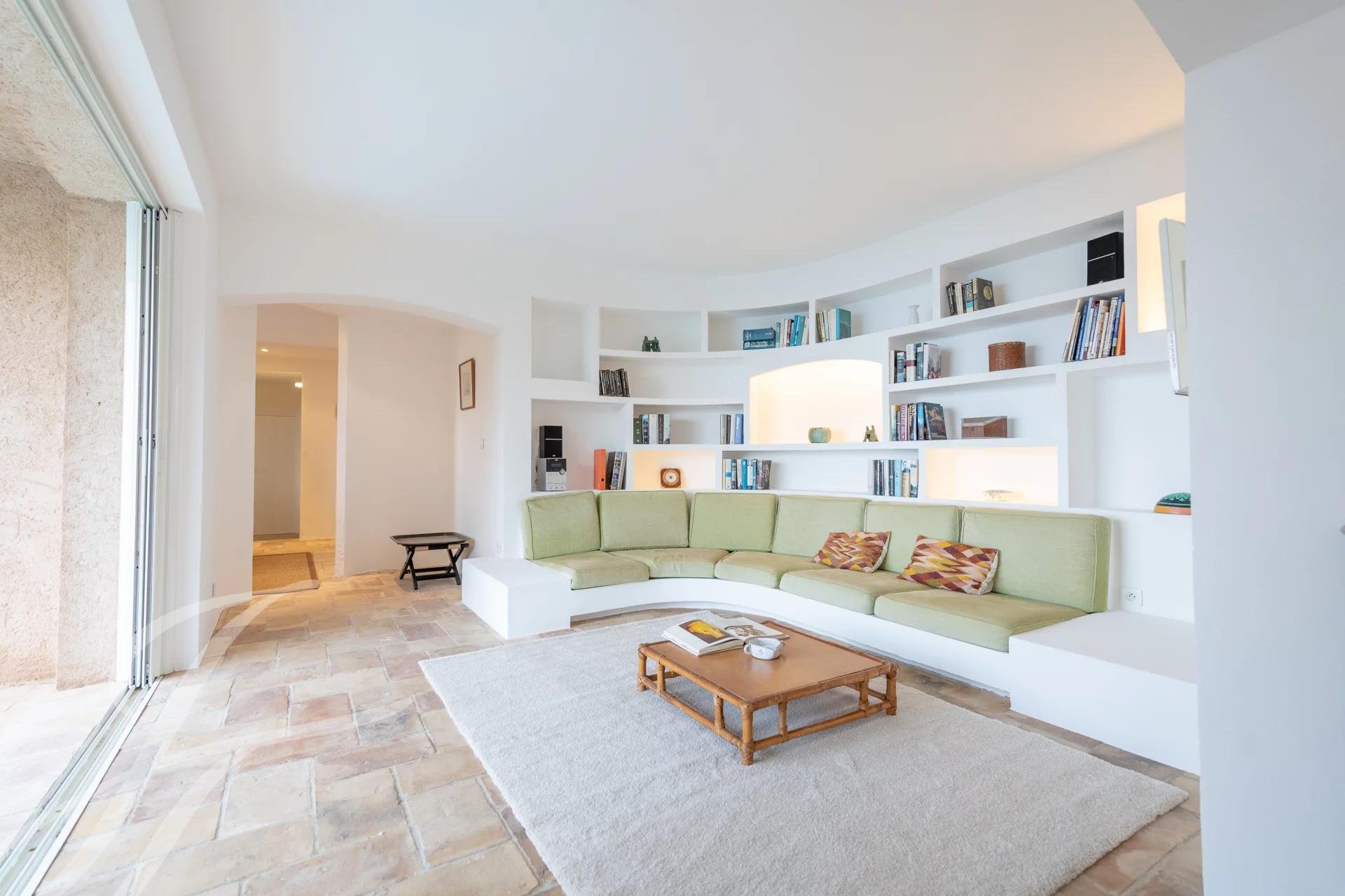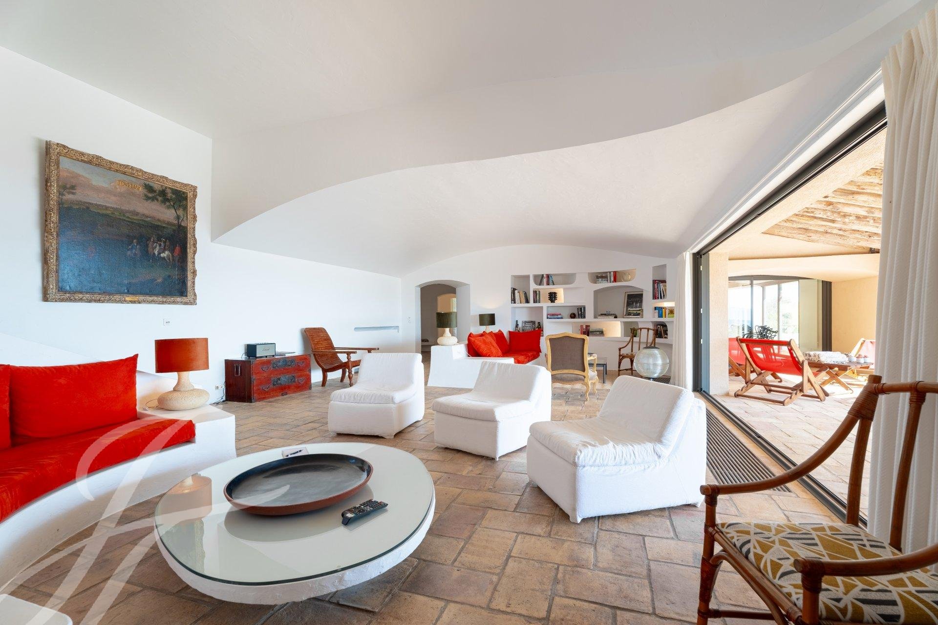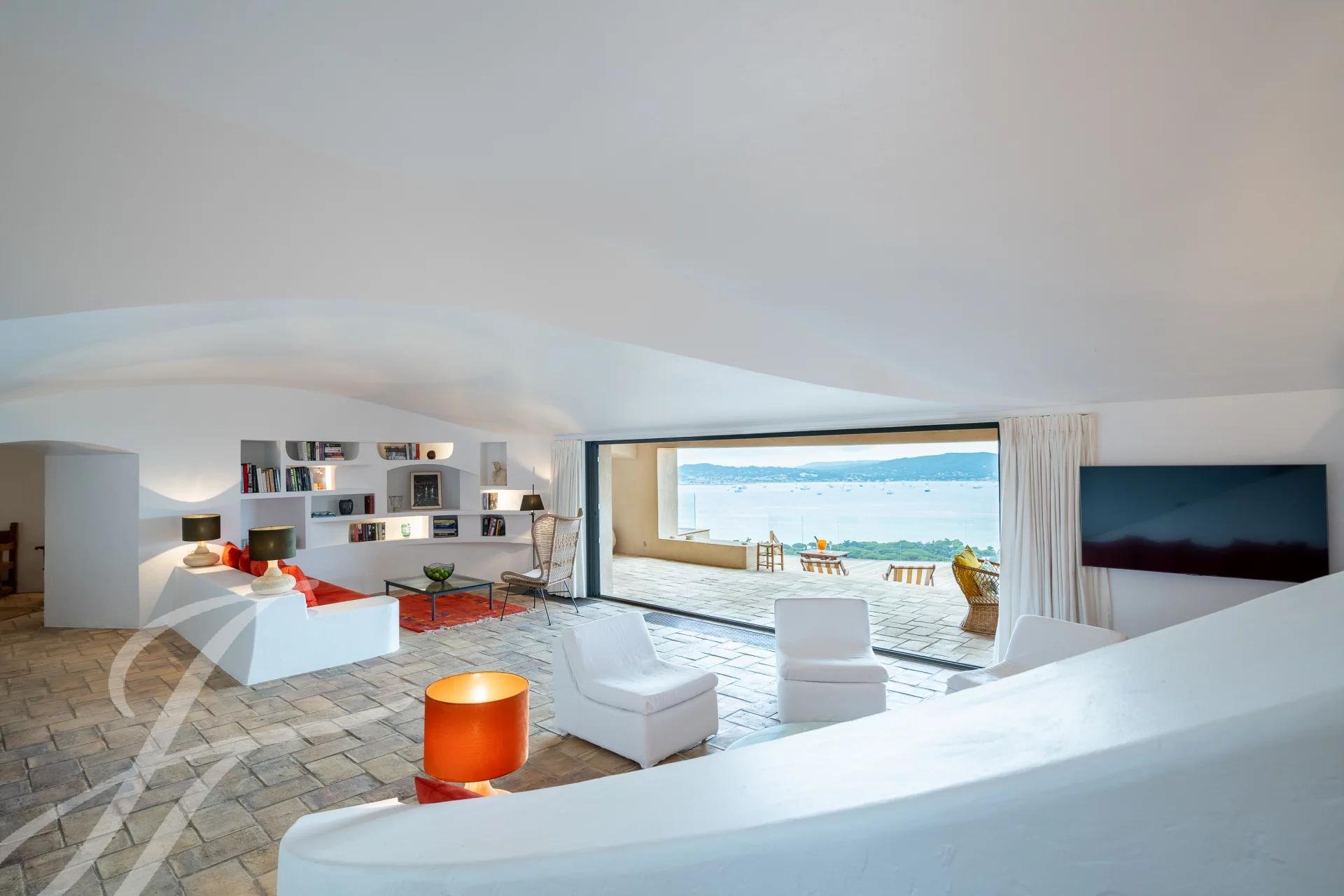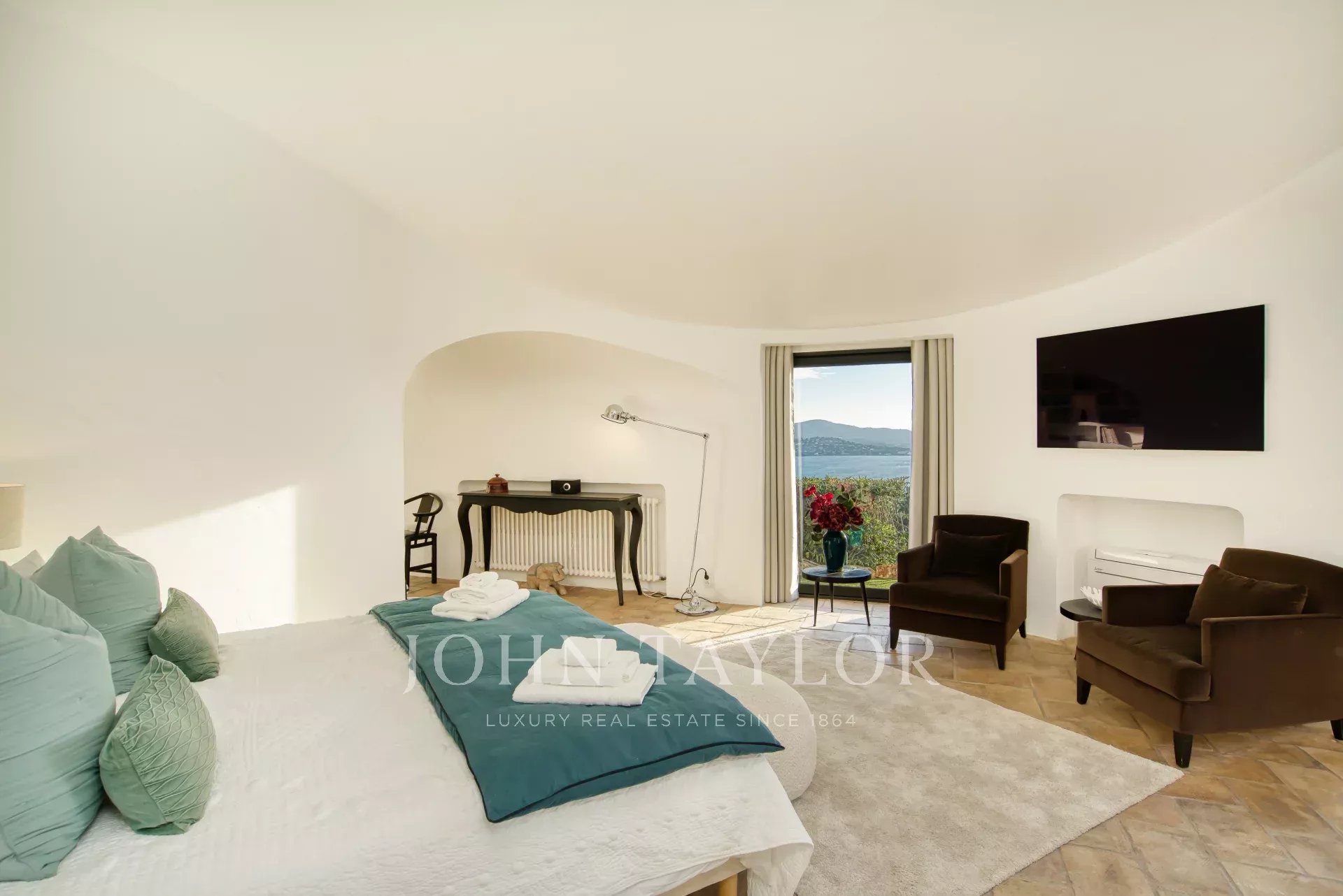 Die 660 m² große Innenfläche wurde von einer Innenarchitektin bis ins kleinste Detail durchdacht und bietet eine einzigartige und gepflegte Dekoration, deren Eleganz durch die fast durchgängige Verwendung von Weiß symbolisiert wird und von architektonischen Entscheidungen wie dem erhabenen Wohnzimmer und dem Master-Schlafzimmer mit abgerundeten Formen und einem außergewöhnlichen Postkartenblick auf den gesamten Golf von Saint-Tropez unterbrochen wird.