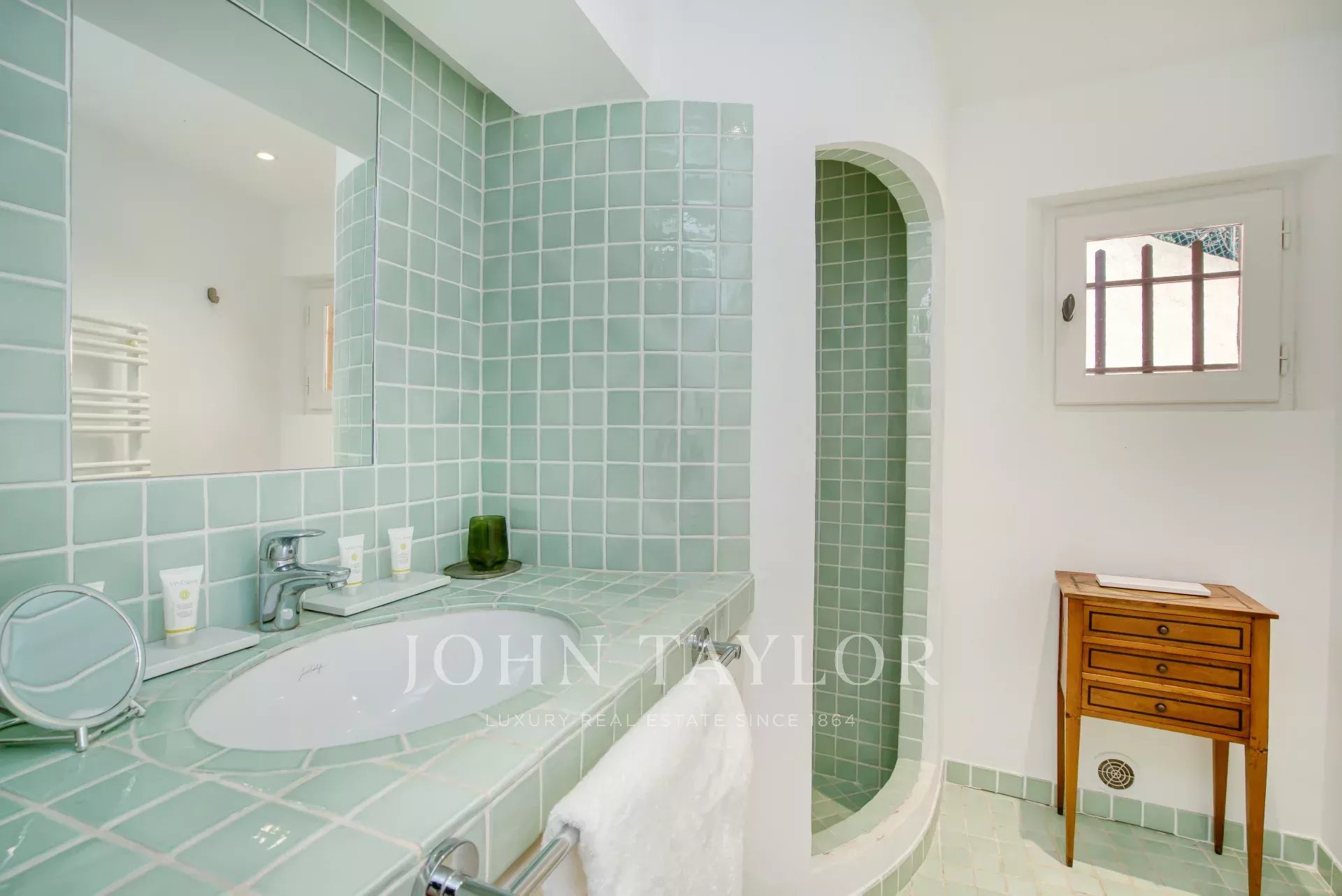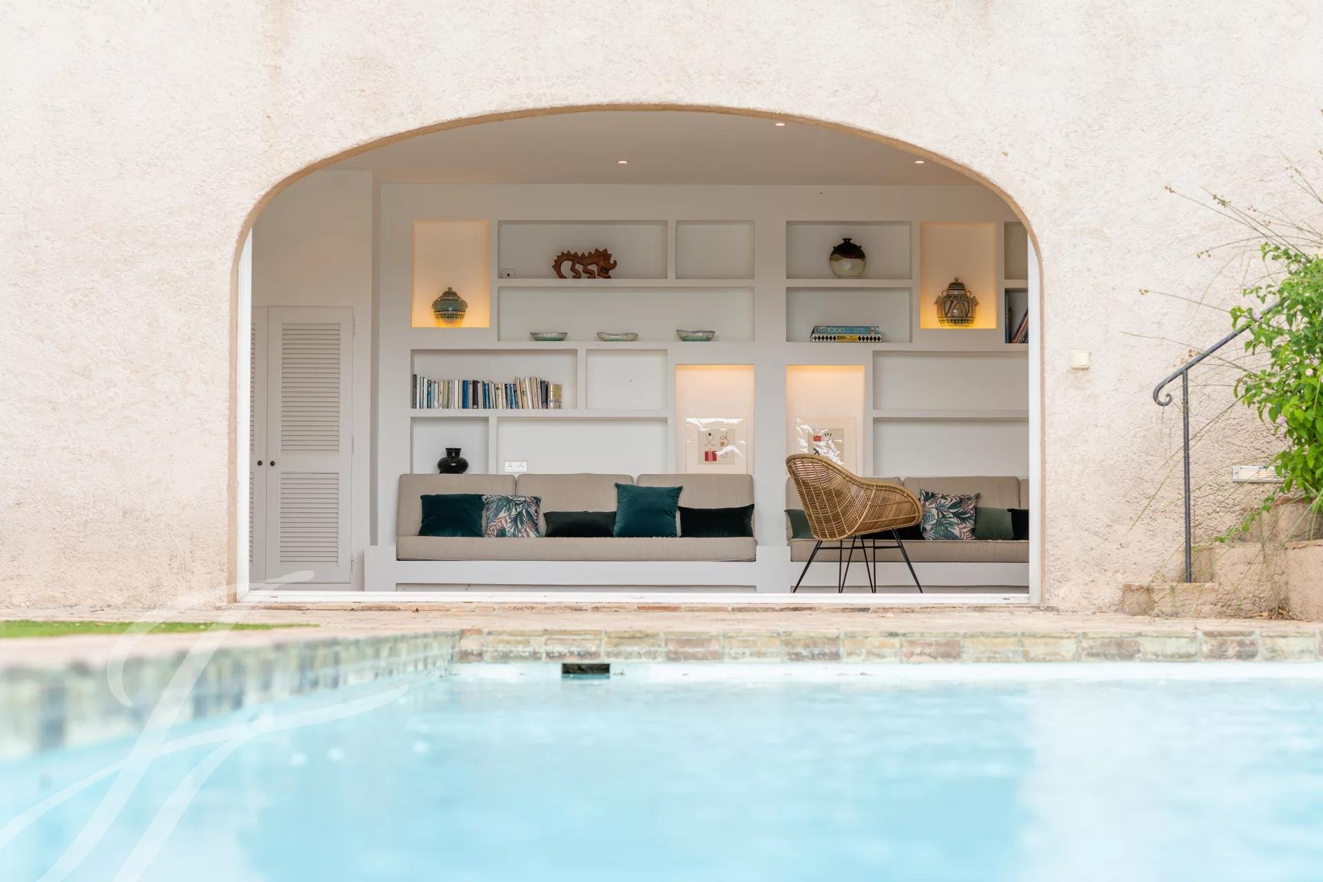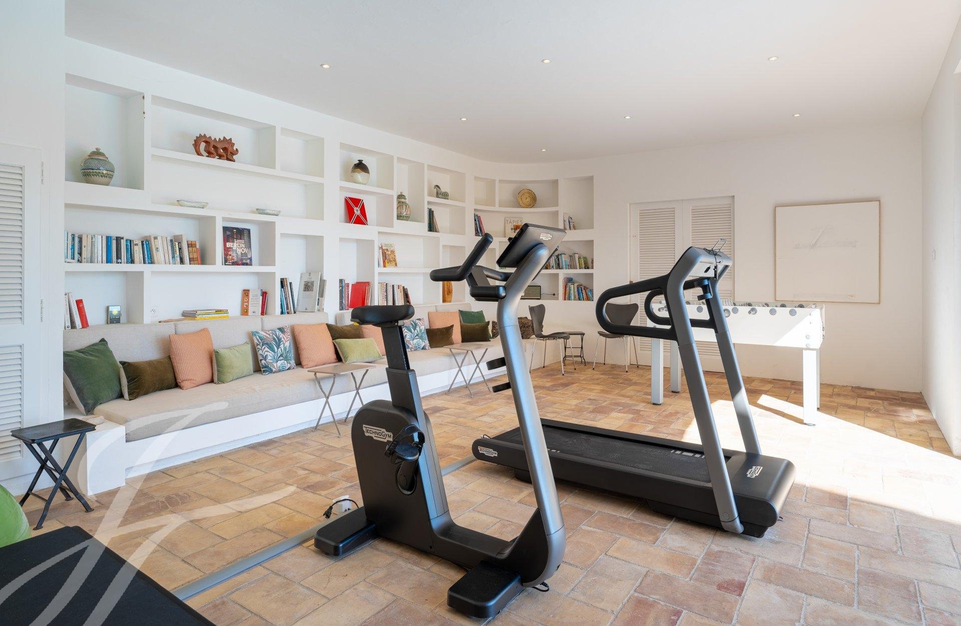 Die Villa verfügt über ein ebenso reiches Außengelände, das sich über 2000m² eines mediterranen Gartens erstreckt. Im unteren Teil des Gartens befindet sich ein Bouleplatz, der vor allem beim traditionellen mediterranen Aperitif zum geselligen Beisammensein einlädt. Sportbegeisterte können die Tischtennisplatte, den Tischfußball, den beheizten Pool und den mit TechnoGym-Geräten ausgestatteten Fitnessraum nutzen.