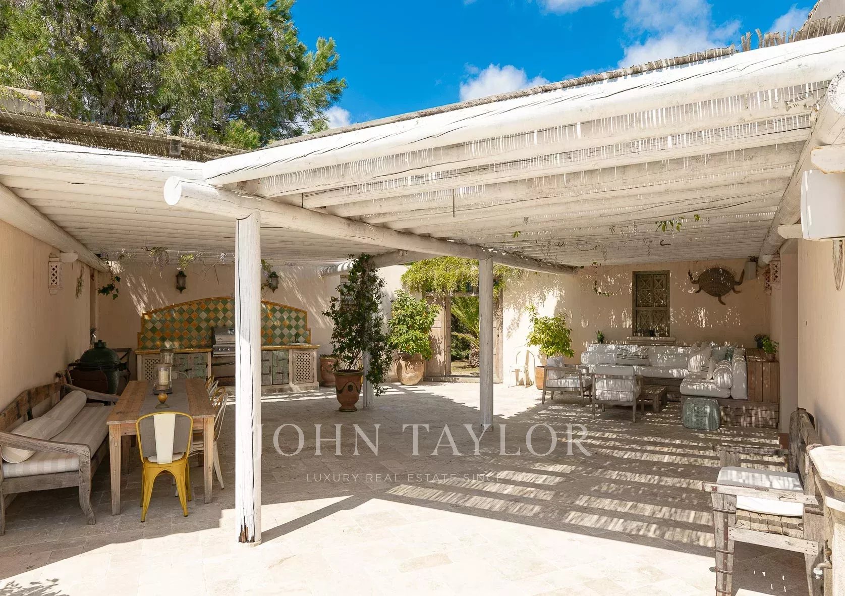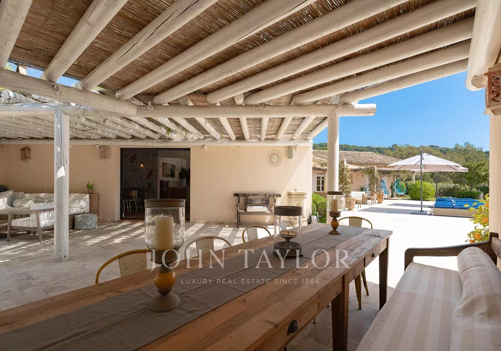Annehmlichkeiten wie eine Klimaanlage, zahlreiche überdachte Terrassen, ein Grill, eine Alarmanlage, ein beheizter Pool mit Abdeckung, ein Bouleplatz und ein Carport.