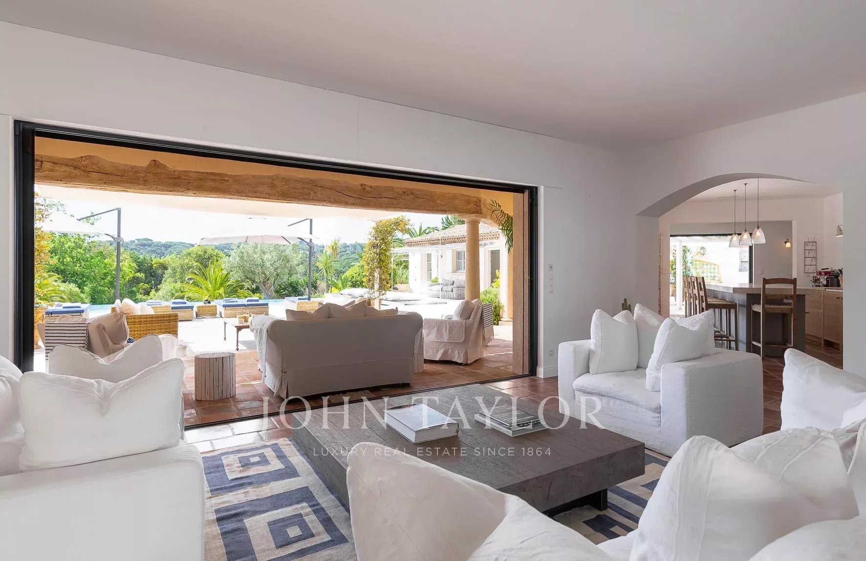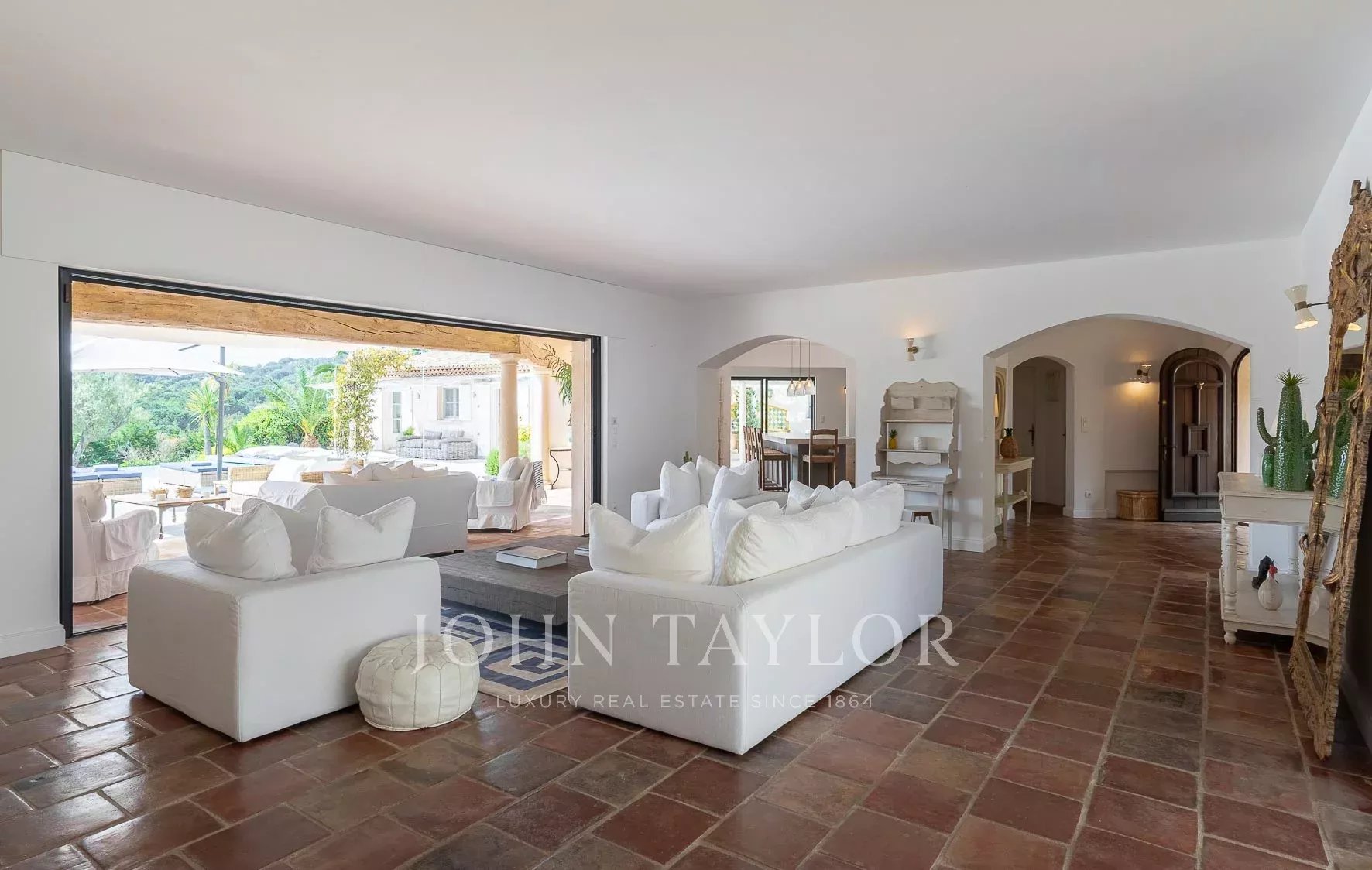 Ein geräumiges Wohnzimmer mit doppelten Öffnungen, die zu einem Innenhof und dem Pool führen.