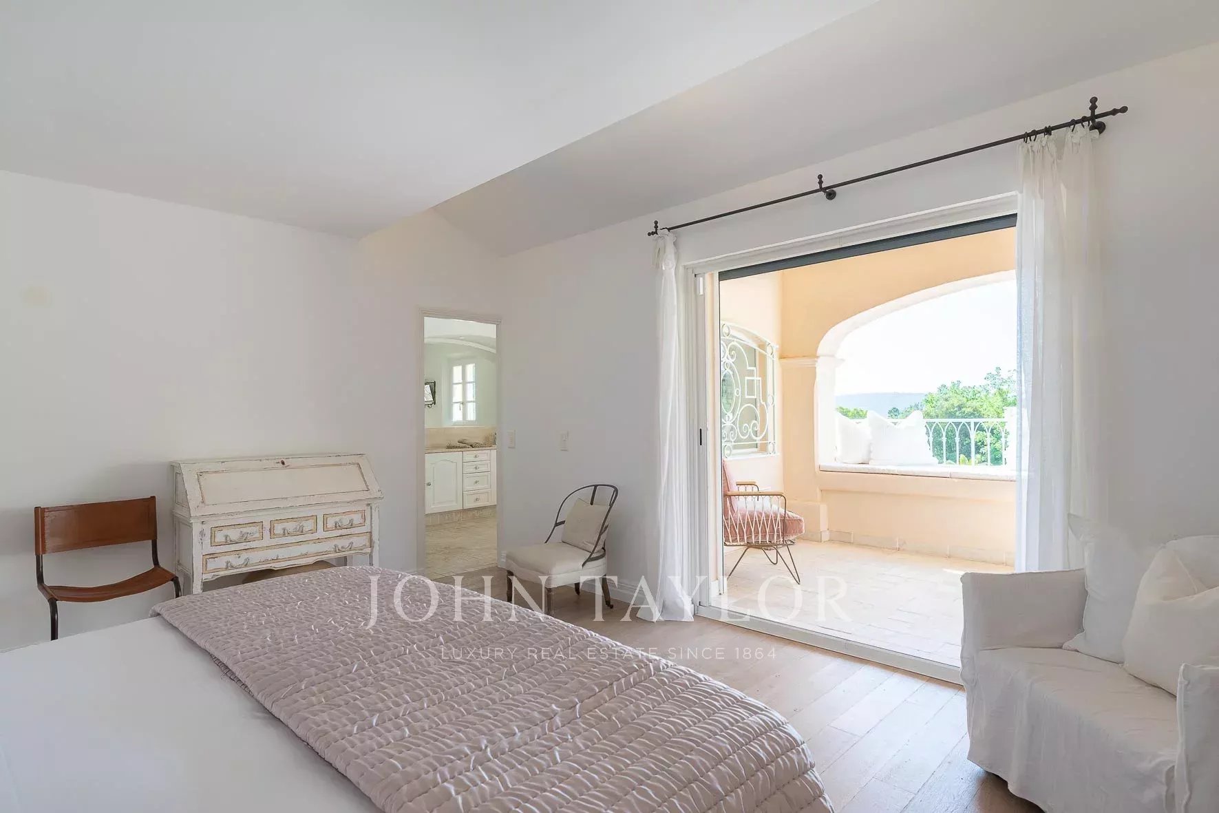 Ein luxuriöses Hauptschlafzimmer mit eigenem Balkon, einem angrenzenden Badezimmer und einem Ankleidezimmer.
