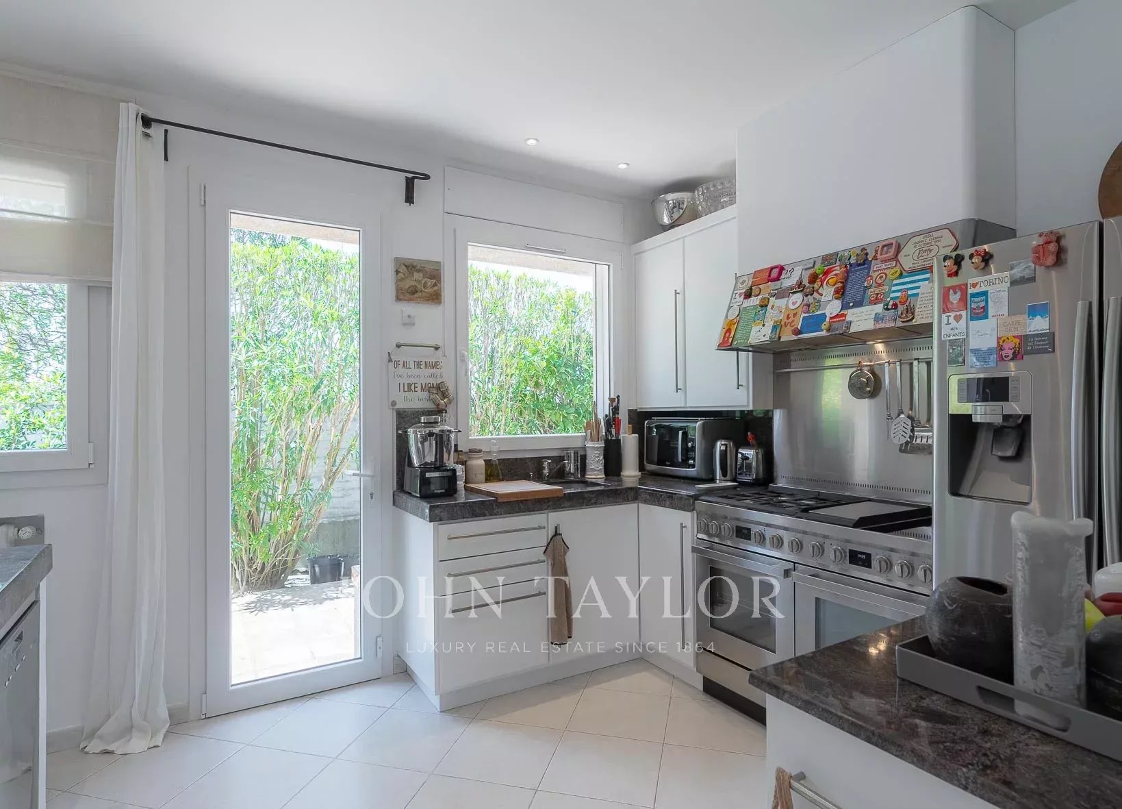 - Eine offene Küche mit Zugang zum Esszimmer und zur überdachten, windgeschützten Terrasse.