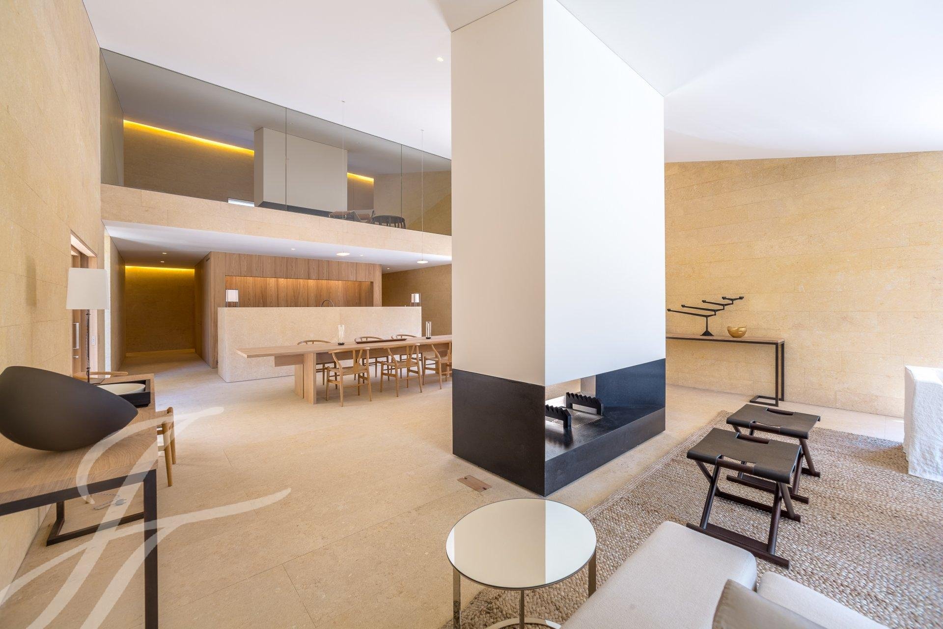 - Ein Wohnzimmer mit Esszimmer, das sich zu einem Innenhof hin öffnet.