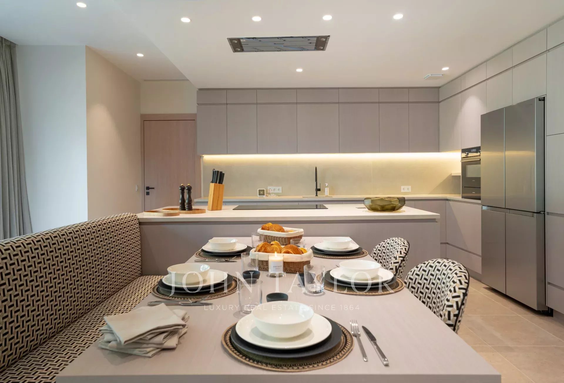 Ein großer Eingangsbereich mit Zugang zu drei Ebenen, ein Wohnzimmer, das sich zu einem Innenhof und einer überdachten Terrasse mit Blick auf den Pool öffnet, ein elegantes Esszimmer, eine voll ausgestattete Küche mit Essbereich und ein Concierge-Bereich mit einem separaten Eingang für das Personal, der eine Küchenzeile und ein Wohnzimmer umfasst.