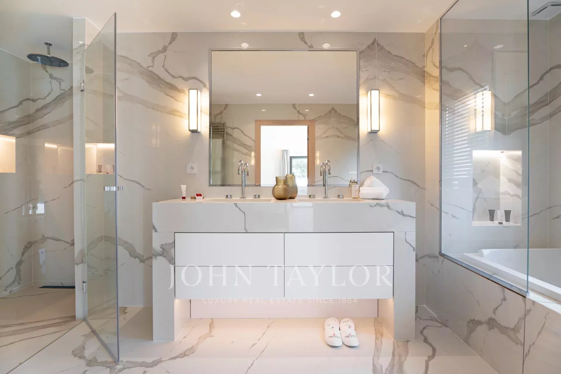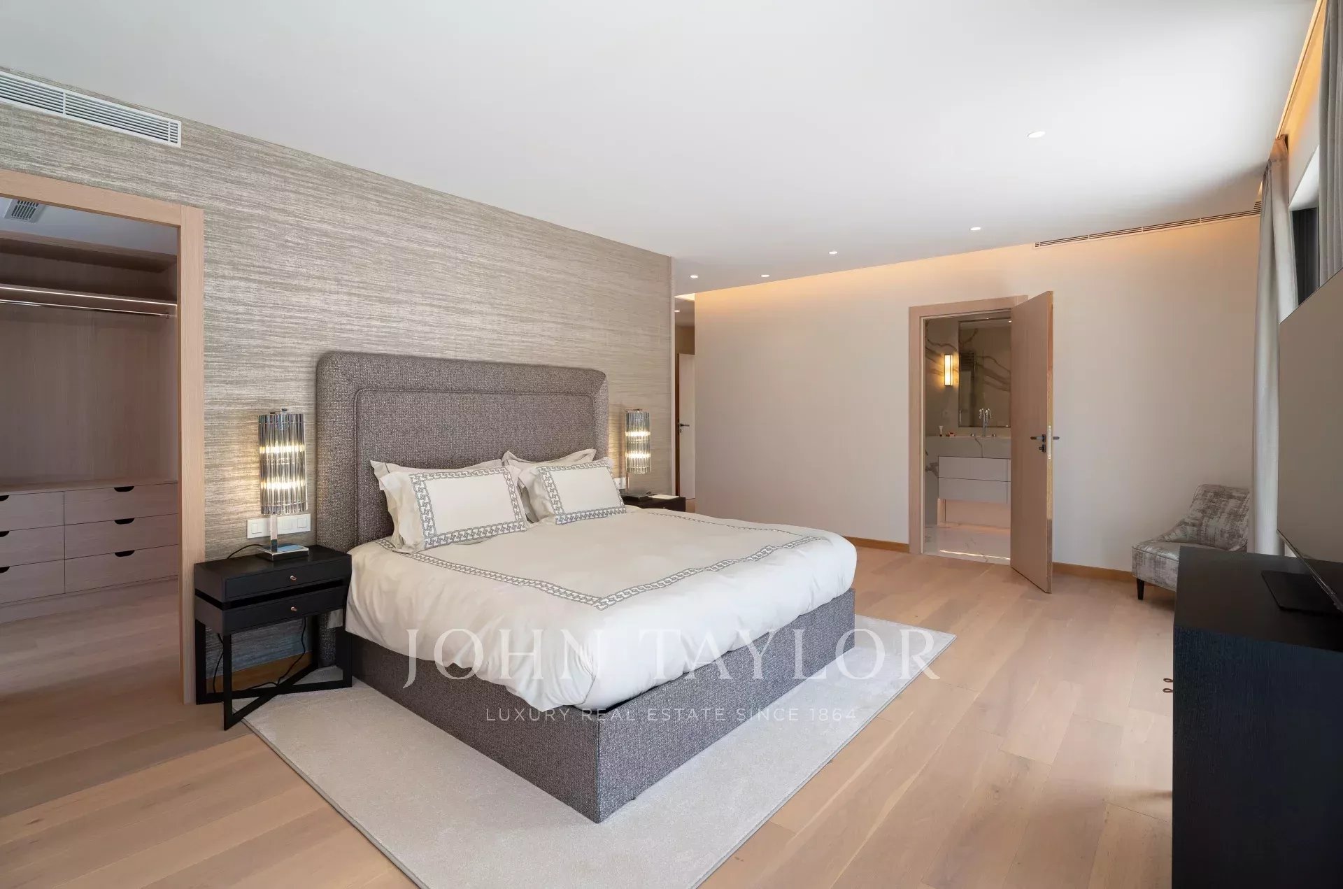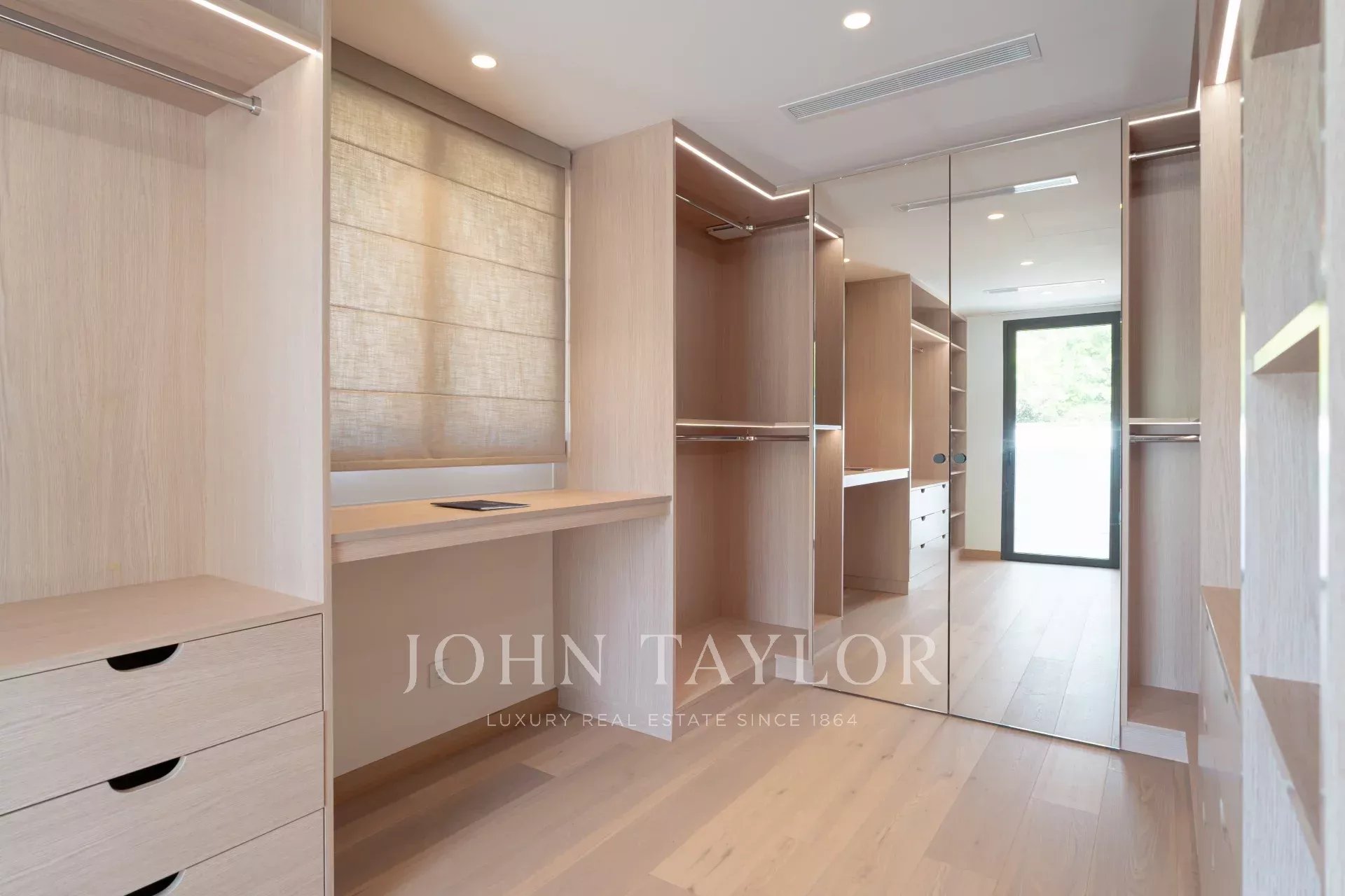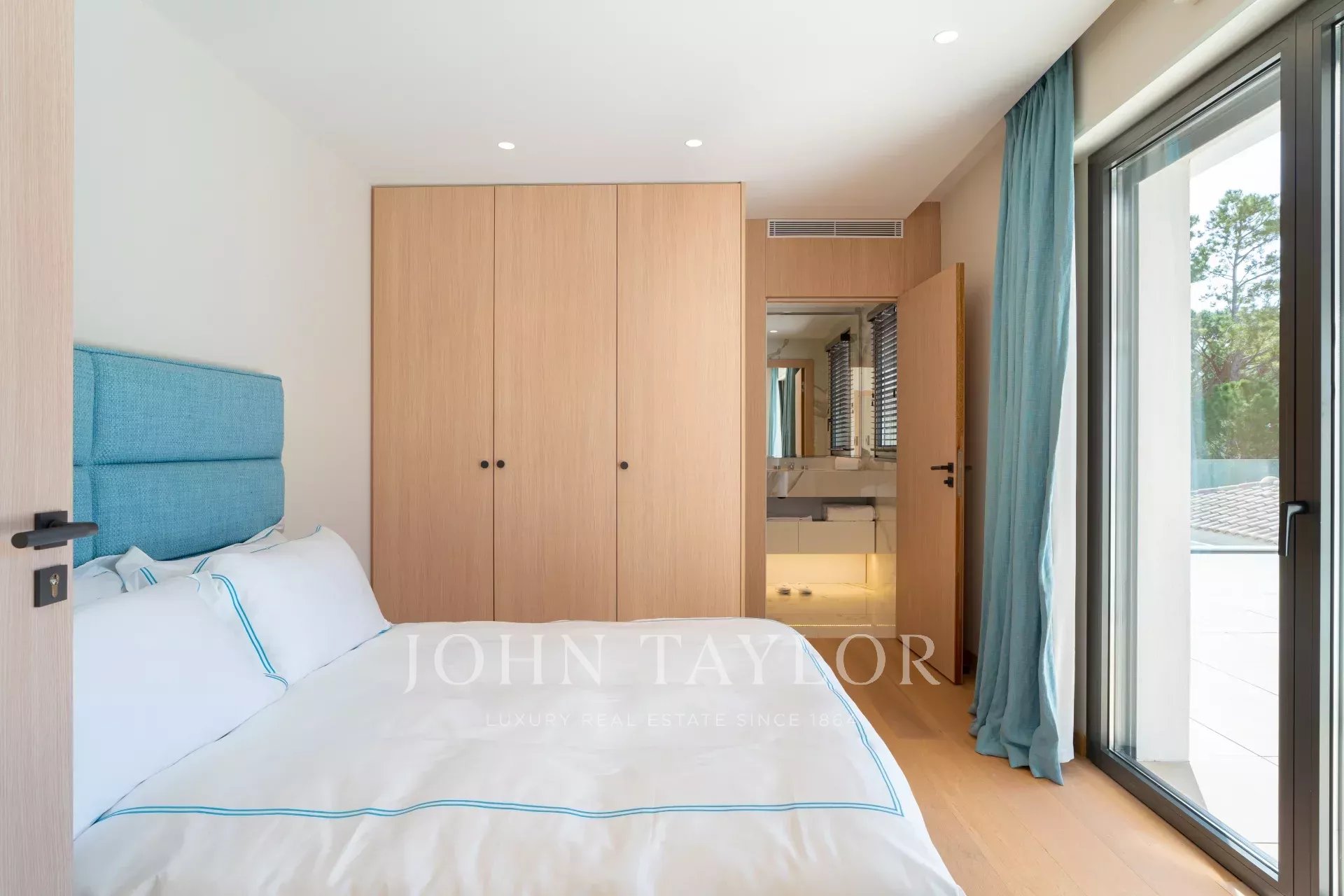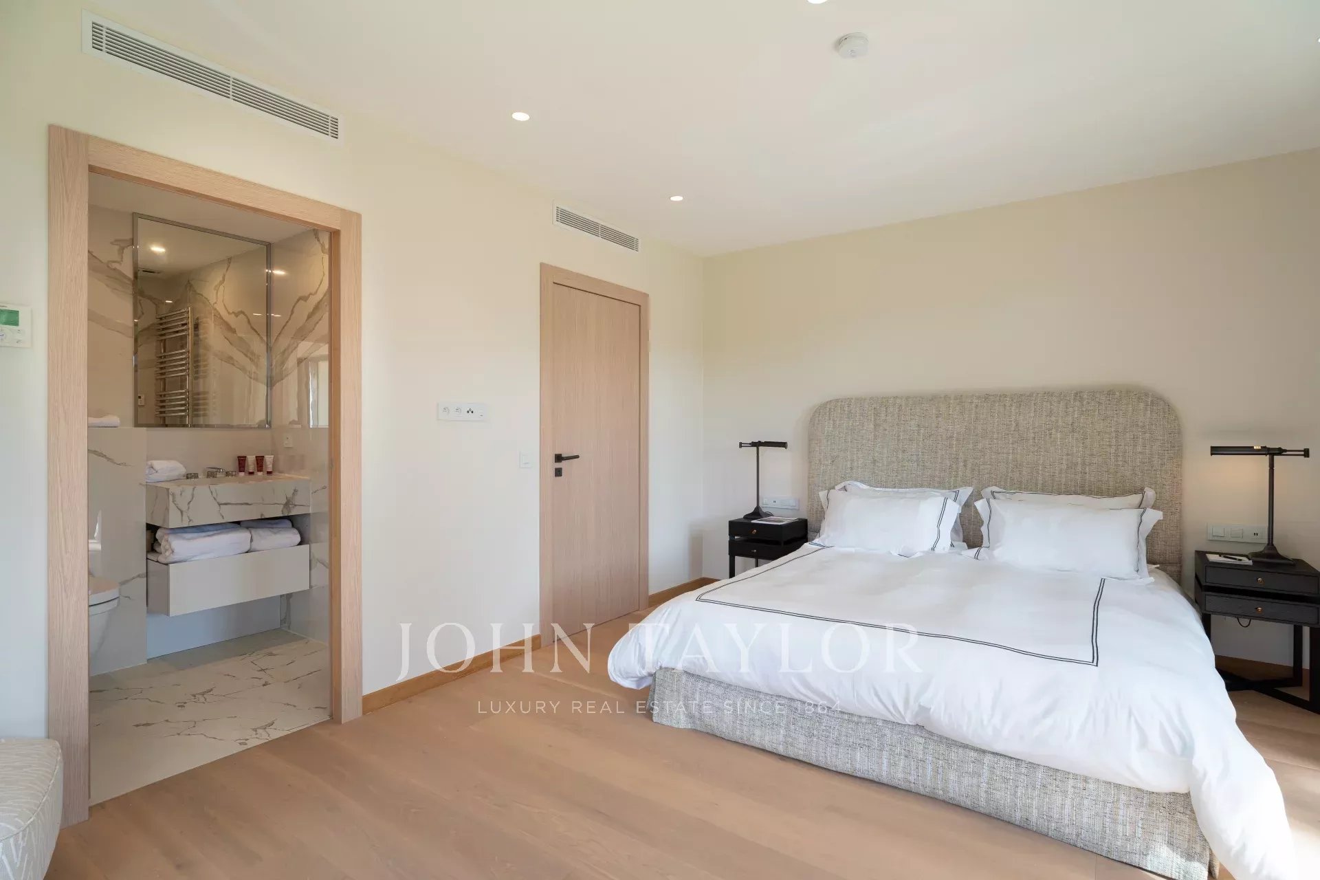 Eine geräumige Mastersuite (Bett/200), Büro, Bad/Dusche/WC und Ankleidezimmer, die sich auf private Terrassen mit Blick auf den Garten und die Pinien öffnet.