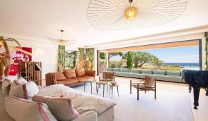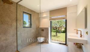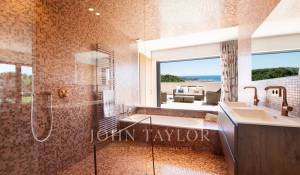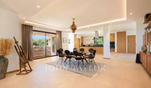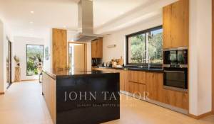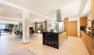 Dieses moderne Haus öffnet sich zu einem großen Wohn- und Essbereich und einer voll ausgestatteten Küche (zwei Geschirrspüler, zwei Kühlschränke, ein Backofen, eine Mikrowelle, Induktionskochfelder, ein Gefrierschrank und alle Küchenutensilien). Ausgestattet mit großen Fenstern, die sich vollständig öffnen lassen, bietet das Wohnzimmer einen atemberaubenden Blick auf den Garten und das Mittelmeer.